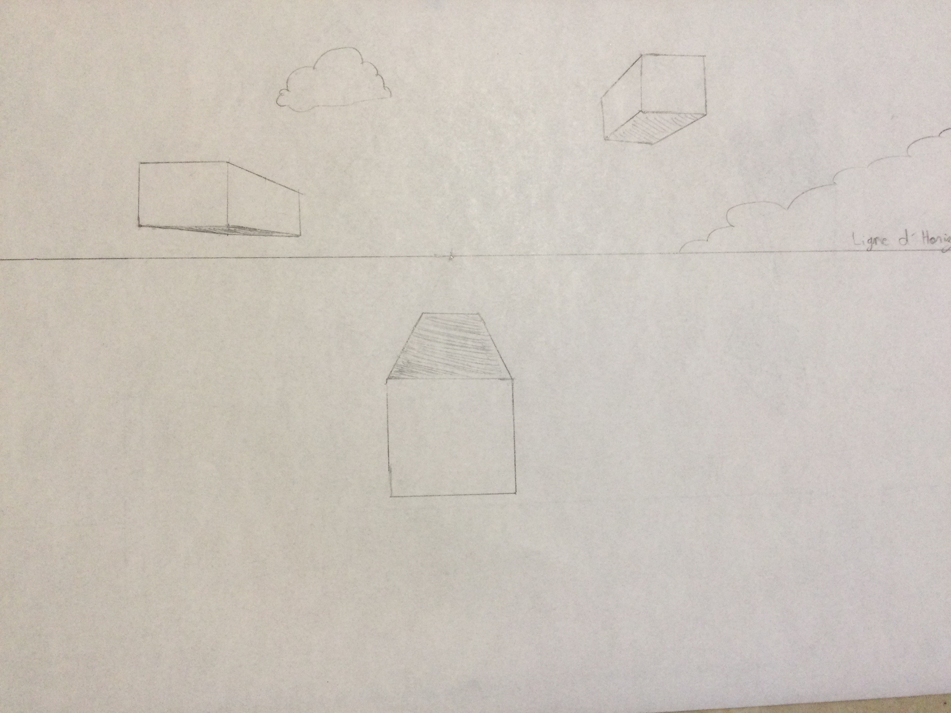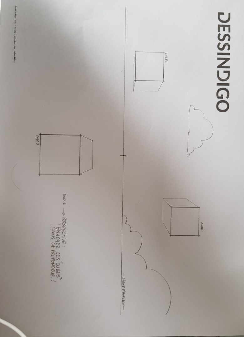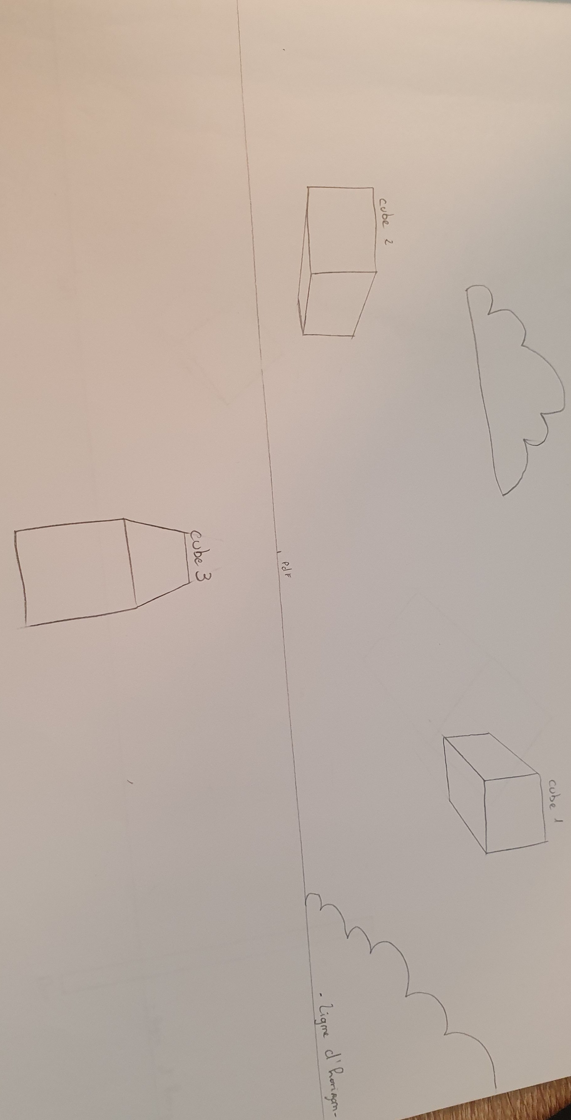 Boisoir, voici le premier exercice. J'ai un peu bugé... J'ai pas pris en compte le mot "cube" donc arrêt de la perspective n'importe où :) ET,... magnifique, J'ai également fait la perspective aux nuages...