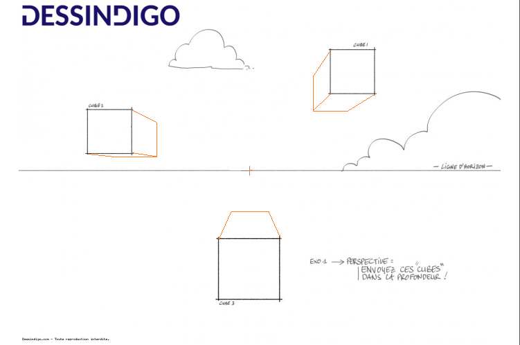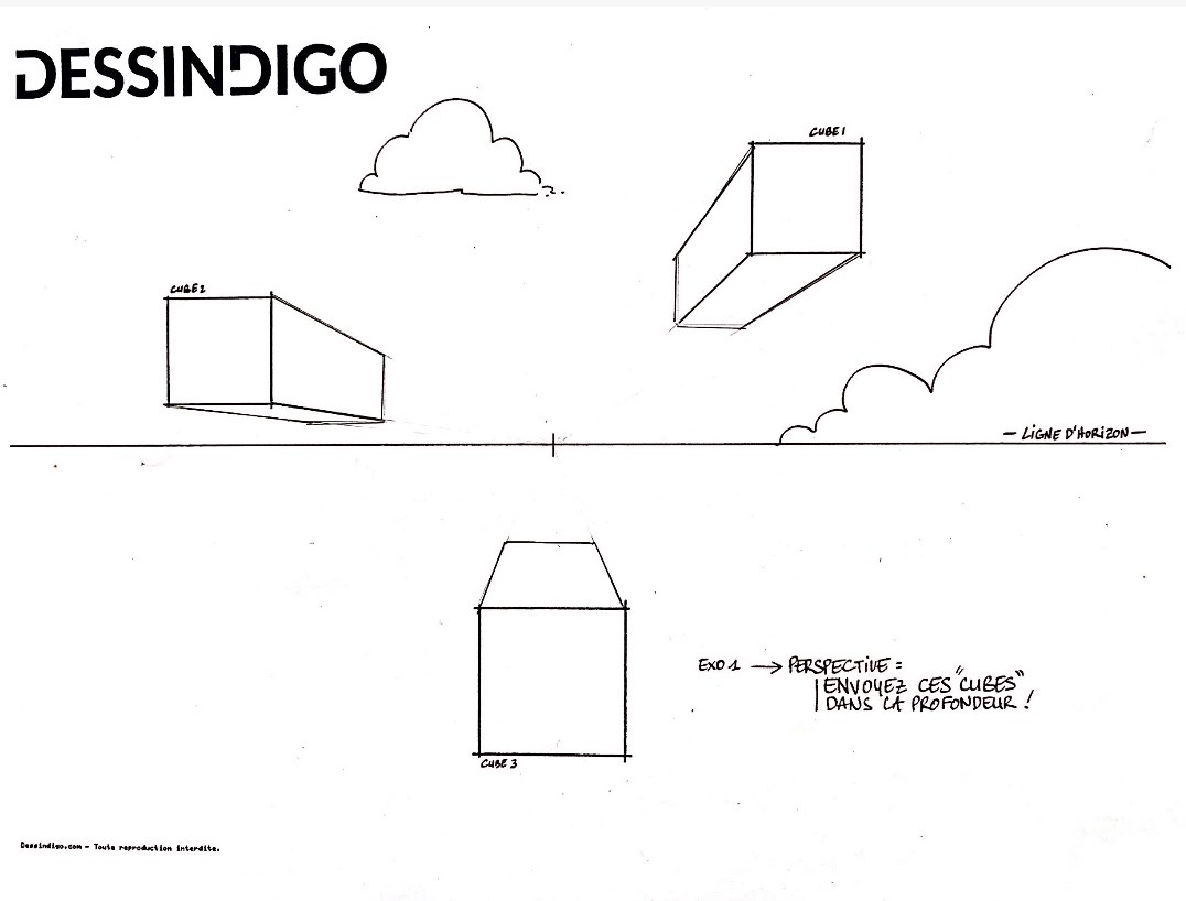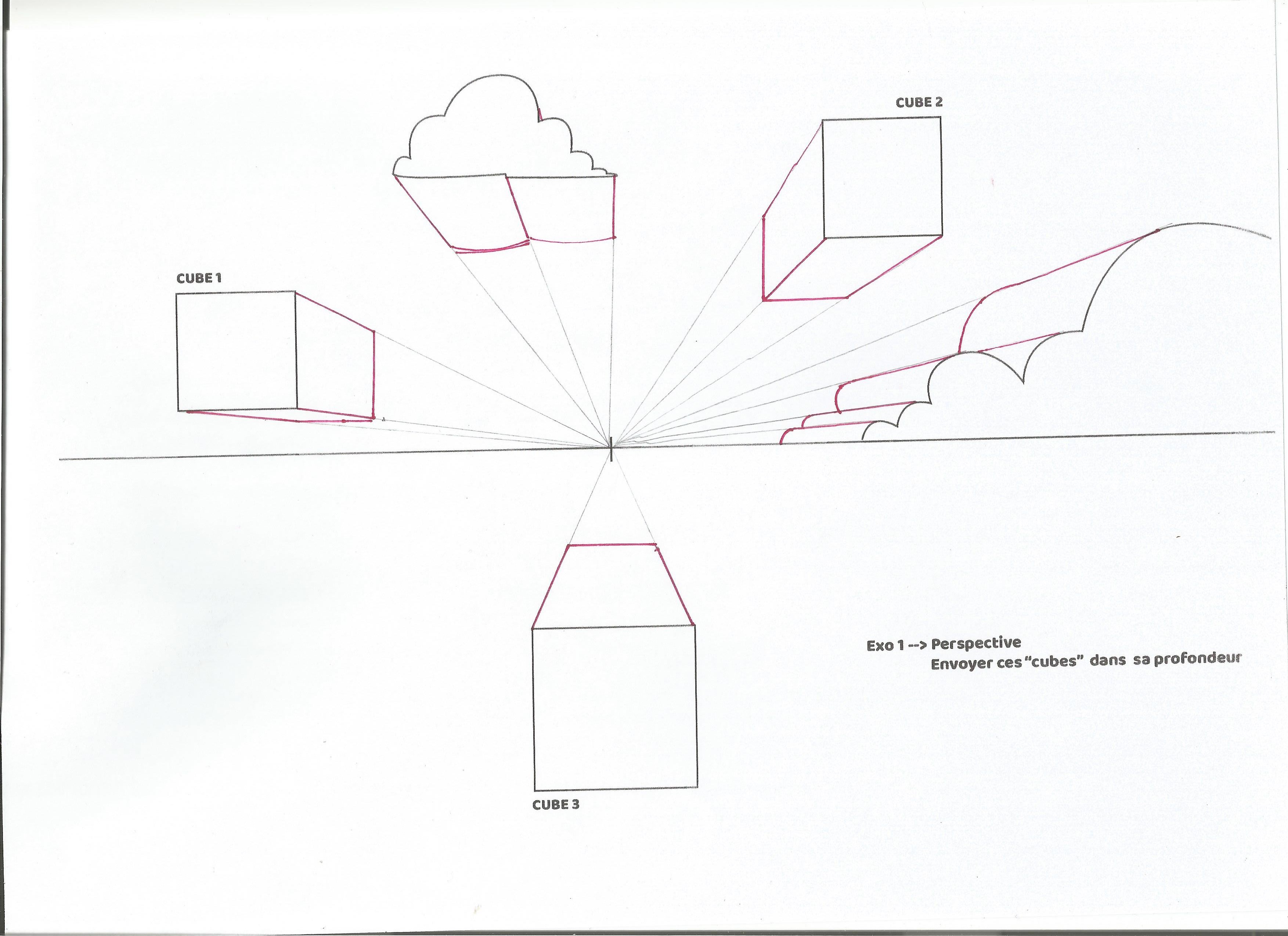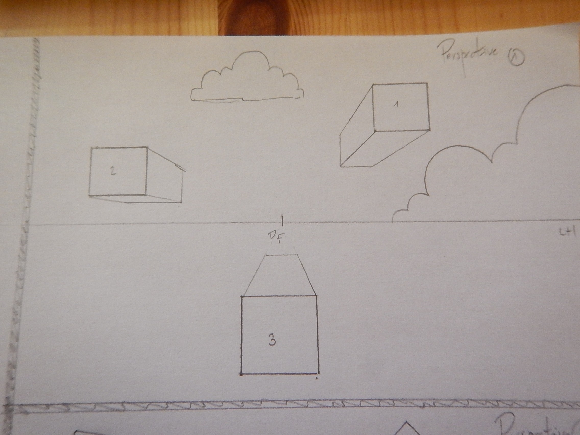 Boisoir, voici le premier exercice. J'ai un peu bugé... J'ai pas pris en compte le mot "cube" donc arrêt de la perspective n'importe où :) ET,... magnifique, J'ai également fait la perspective aux nuages...