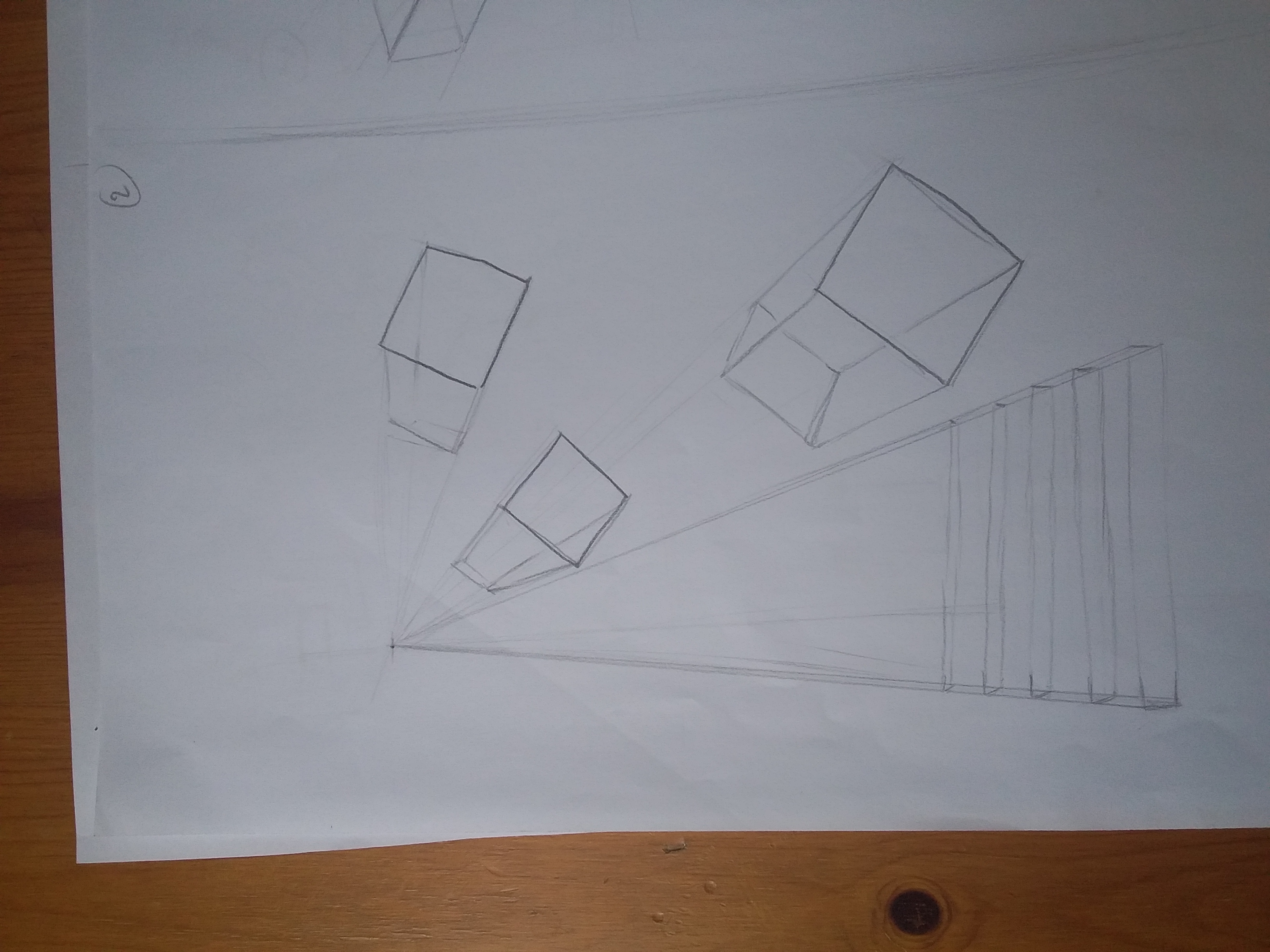Bonsoir Kellyvaes, c'est bon pour les lignes de fuites, mais fait attention aux lignes parallèles de tes cubes! Sinon, tu as oublié de faire le mur en perspective sur la droite, mais c'est du beau boulot! 😉