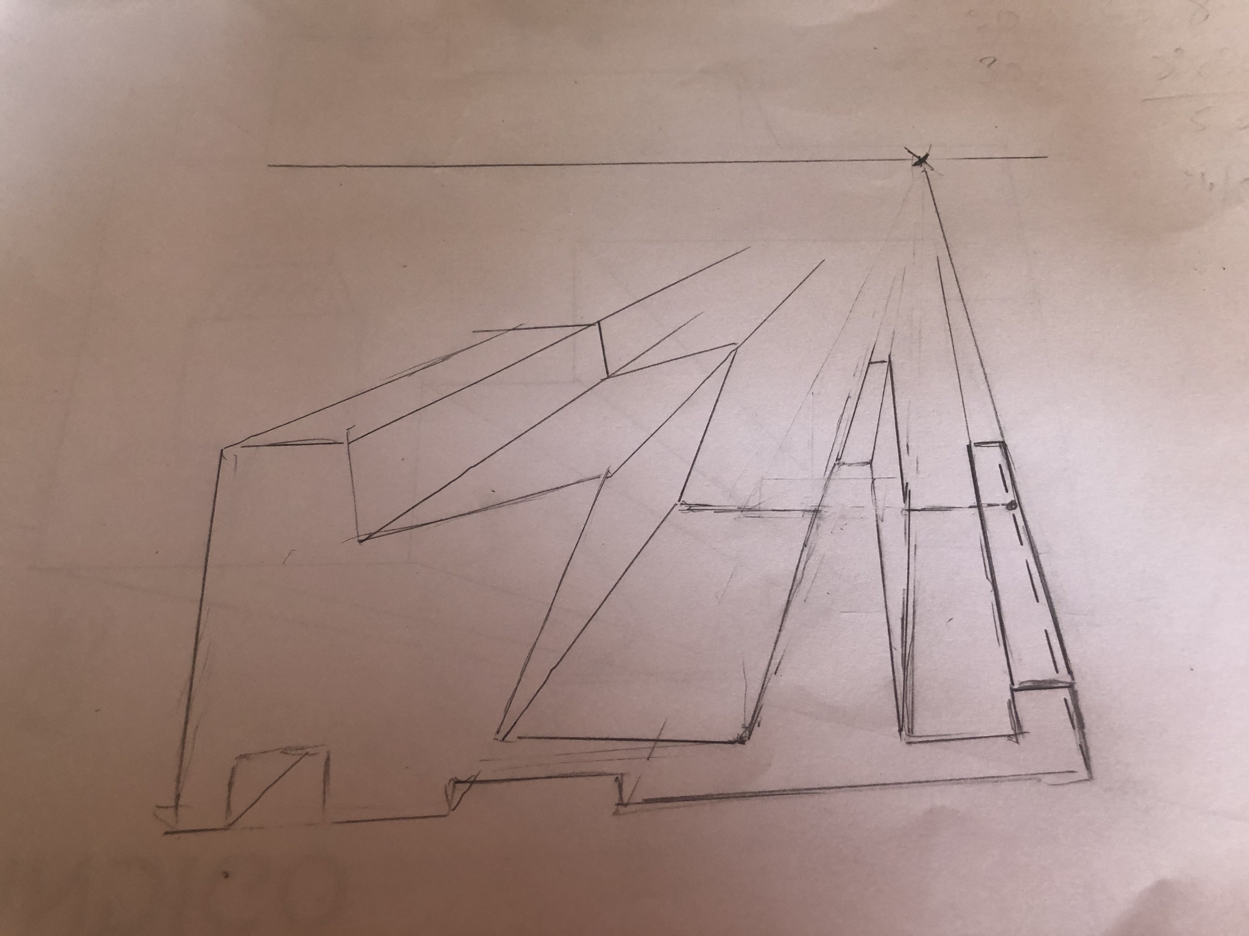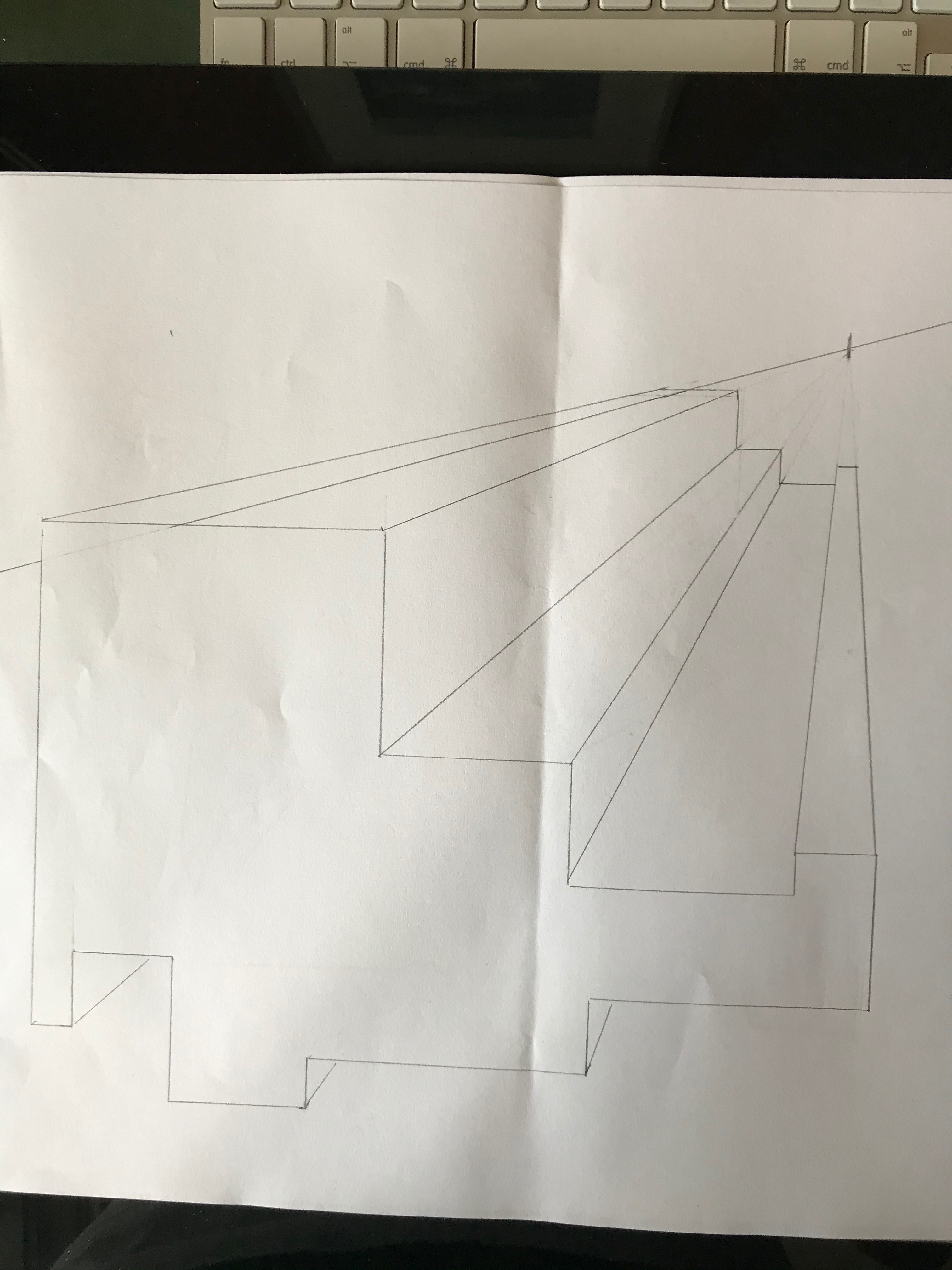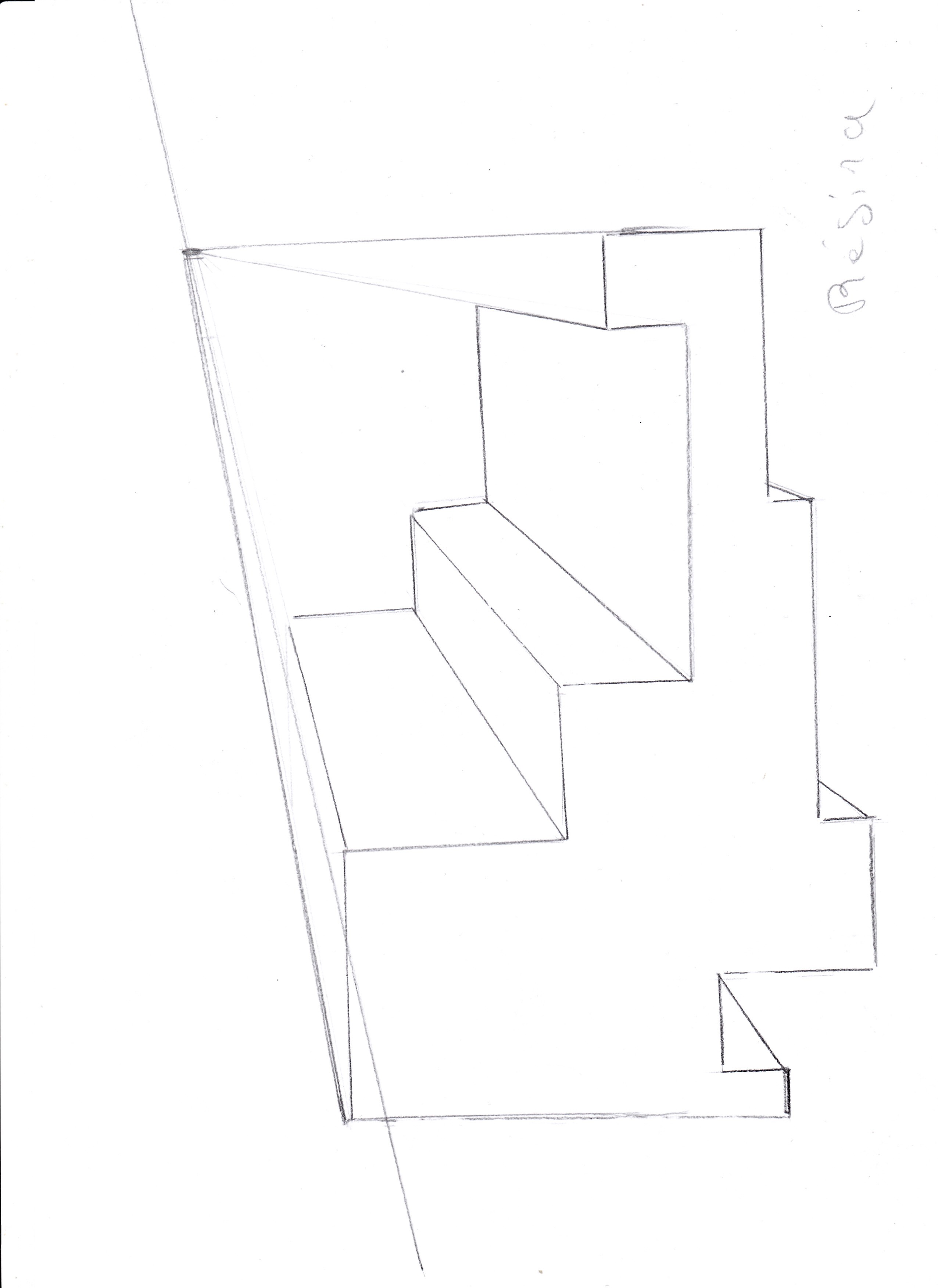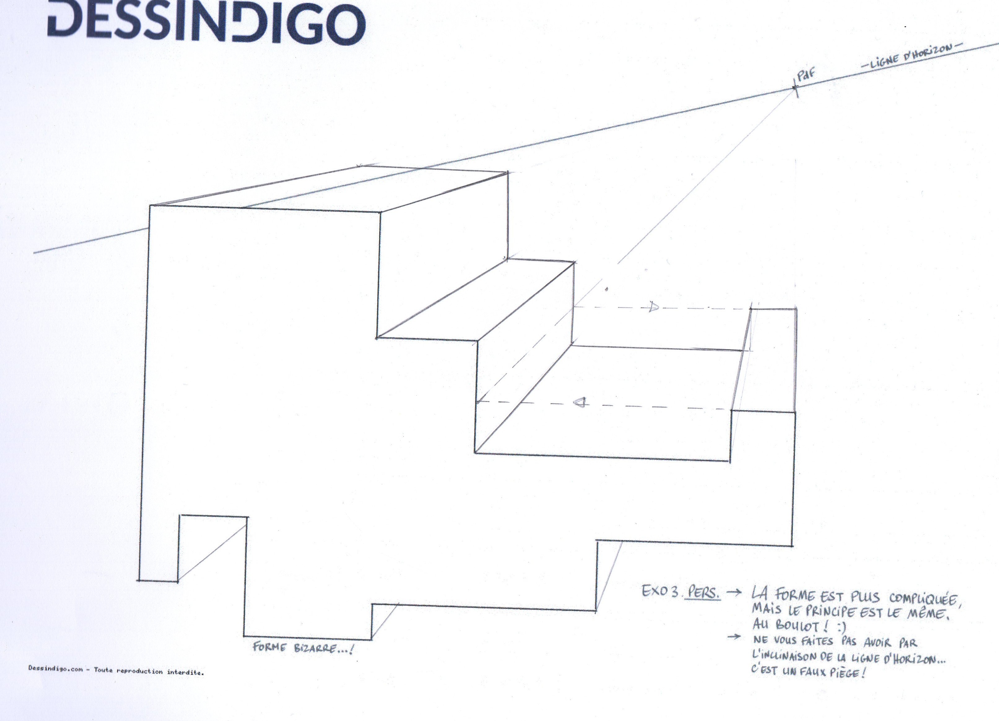 Bonjour, pour trouver où couper le dernier bout à droite de la forme, on peut projeter la hauteur de la face avant sur le « mur » en face à gauche, puis trouver le point de fuite sur l’autre bord extérieur, et avec la parallèle au bord de l’objet avoir la bonne hauteur du rebord.