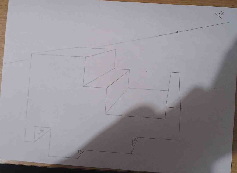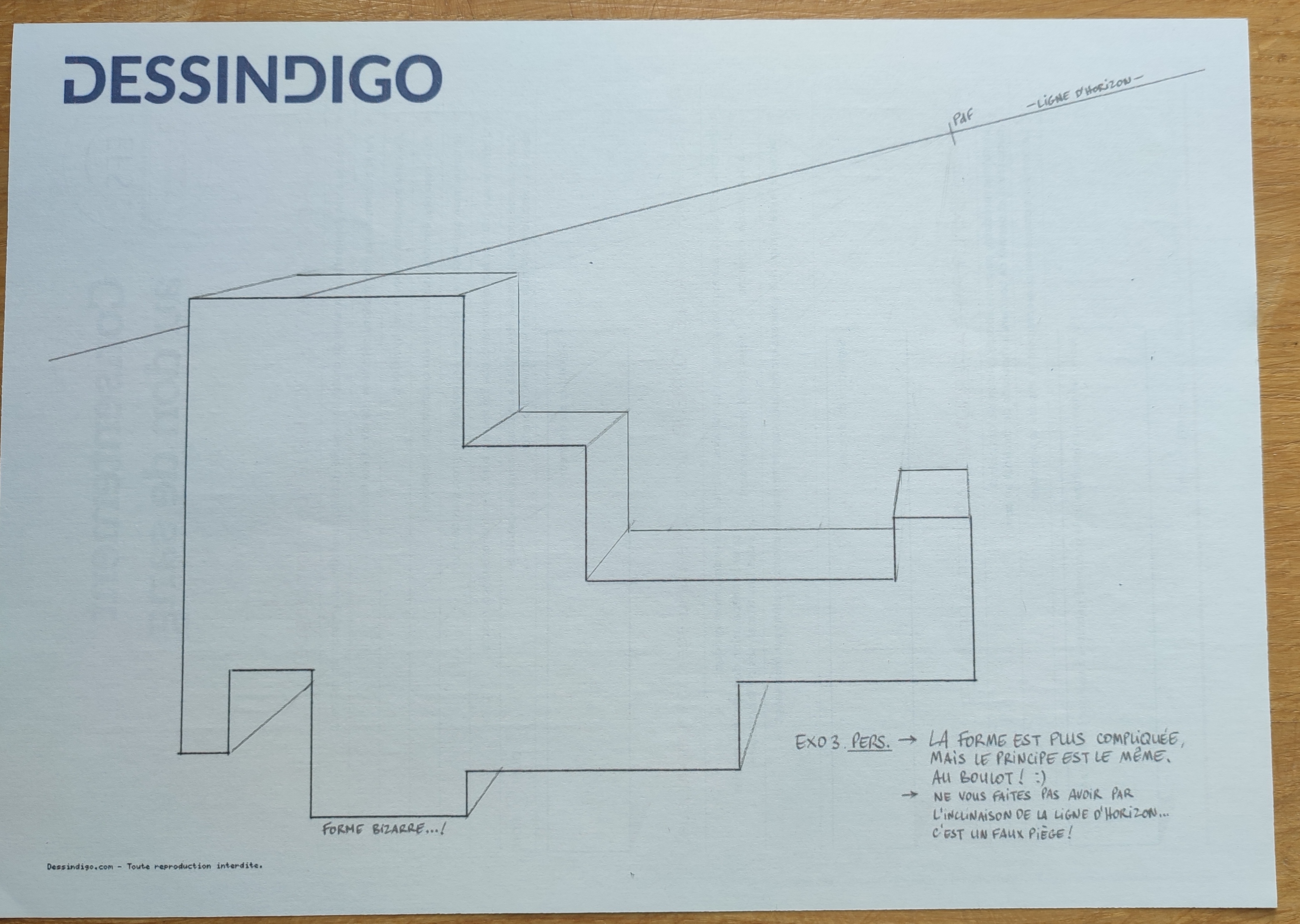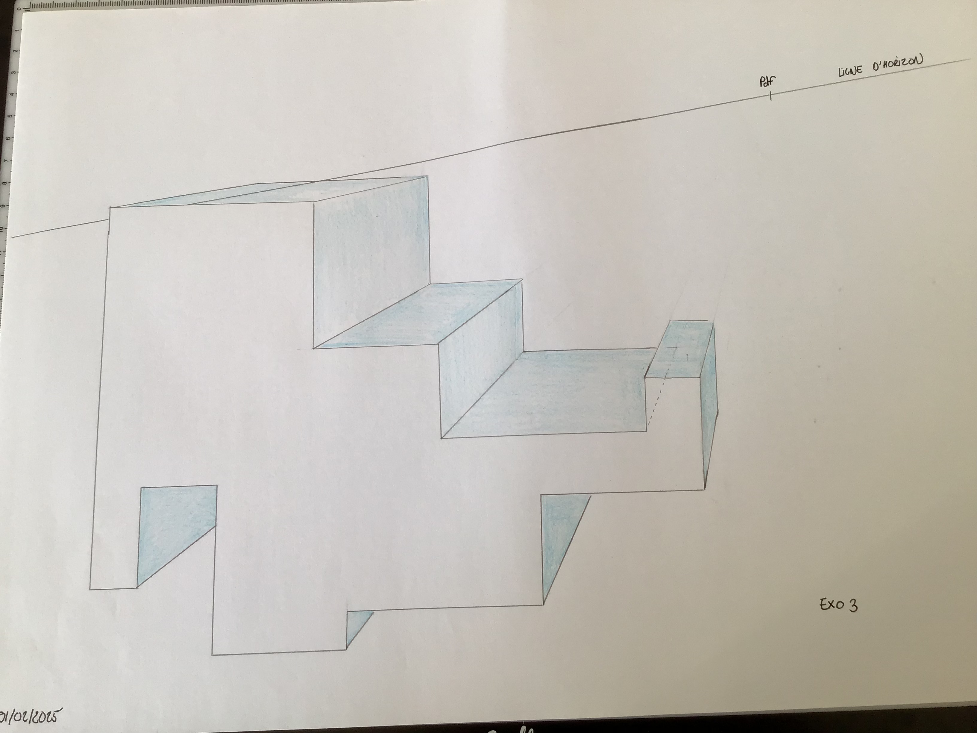 Bonsoir Densie, c'est très bien, je n'ai pas grand chose à redire... Attention sous certains angles de perspectives aux faces qui peuvent apparaître très légèrement, comme pour le cube en haut à droite sur l'exercice du haut. Sinon, tu as oublié de fermer une partie de la forme de l'exercice du milieu, il faut pour ça poursuivre la ligne de fuite correspondante pour en tirer ensuite la verticale qui t'aidera à fermer ce côté. ;)