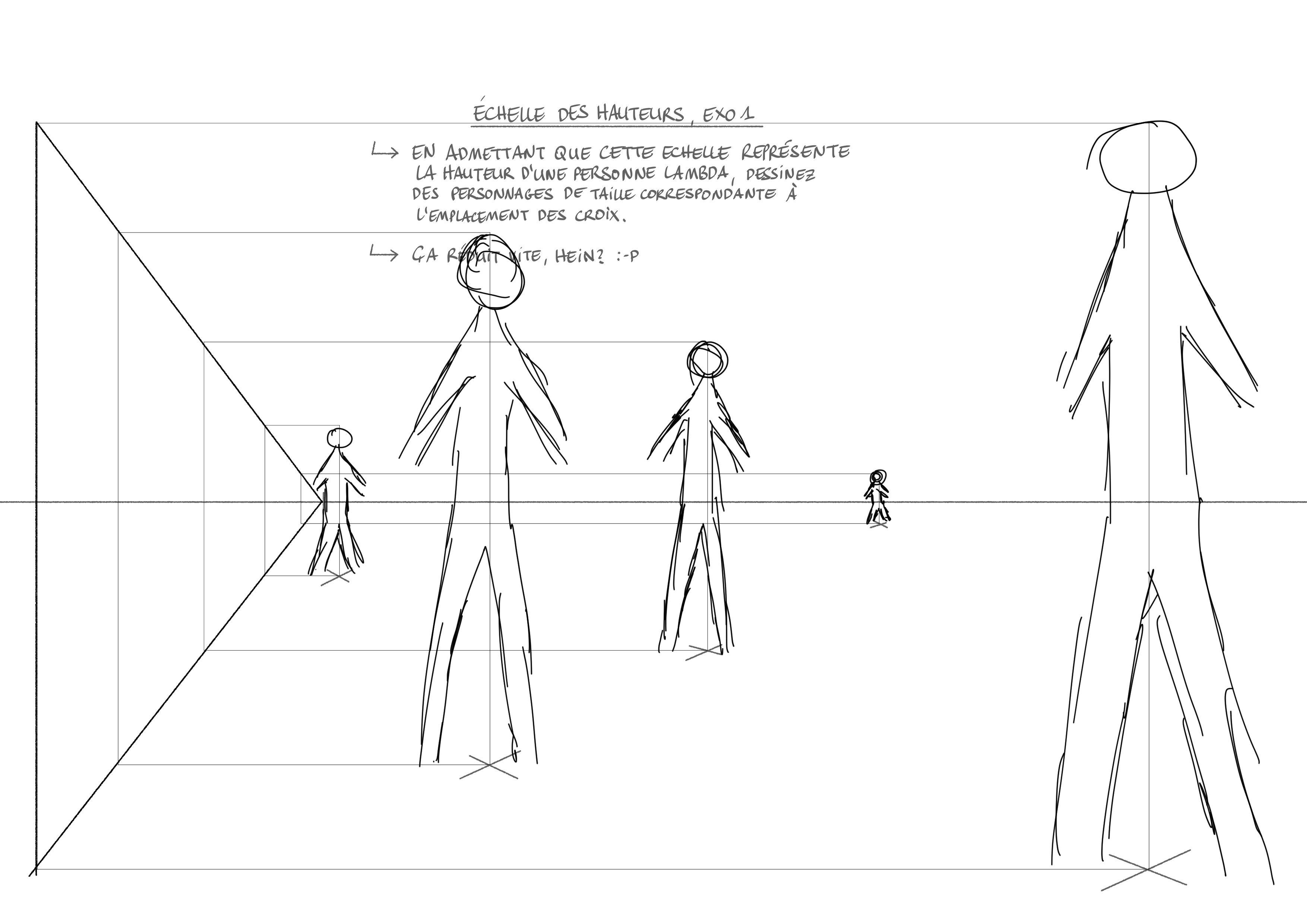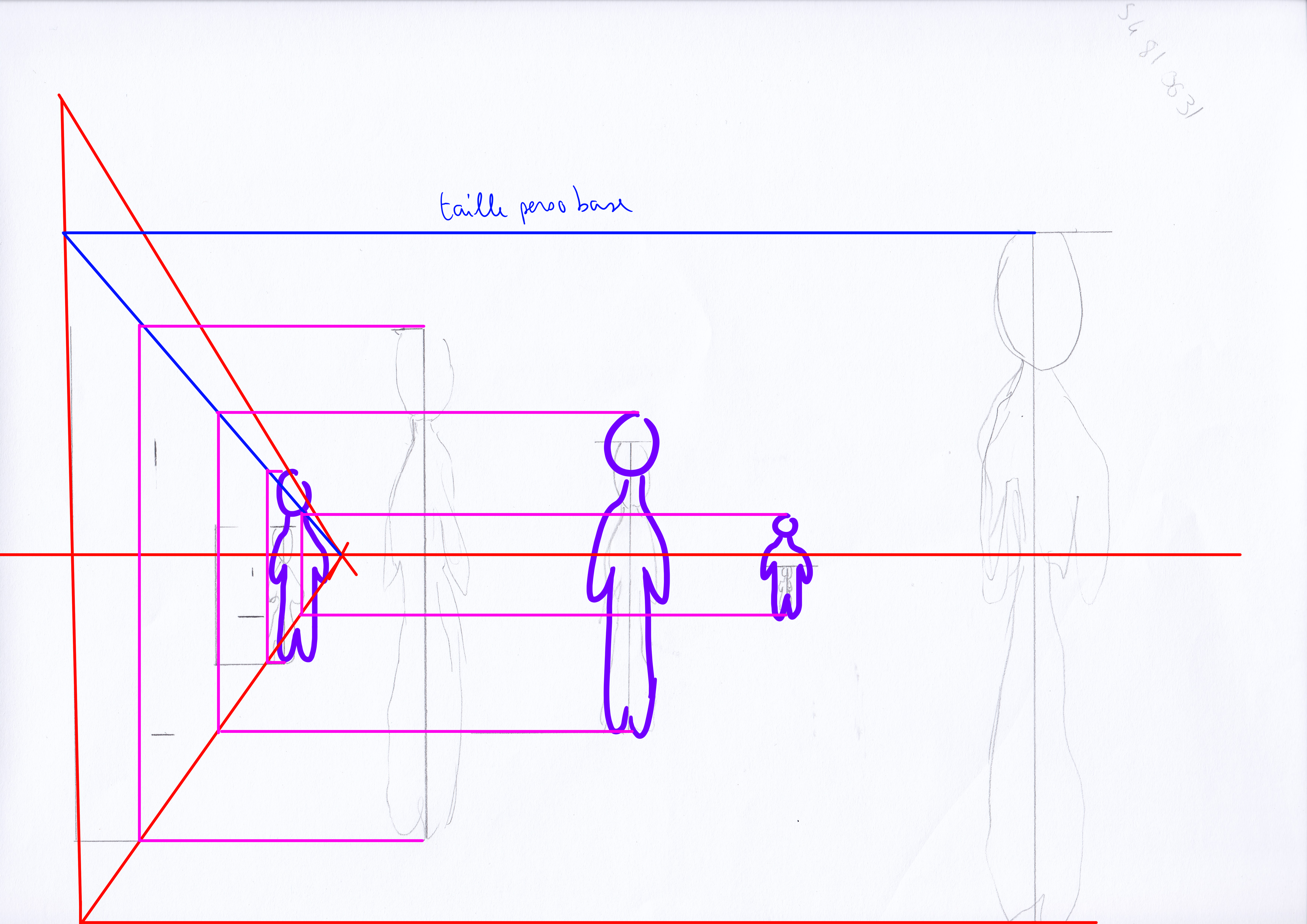 Pas besoin de jolis persos ^^ Par contre j'ai du mal à corriger car je ne vois pas ton échelle des valeurs, ce par rapport à quoi tu dois faire tes hauteurs. Sur quoi se basent tes repères ? Il faut une ligne d'horizon, et un point de fuite pour faire l'échelle des hauteurs. J'ai donc corrigé en plaçant la ligne d'horizon au milieu de ton personnage de base, créant une échelle des hauteurs dont je me suis servie pour reporter la hauteur du 1er personnage de base dans la distance (en bleu). En rose j'ai reporté les hauteurs par rapport à cette taille là. Est-ce que c'est mieux compris ?