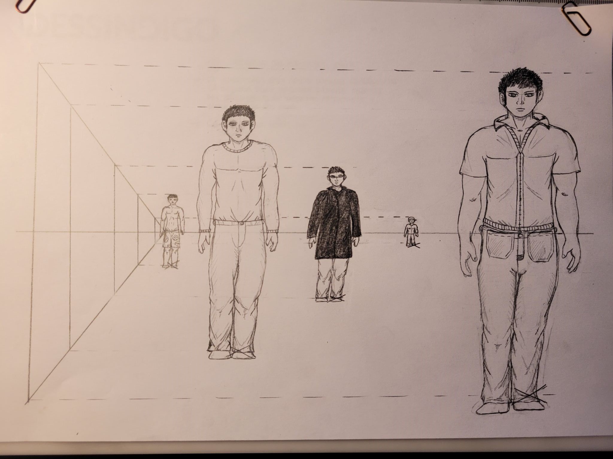 Et voici mon exo sur les personnages en perspective. Je n'ai pas cherché à faire des personnages détaillés, juste essayé de garder les proportions de mon personnage.