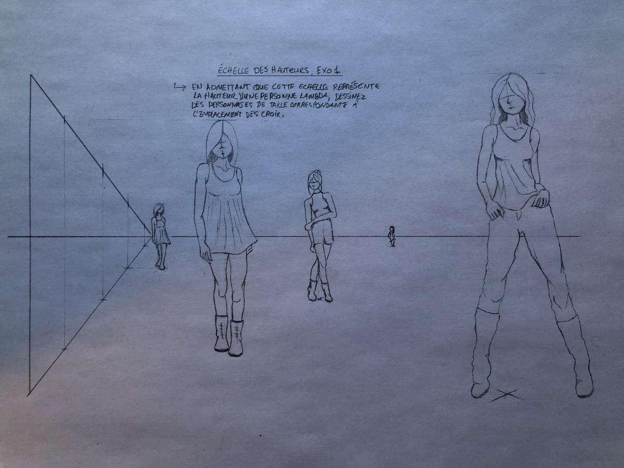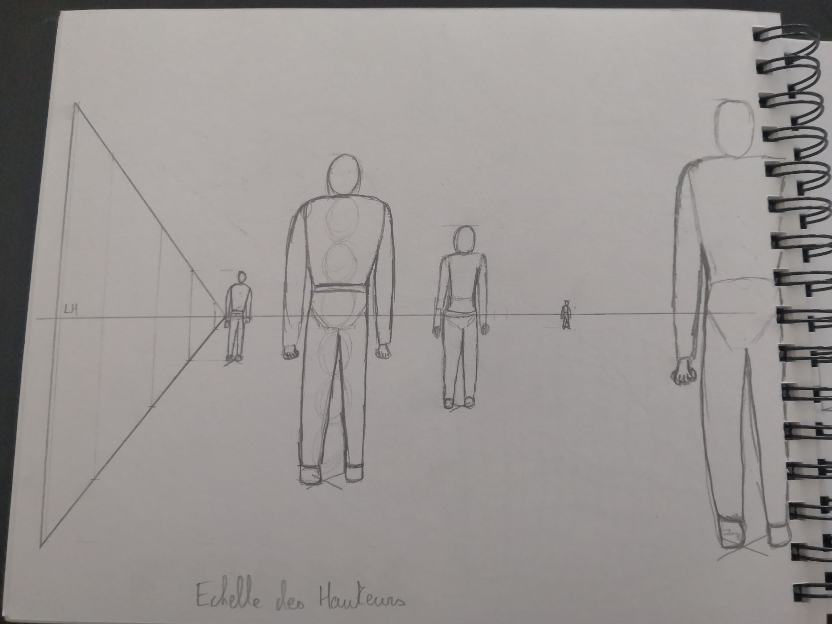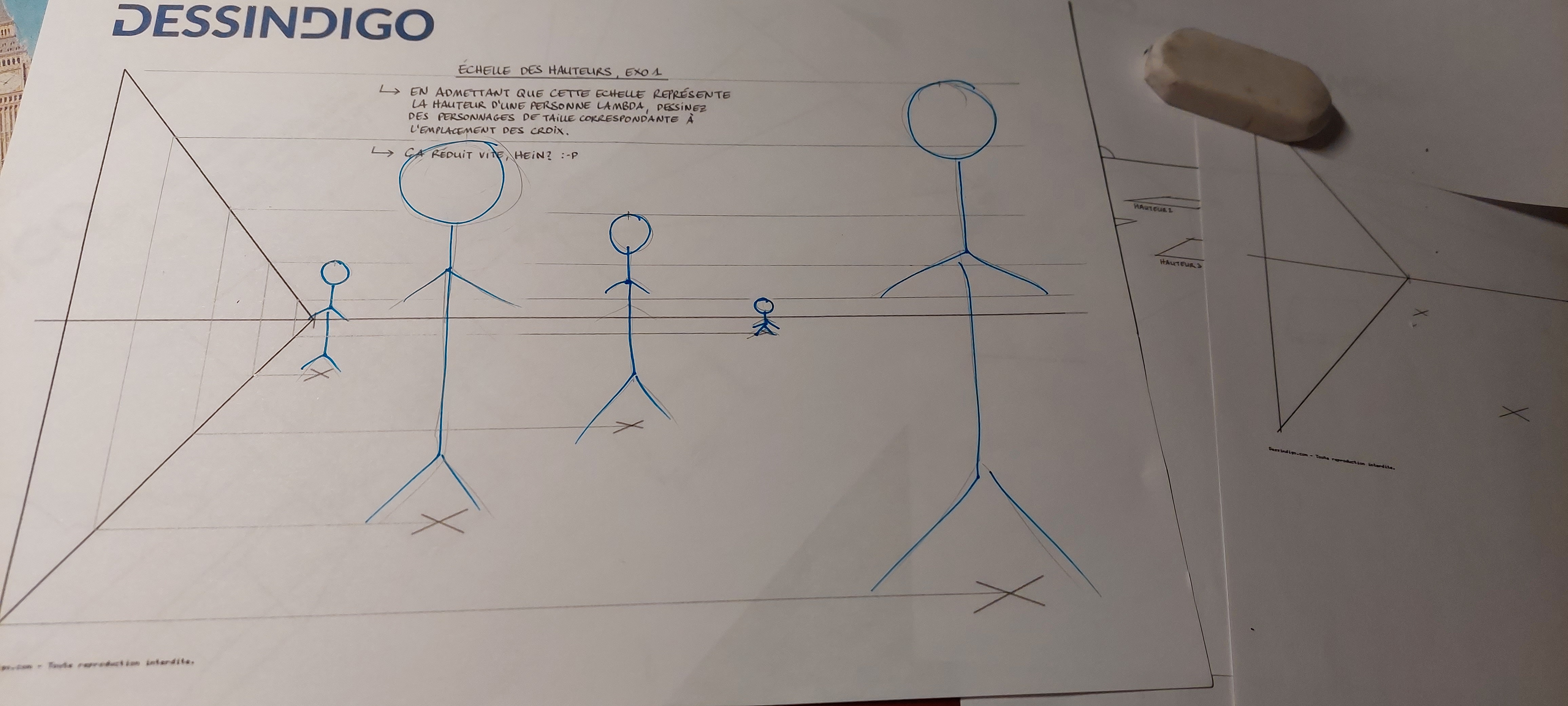 Bonjour, voici mon exercice sur l'échelle des hauteurs avec les personnages. J'ai beaucoup de difficulté avec la position des corps humains. Merci pour votre retour.