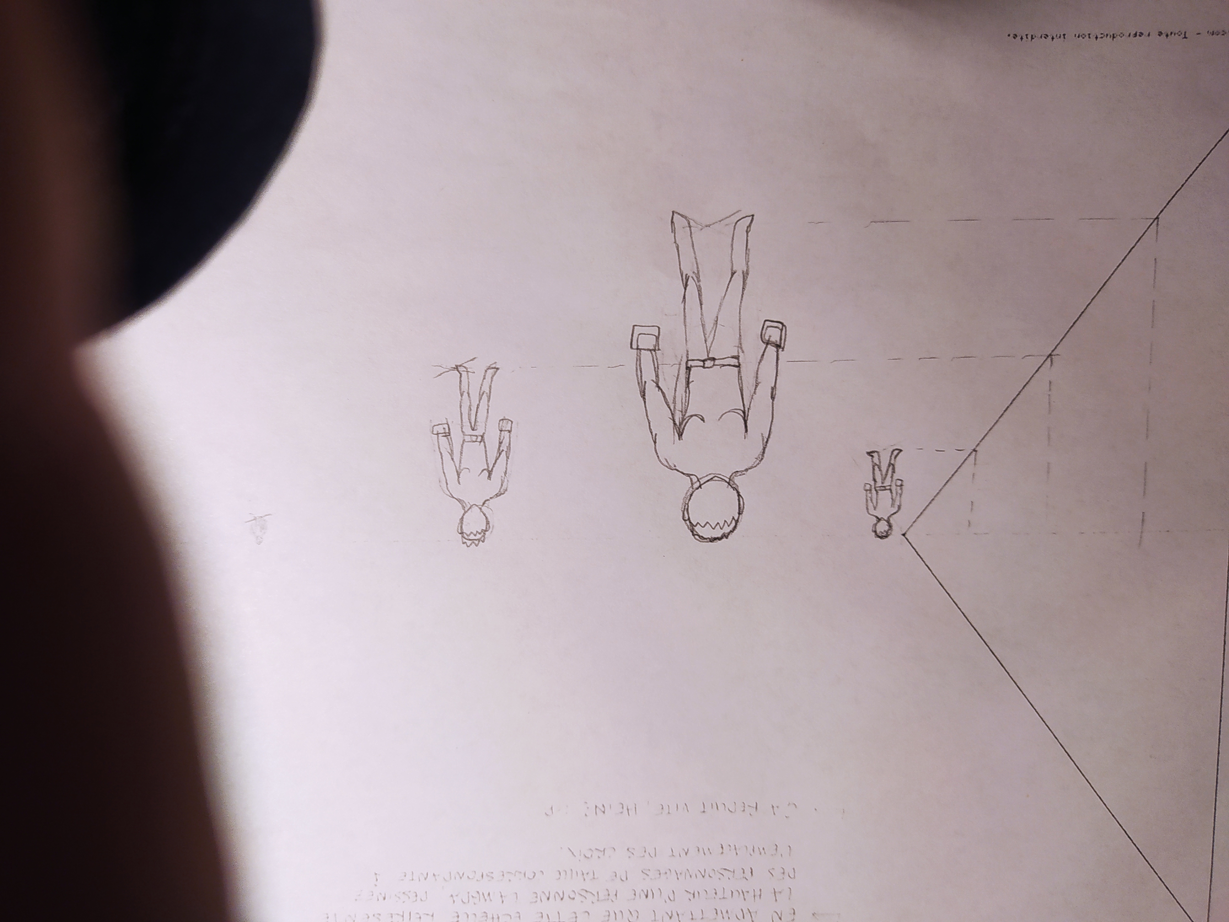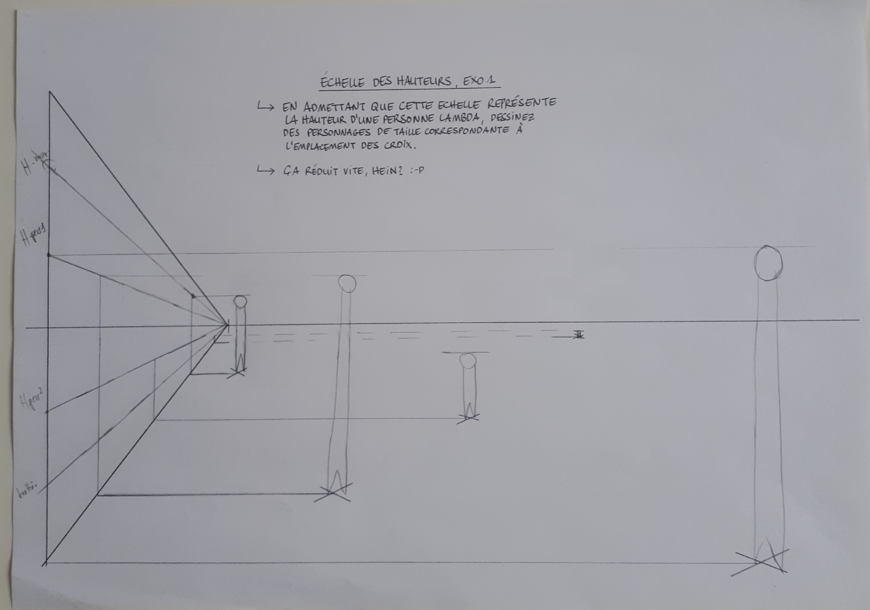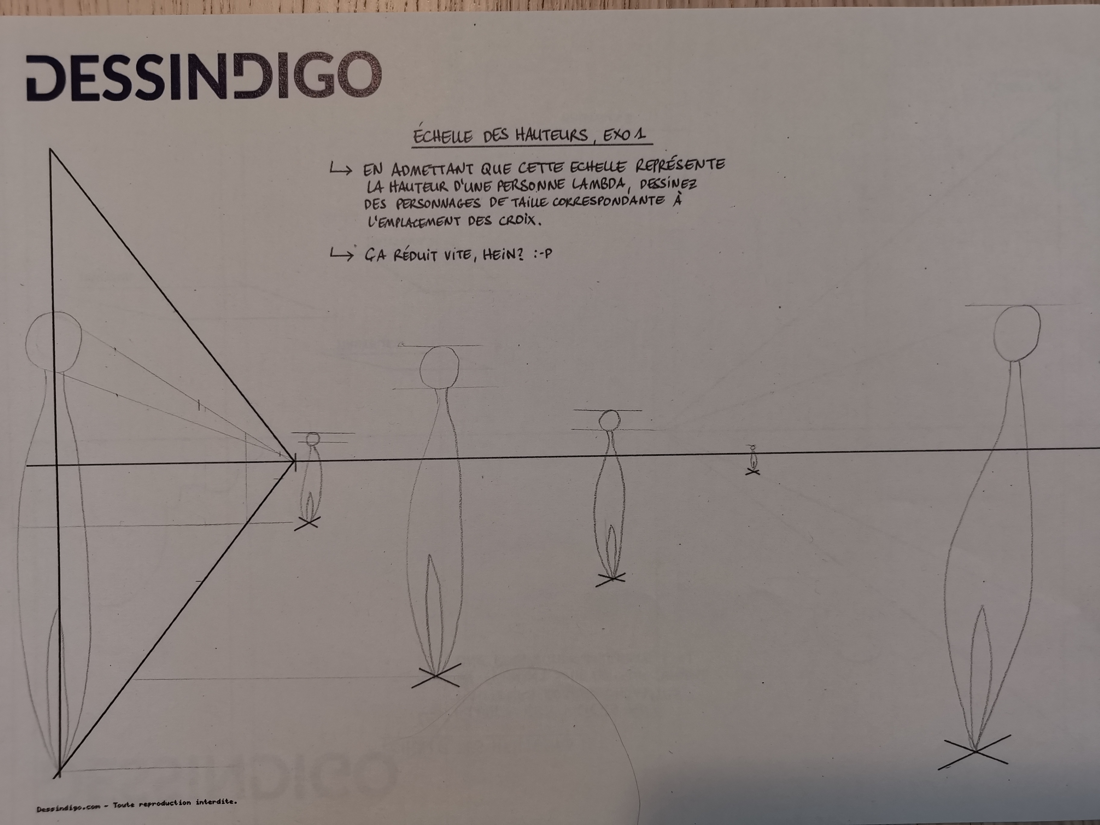 Bonjour, voici mon exercice sur l'échelle des hauteurs avec les personnages. J'ai beaucoup de difficulté avec la position des corps humains. Merci pour votre retour.