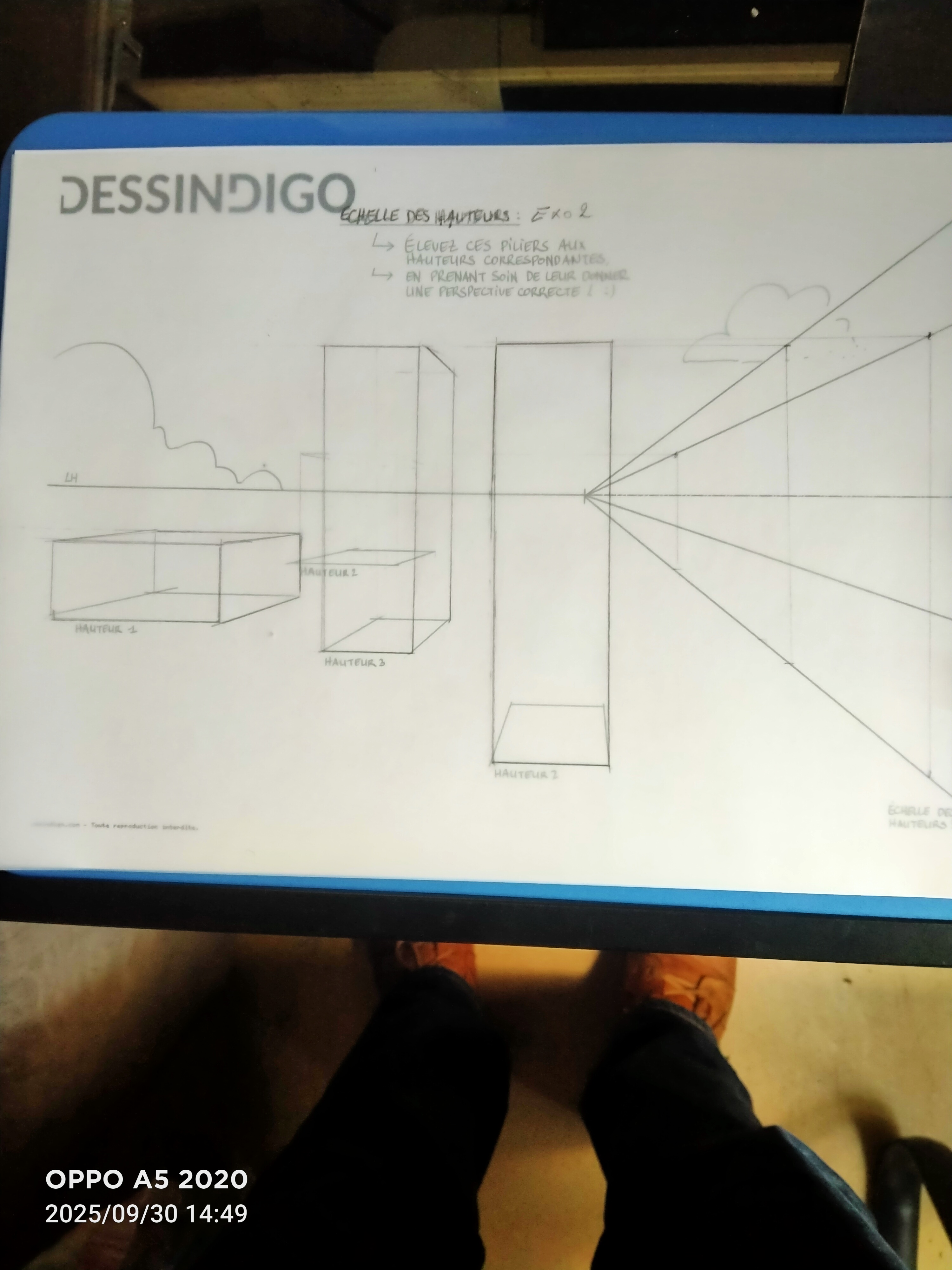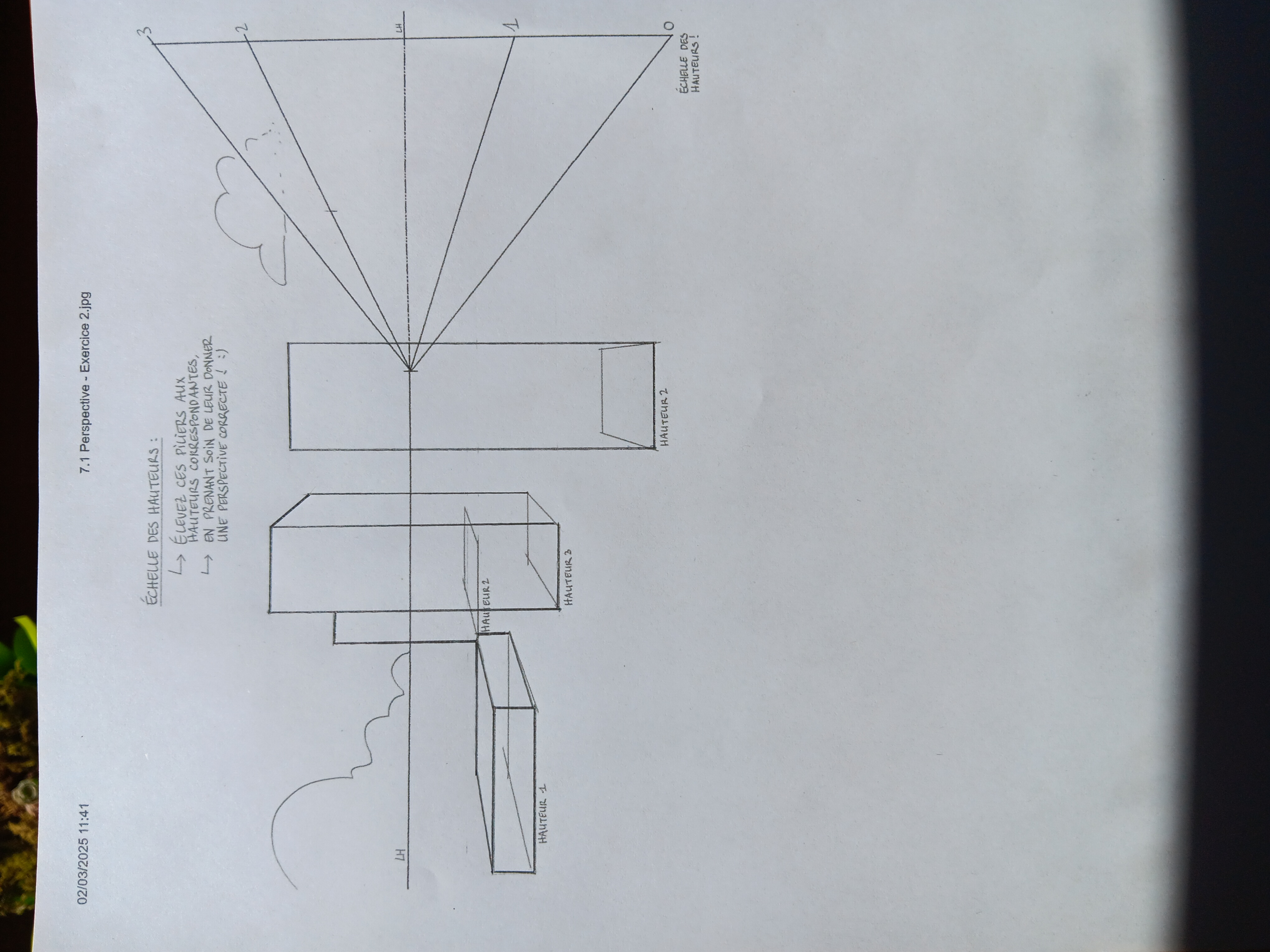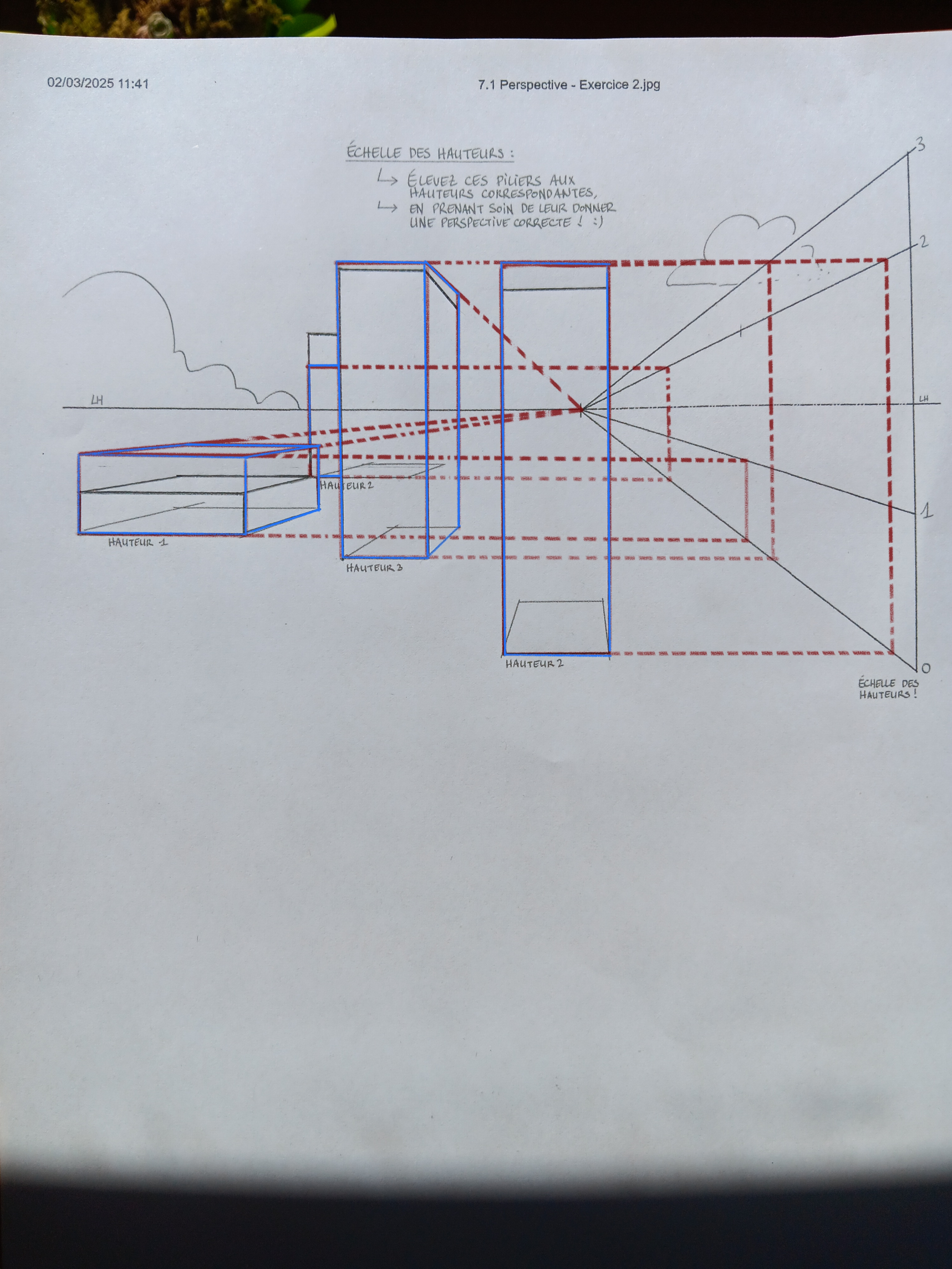 Hello Marie-Claire, c'est vraiment pas mal! Les deux formes de gauche (hauteur 1 et hauteur 2) sont OK, mais attention aux deux autres formes au premier plan, j'ai l'impression que tu as mélangé les lignes de report entre la hauteur 3 et la hauteur 2. À part ça c'est du bon boulot! ^^