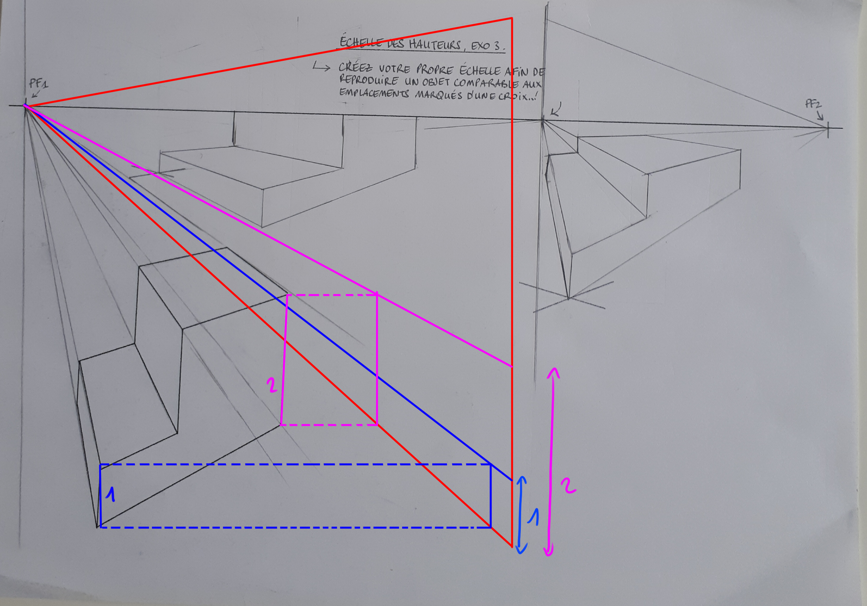 Je vois effectivement que tu n'as pas compris. J'ai décalé ton échelle des hauteurs pour que ce soit plus pratique. Le but est de créer 2 figures à peu près au niveau des croix au sol qui reportent les hauteurs 1 et 2 de la figure de base. On s'en fiche si les figures n'ont pas tout à fait les mêmes longueurs quand tu les mets dans la perspective (en te servant des points de fuite 1 et 2), mais les hauteurs doivent être les mêmes, reportées dans la distance. Je t'ai refais ton échelle des hauteurs pour voir quelles sont les hauteurs à reporter. Est-ce que c'est mieux compris ou bien je réexplique d'une autre façon ? ^^