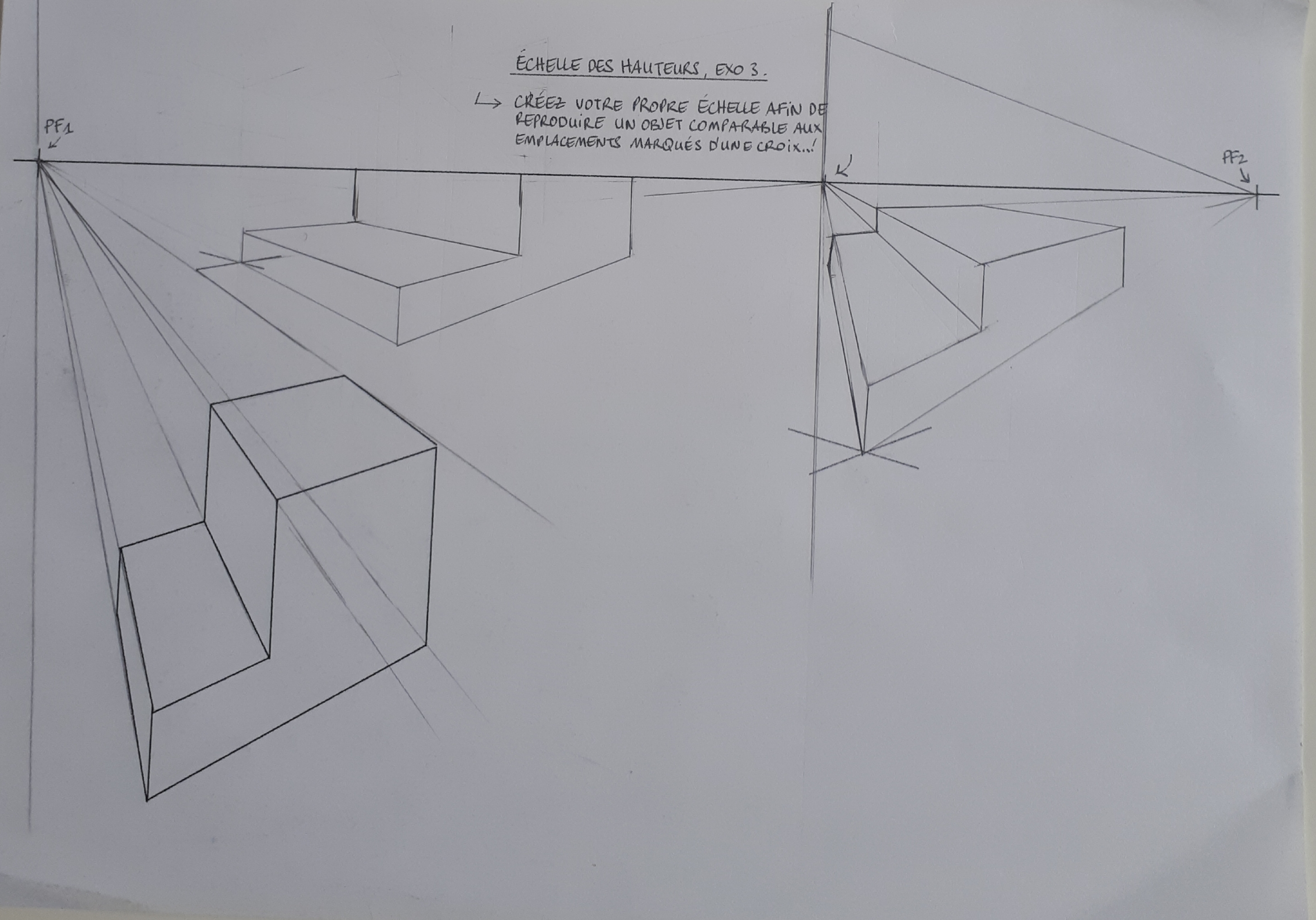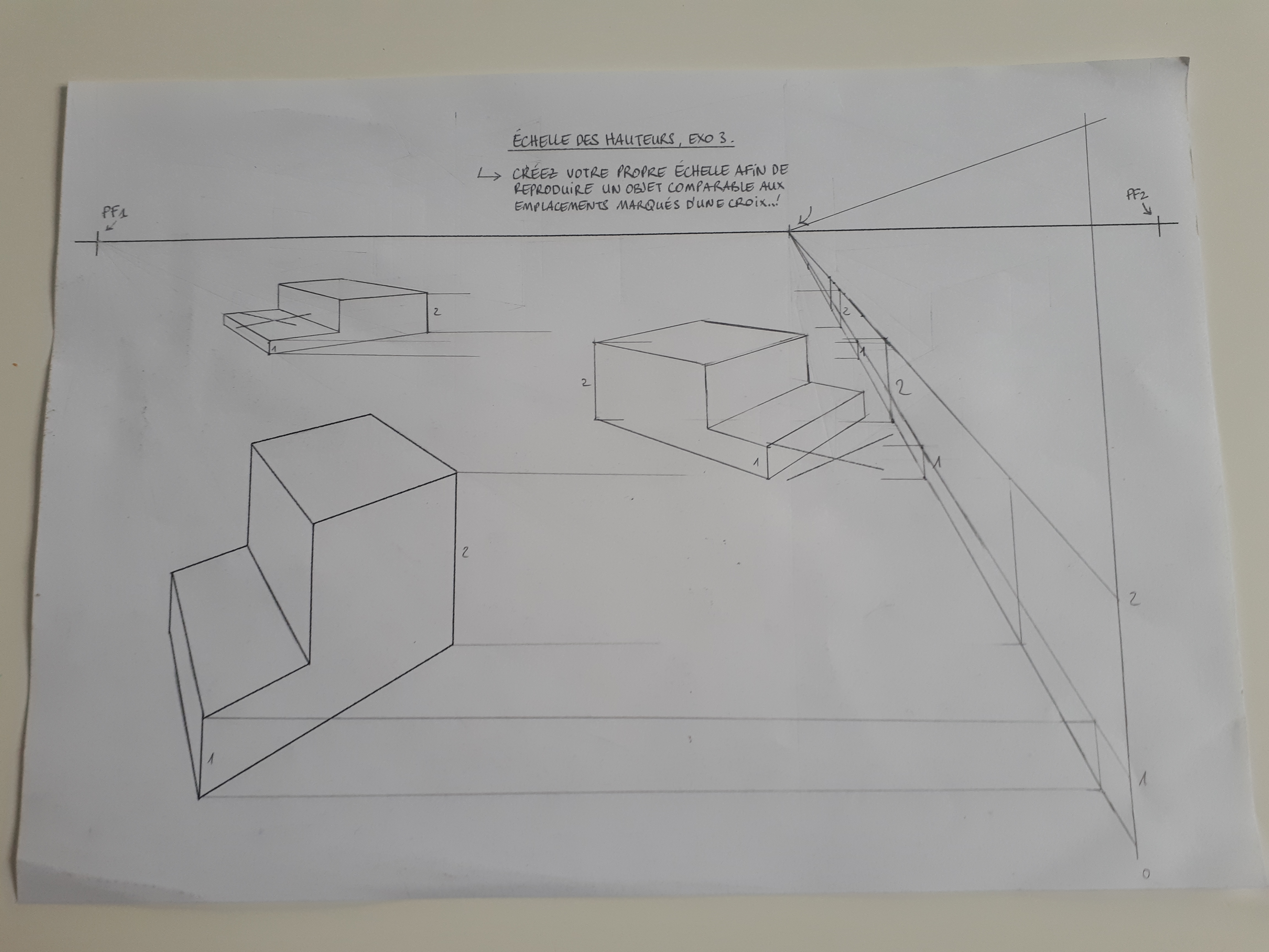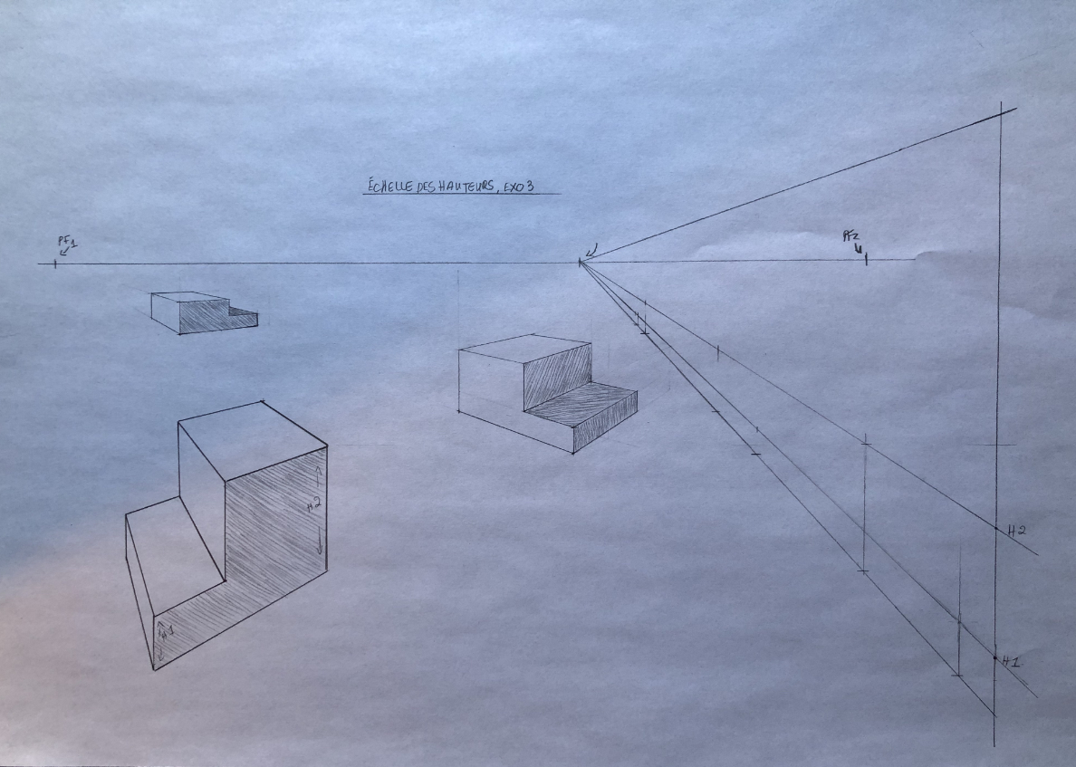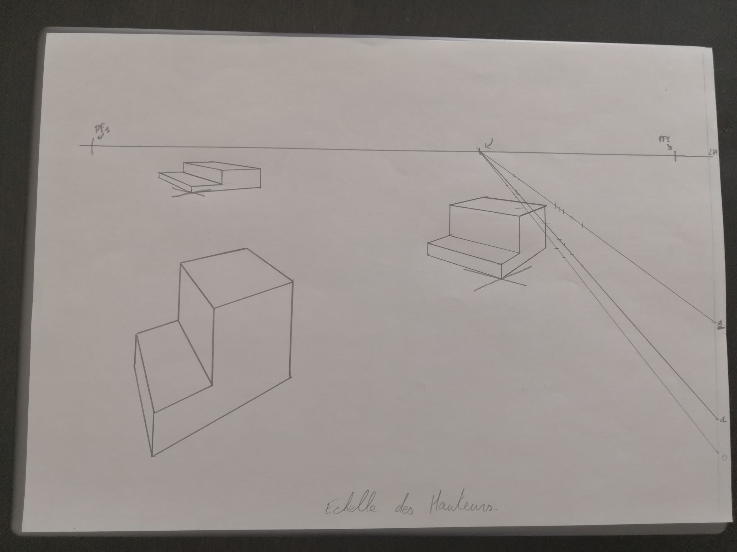 Merci je vois mieux comment tu as fait :) Je pense que le principe est plutôt compris, mais tu n'avais pas besoin de tous ces traits donc je ne pense pas que tu aies reportées les bonnes hauteurs. Il y en a seulement 2 à mesurer. On part de ses 2 hauteurs sur la prmière figure pour les créer dans l'échelle des hauteurs.Pour ce qui part dans la distance tu auras juste besoin des points de fuite. J'espère que ce sera plus clair :)