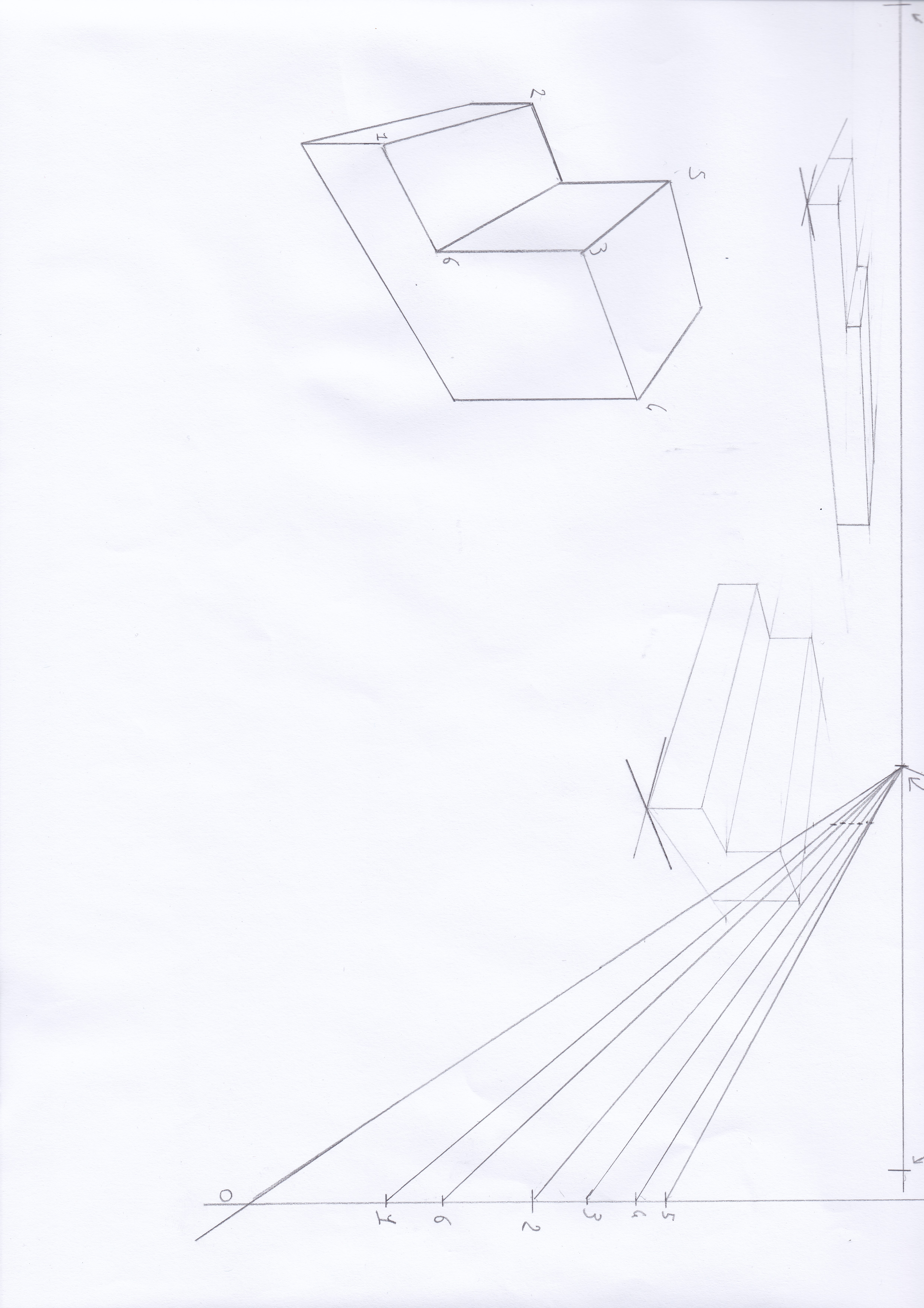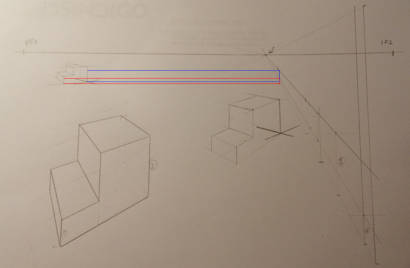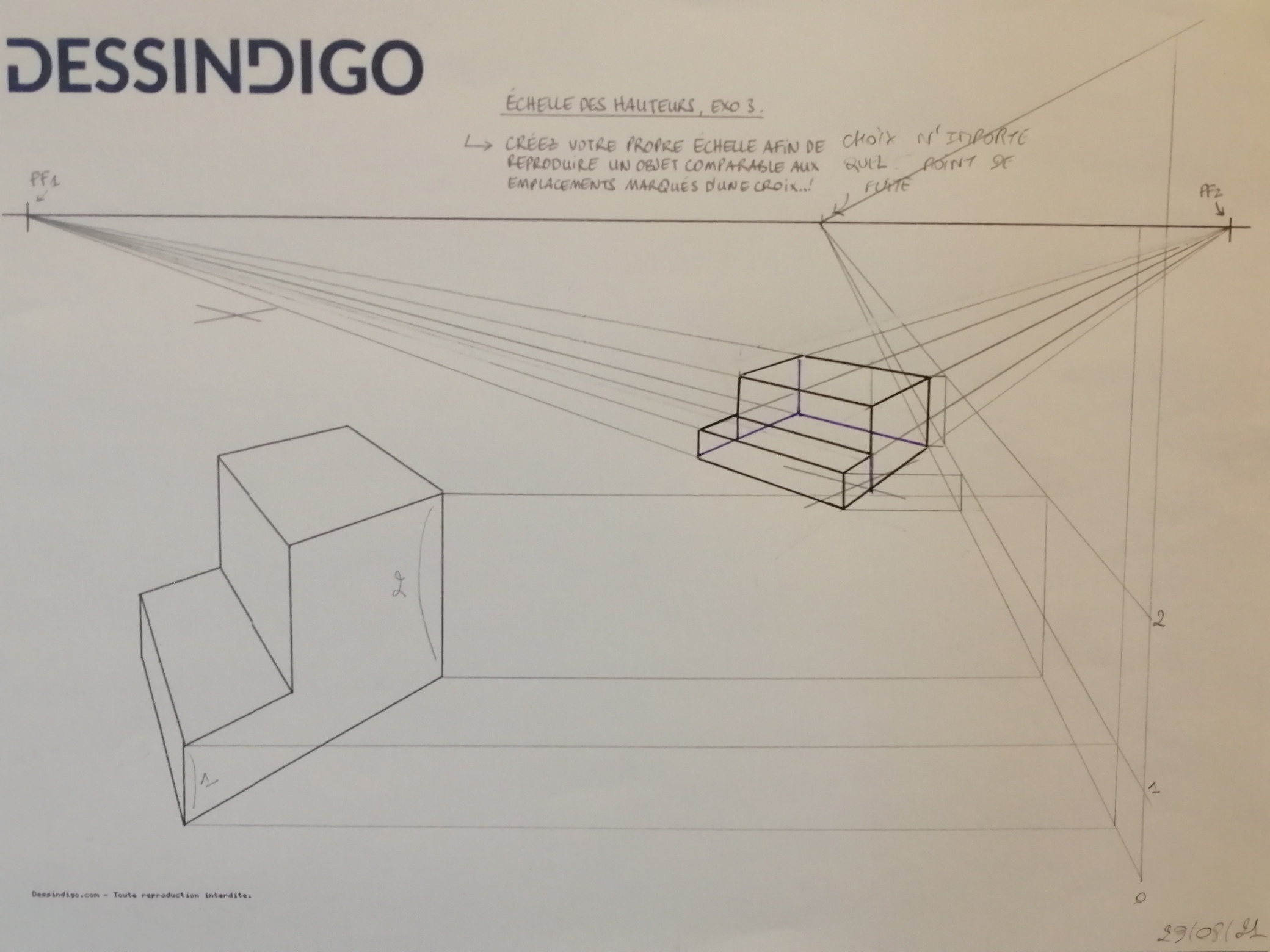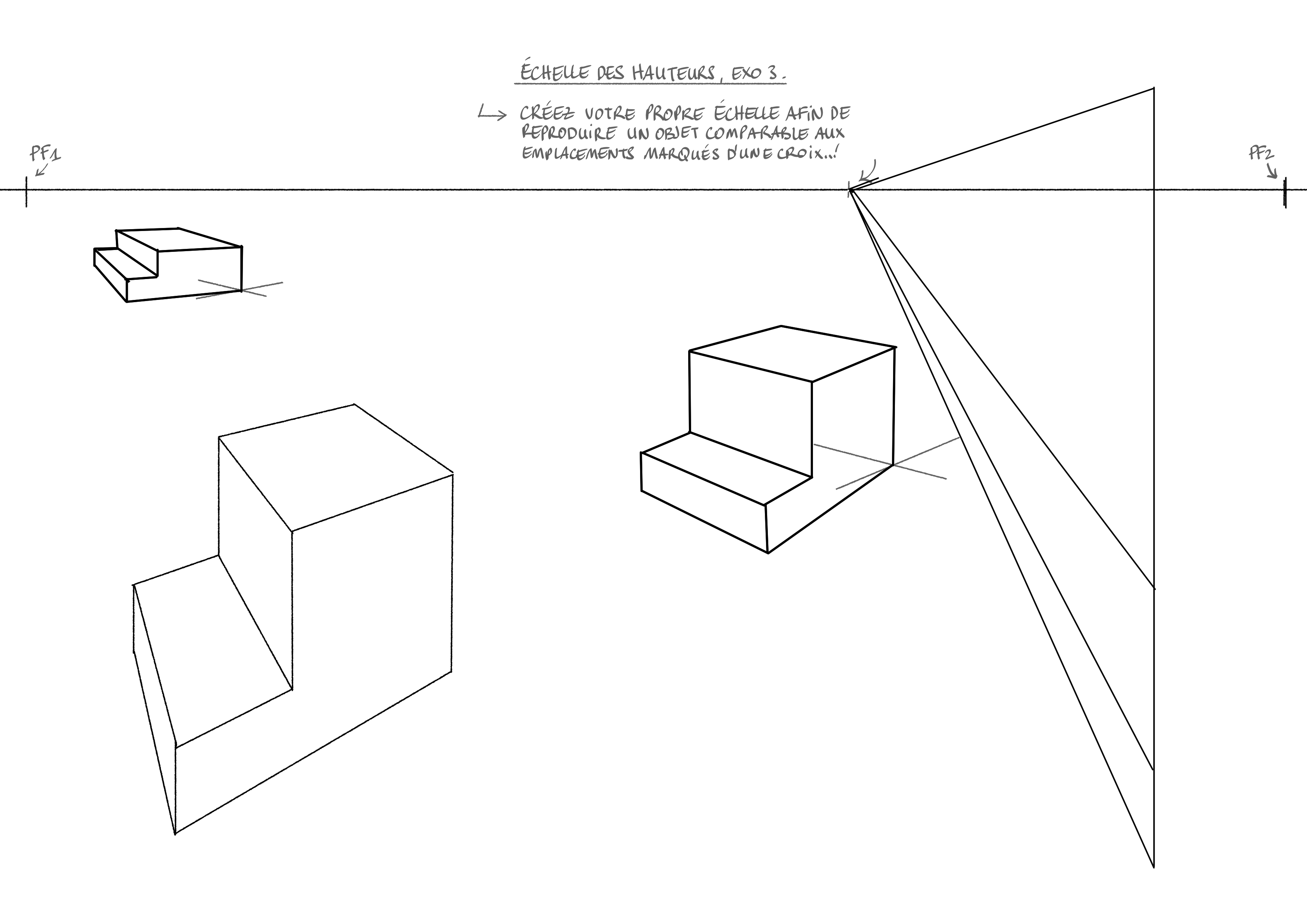 Merci je vois mieux comment tu as fait :) Je pense que le principe est plutôt compris, mais tu n'avais pas besoin de tous ces traits donc je ne pense pas que tu aies reportées les bonnes hauteurs. Il y en a seulement 2 à mesurer. On part de ses 2 hauteurs sur la prmière figure pour les créer dans l'échelle des hauteurs.Pour ce qui part dans la distance tu auras juste besoin des points de fuite. J'espère que ce sera plus clair :)