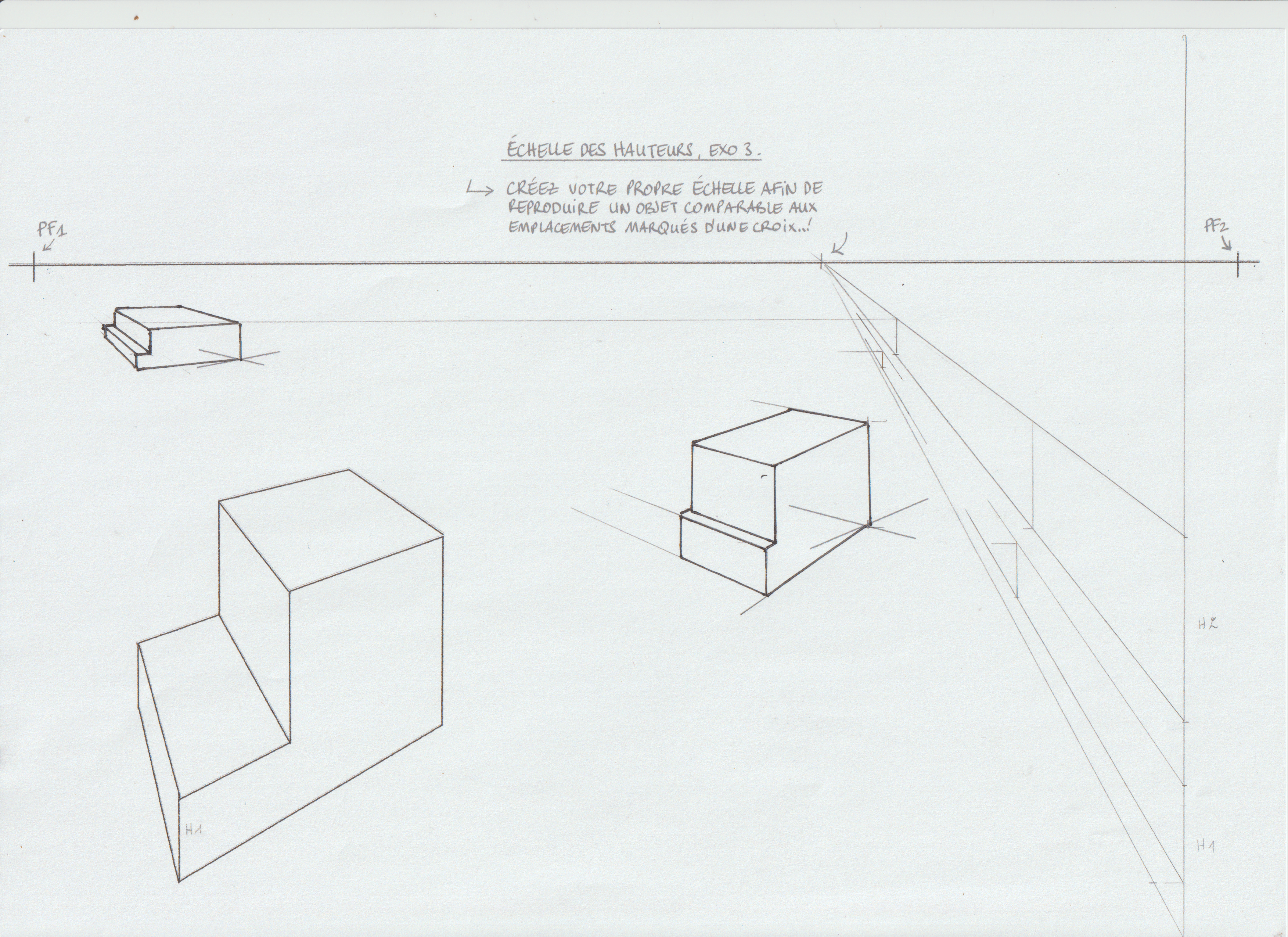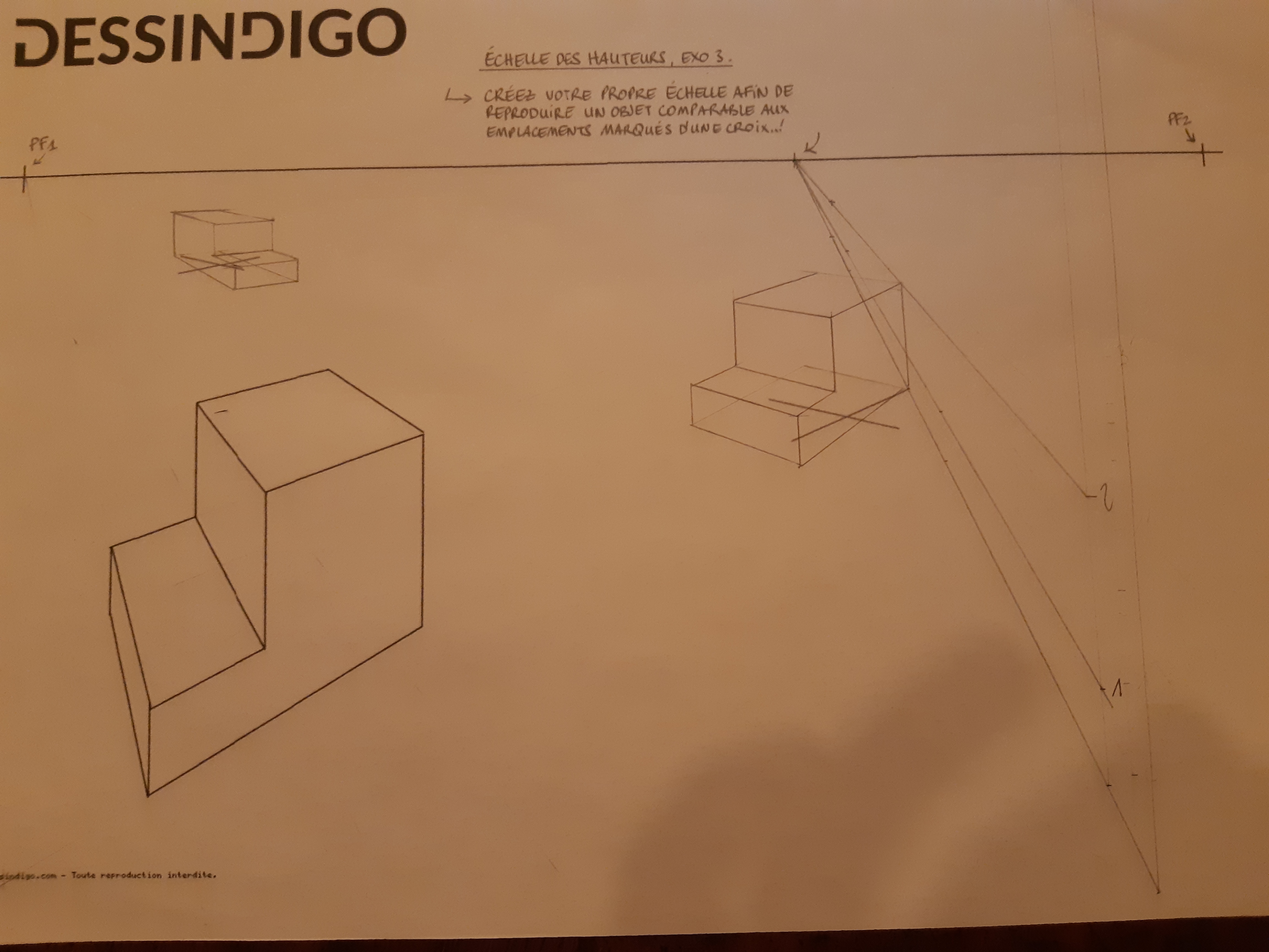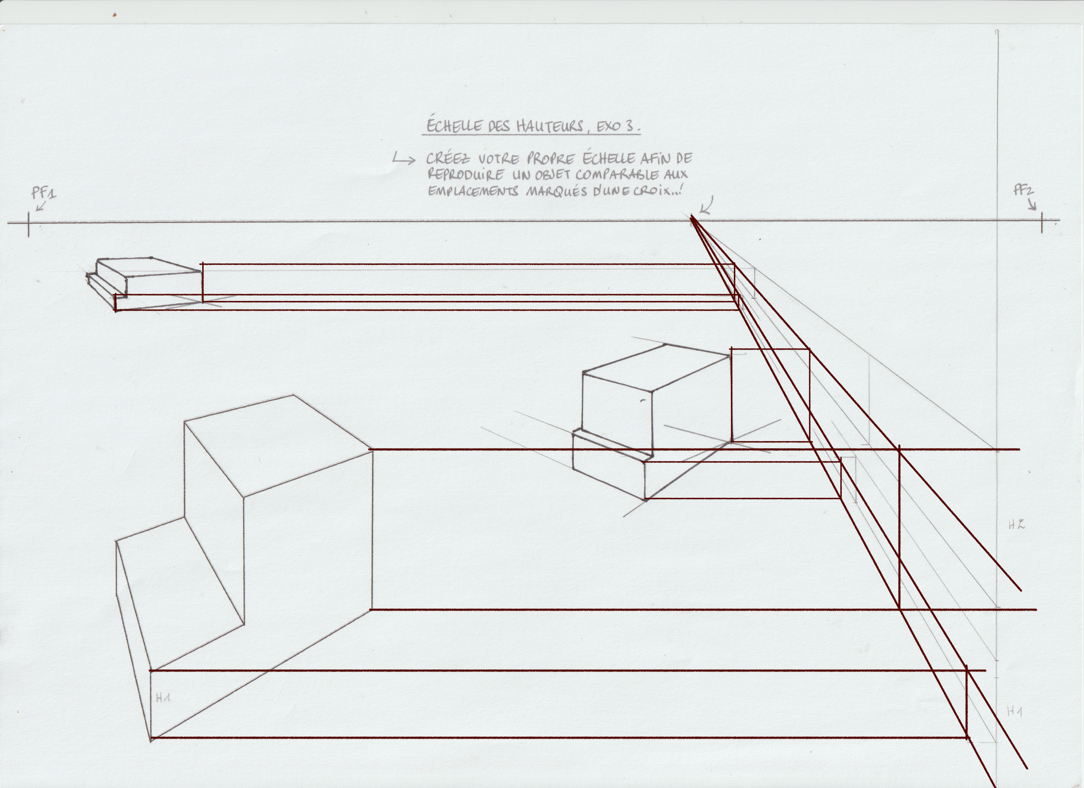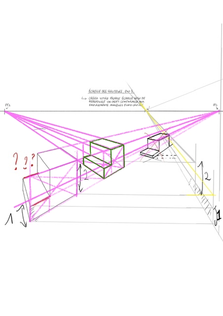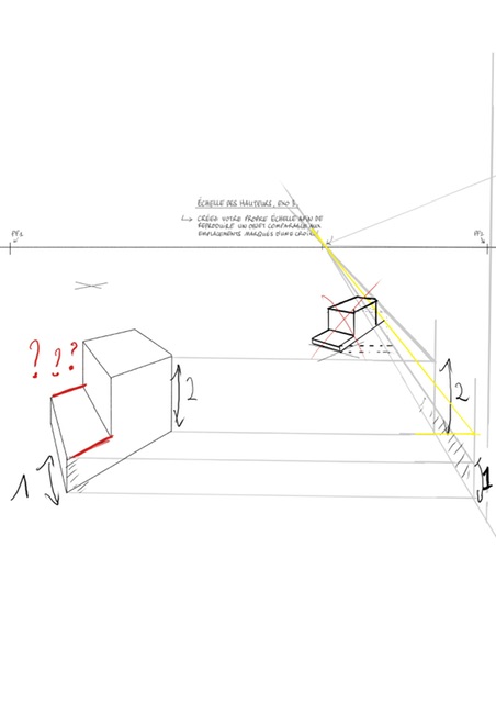 Hello Prima, question un poil plus complexe... Bon en effet, ici on est sur l'exercice sur les échelles de hauteur, donc si tu as compris ça, c'est cool. Pour la partie dont tu parles on est sur l'échelle de profondeur, il y a un cours qui aborde ce sujet, mais ça ne répondra pas totalement à tes questions je pense puisque ce la te permettra de calculer une même distance en prondeur sur les mêmes lignes de fuites... En maîtrisant les échelles de hauteurs, et les échelles de profondeurs et en jonglant entre point de fuites et lignes de fuites, il y aura possibilité que tu retrouves des dimensions identique d'une même forme disposée à plusieurs endroits et d'angles différents sur un dessins... Mais ce sera beaucoup de prise de tête pour du détail, et arrivé à ce niveau il faut effectivement s'en remettre à une estimation à l'oeil.