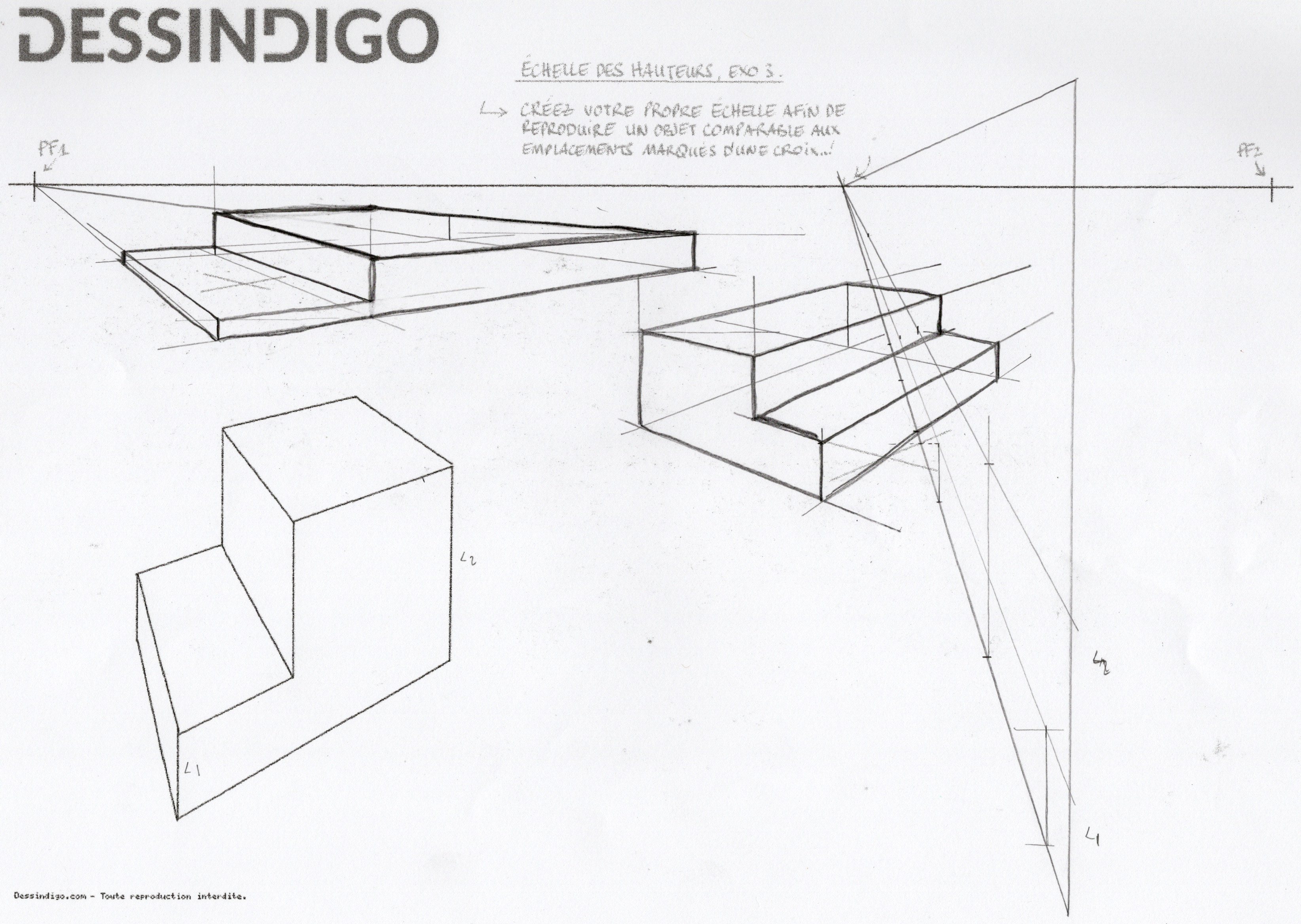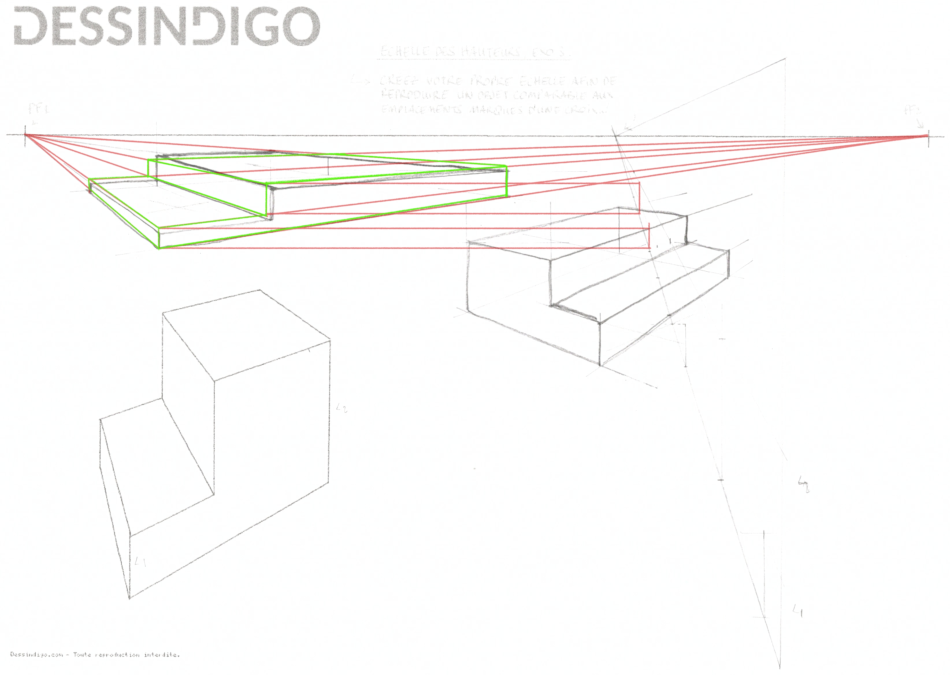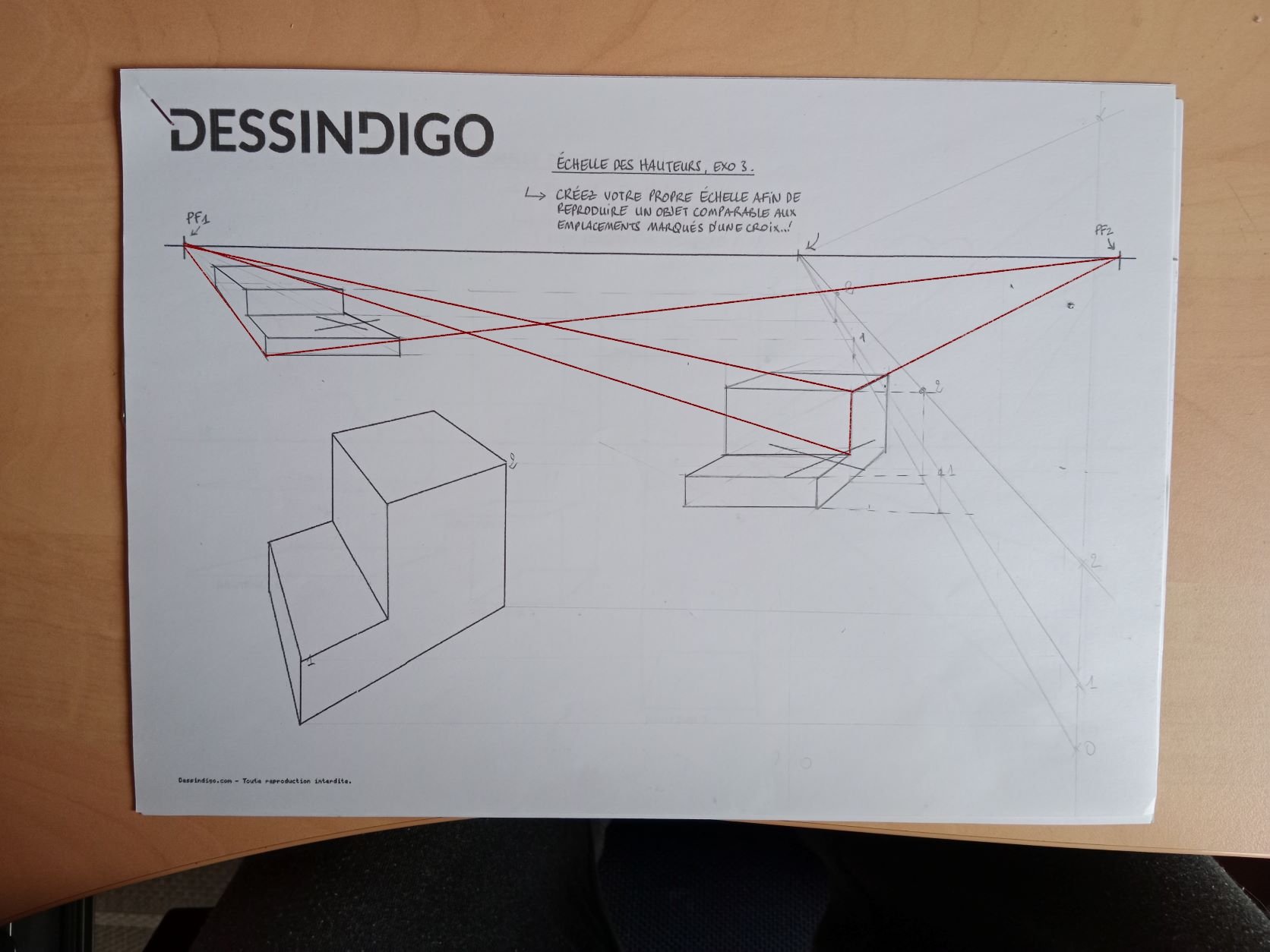 Hello Prima, question un poil plus complexe... Bon en effet, ici on est sur l'exercice sur les échelles de hauteur, donc si tu as compris ça, c'est cool. Pour la partie dont tu parles on est sur l'échelle de profondeur, il y a un cours qui aborde ce sujet, mais ça ne répondra pas totalement à tes questions je pense puisque ce la te permettra de calculer une même distance en prondeur sur les mêmes lignes de fuites... En maîtrisant les échelles de hauteurs, et les échelles de profondeurs et en jonglant entre point de fuites et lignes de fuites, il y aura possibilité que tu retrouves des dimensions identique d'une même forme disposée à plusieurs endroits et d'angles différents sur un dessins... Mais ce sera beaucoup de prise de tête pour du détail, et arrivé à ce niveau il faut effectivement s'en remettre à une estimation à l'oeil.