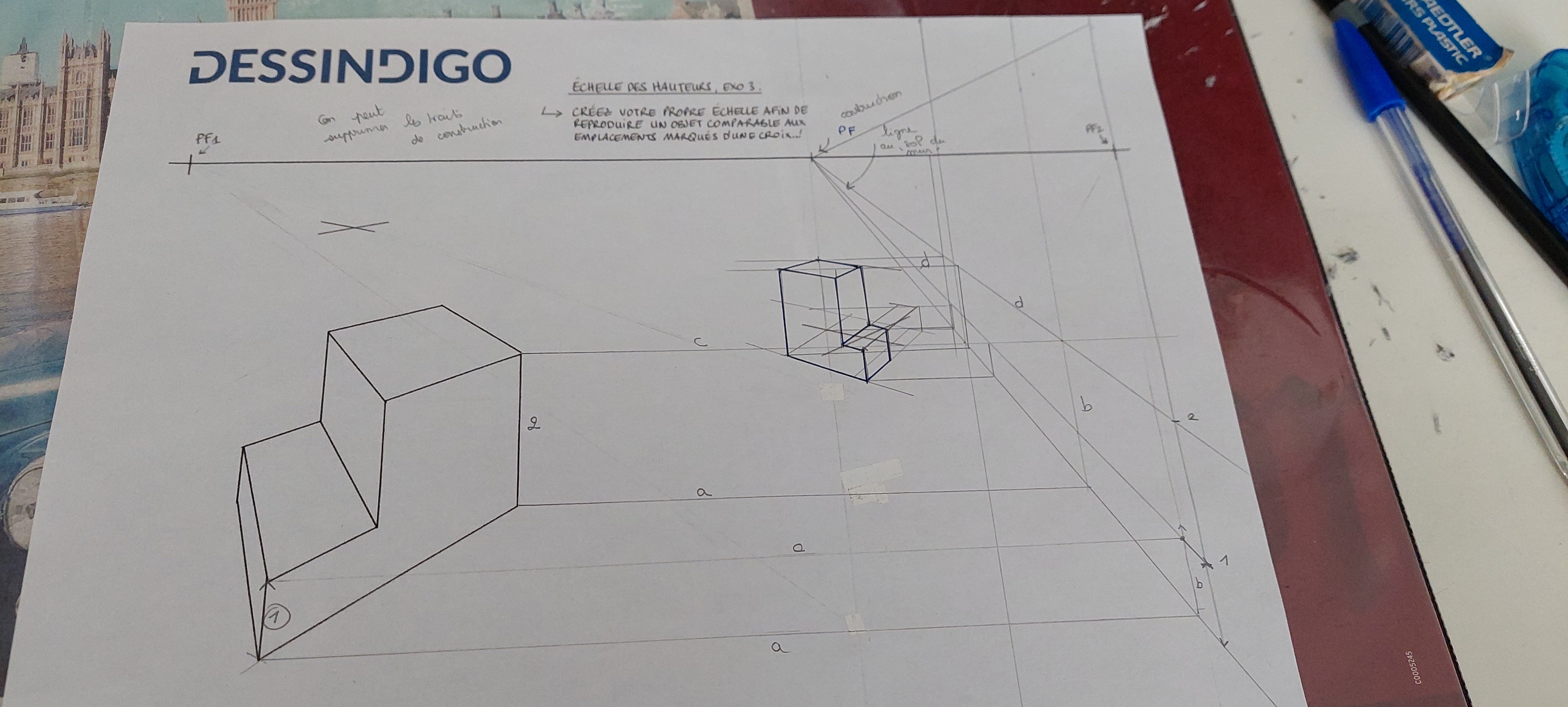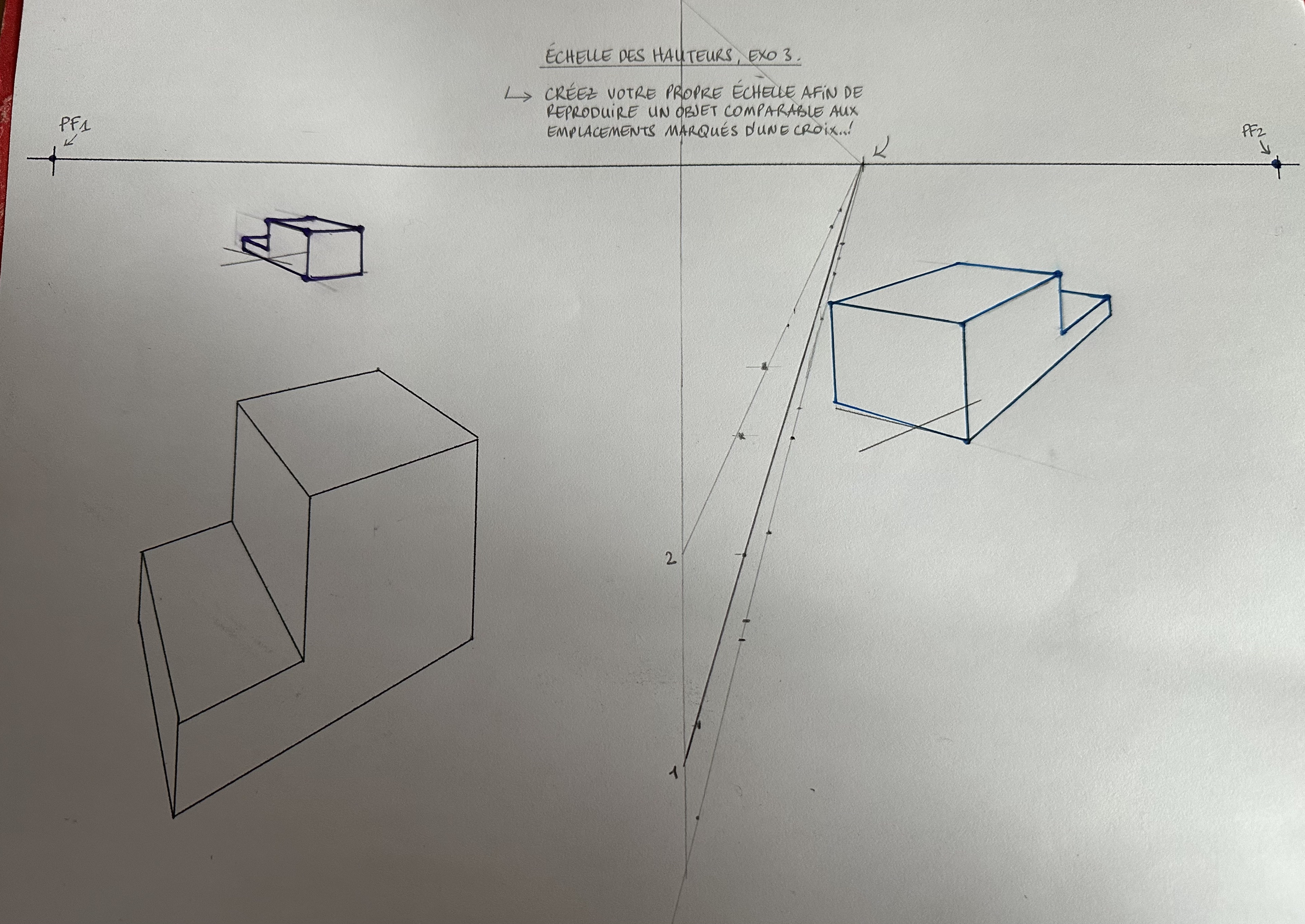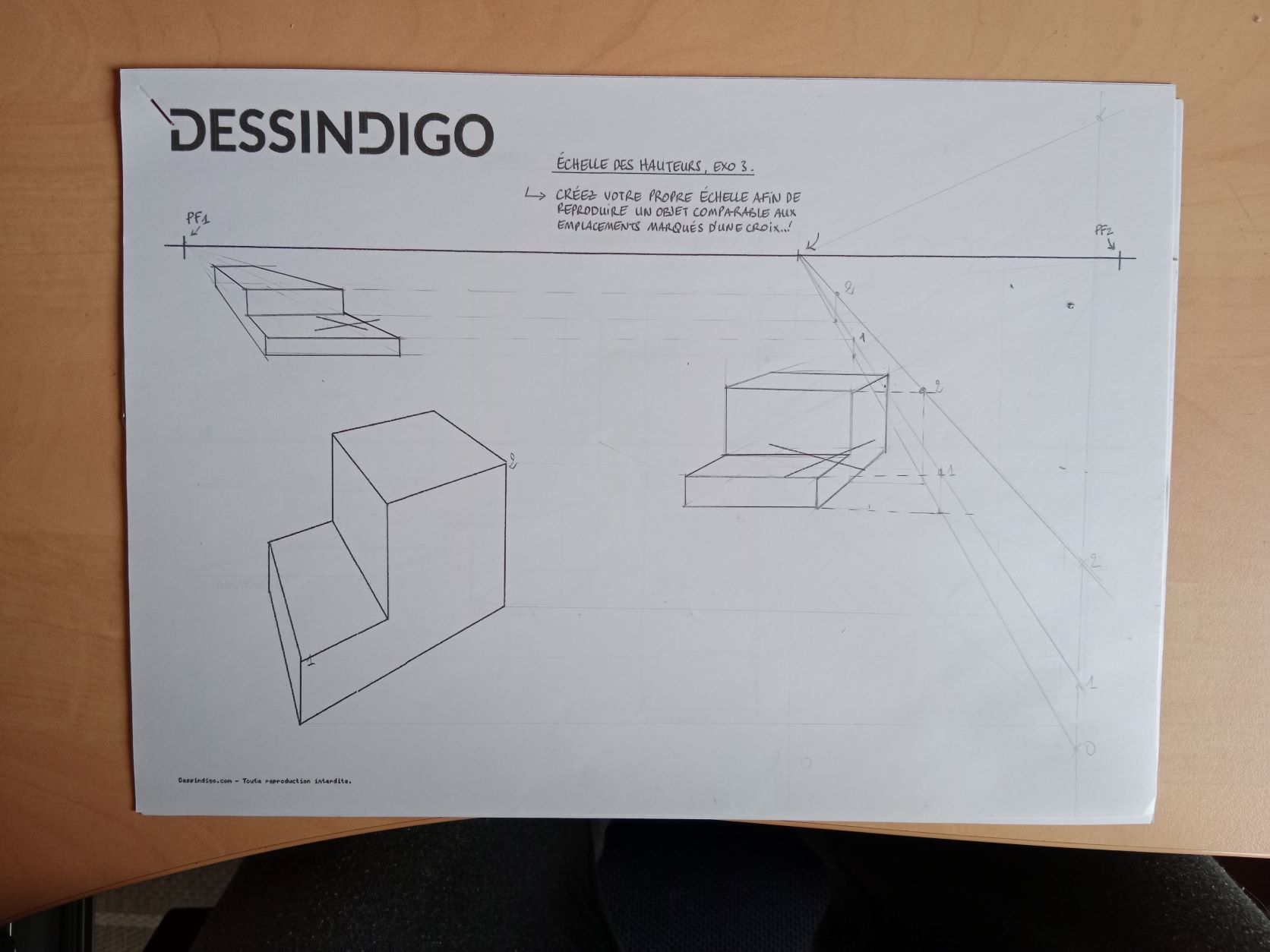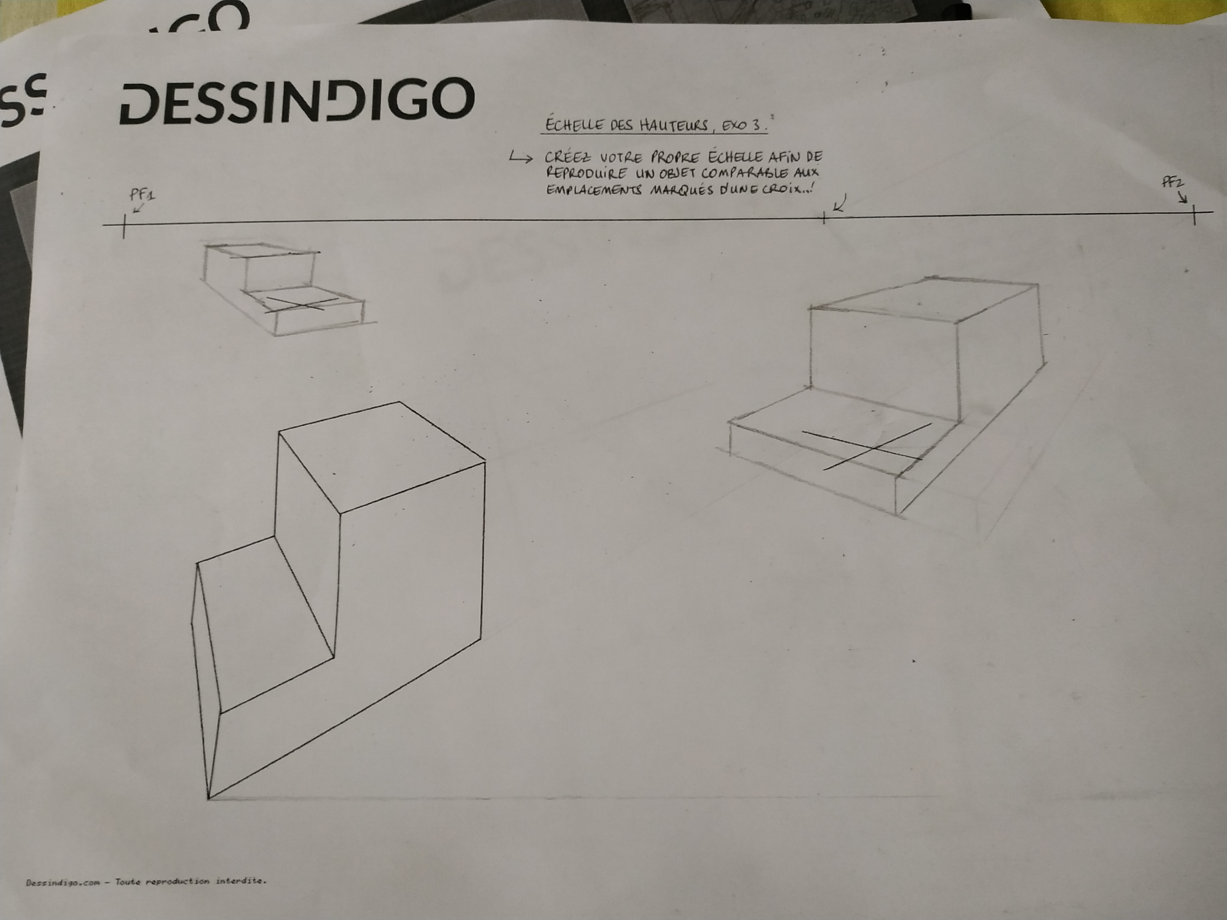 Hello Prima, question un poil plus complexe... Bon en effet, ici on est sur l'exercice sur les échelles de hauteur, donc si tu as compris ça, c'est cool. Pour la partie dont tu parles on est sur l'échelle de profondeur, il y a un cours qui aborde ce sujet, mais ça ne répondra pas totalement à tes questions je pense puisque ce la te permettra de calculer une même distance en prondeur sur les mêmes lignes de fuites... En maîtrisant les échelles de hauteurs, et les échelles de profondeurs et en jonglant entre point de fuites et lignes de fuites, il y aura possibilité que tu retrouves des dimensions identique d'une même forme disposée à plusieurs endroits et d'angles différents sur un dessins... Mais ce sera beaucoup de prise de tête pour du détail, et arrivé à ce niveau il faut effectivement s'en remettre à une estimation à l'oeil.