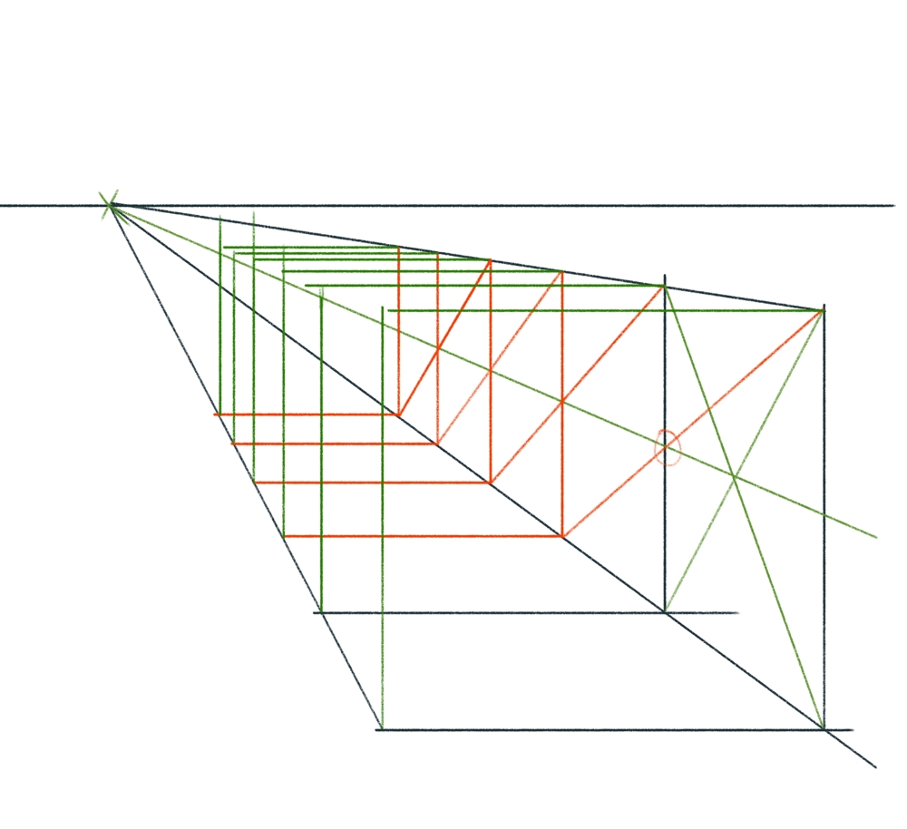 Voici une petite technique pour calculer les distances dans la profondeur: il faut tracer les diagonales du côté verticale de ta forme (dans mon exemple un cube) afin de trouver le milieu. Tu tires une nouvelle ligne de fuite qui passe par le centre ainsi trouvé, et c'est là que ça se complique un peu... Il faut tirer une ligne du coin supérieur le plus proche et le faire passer par le milieu de la ligne suivante jusqu'à la ligne de base de ta forme. Et ça te donne l'emplacement de la verticale suivante. Il faut répéter le même processus autant de fois que tu souhaites reproduire cette distance. C'est pratique par exemple pour placer des poteaux ou des réverbères à distance égale.