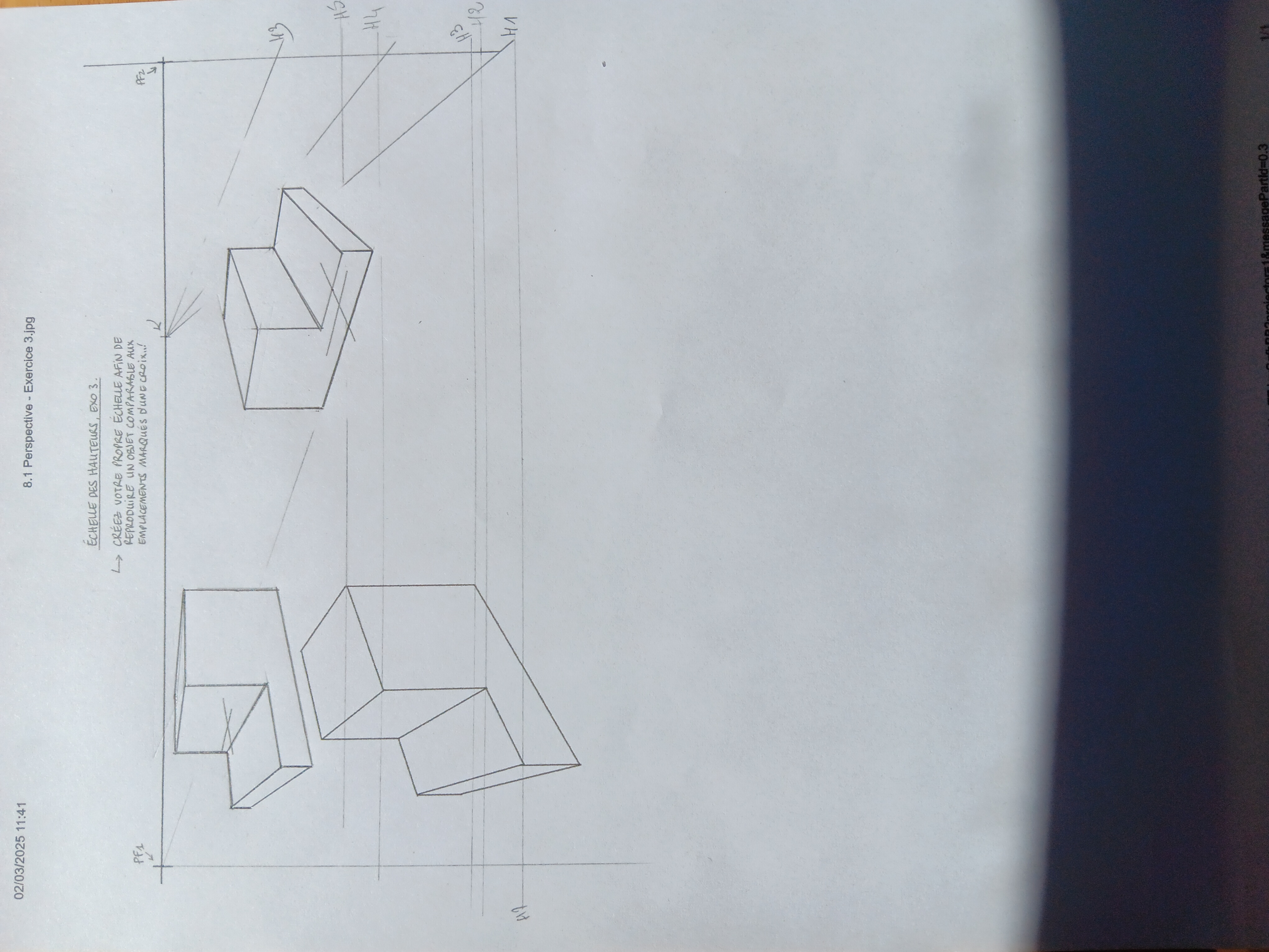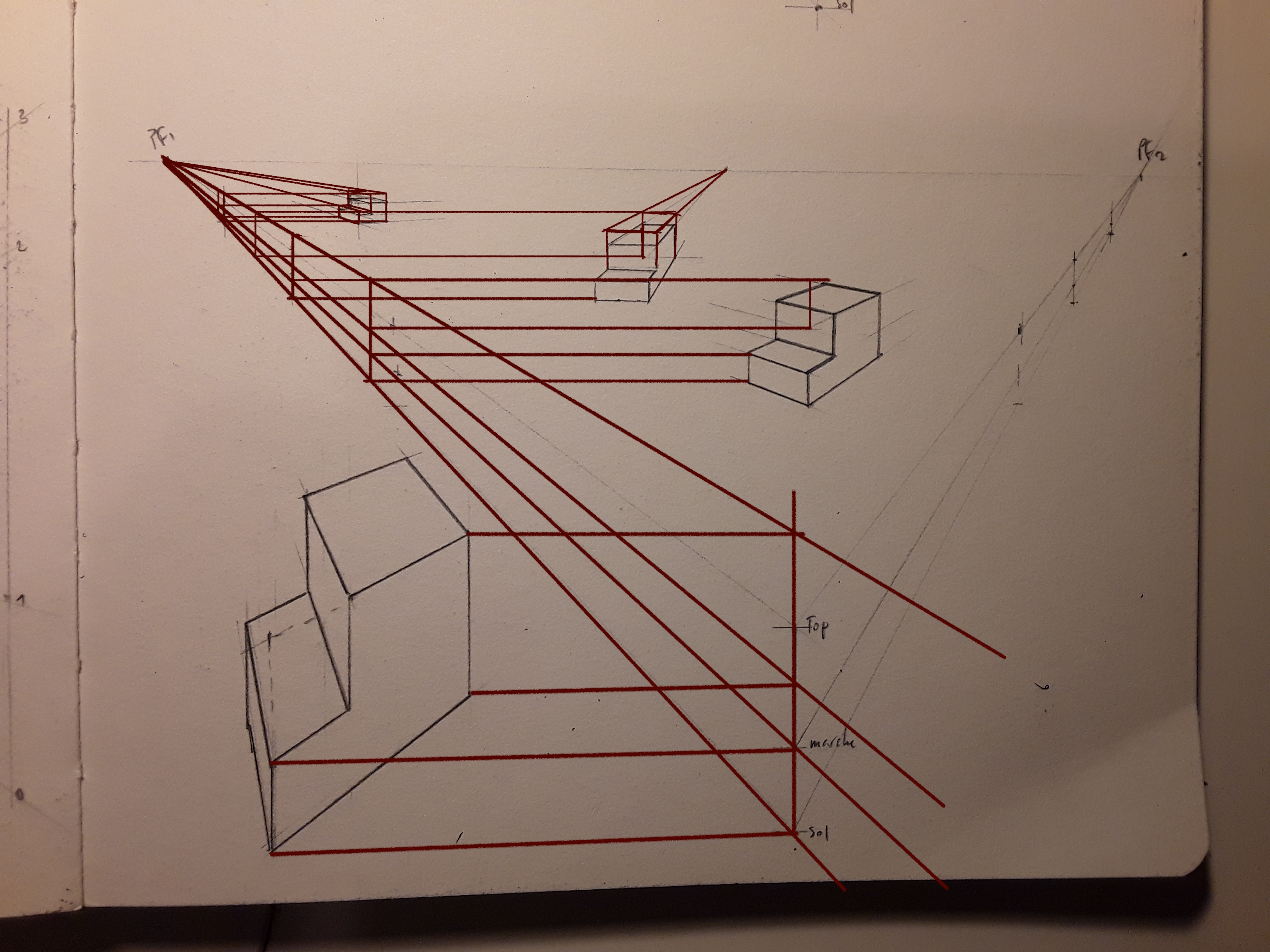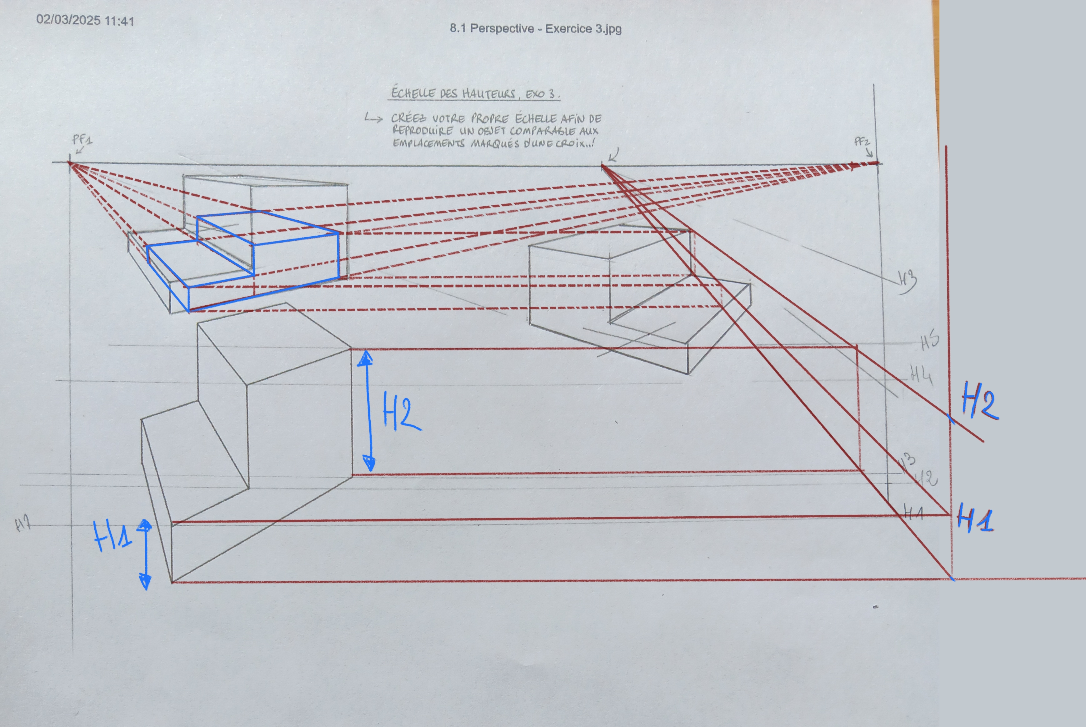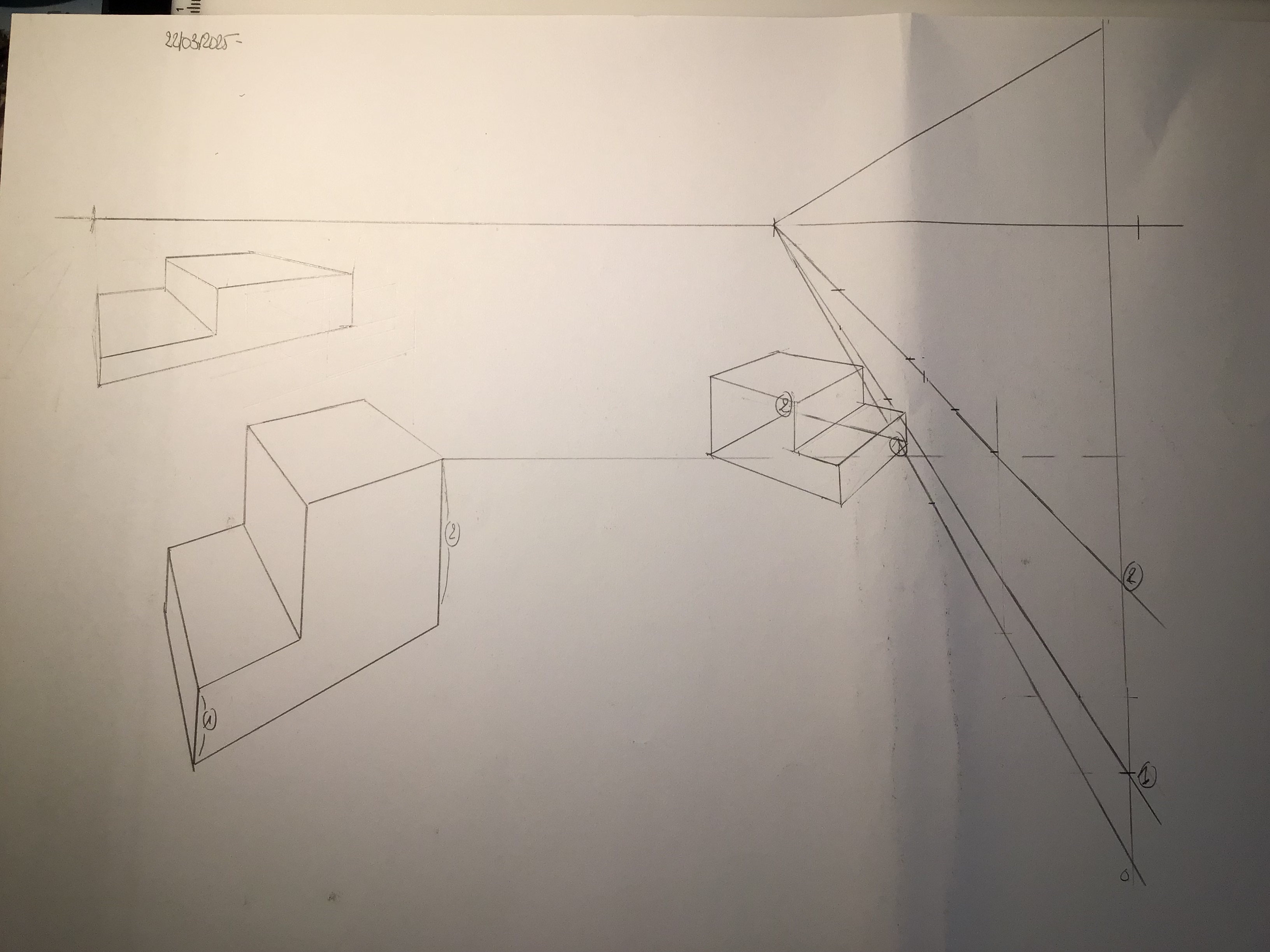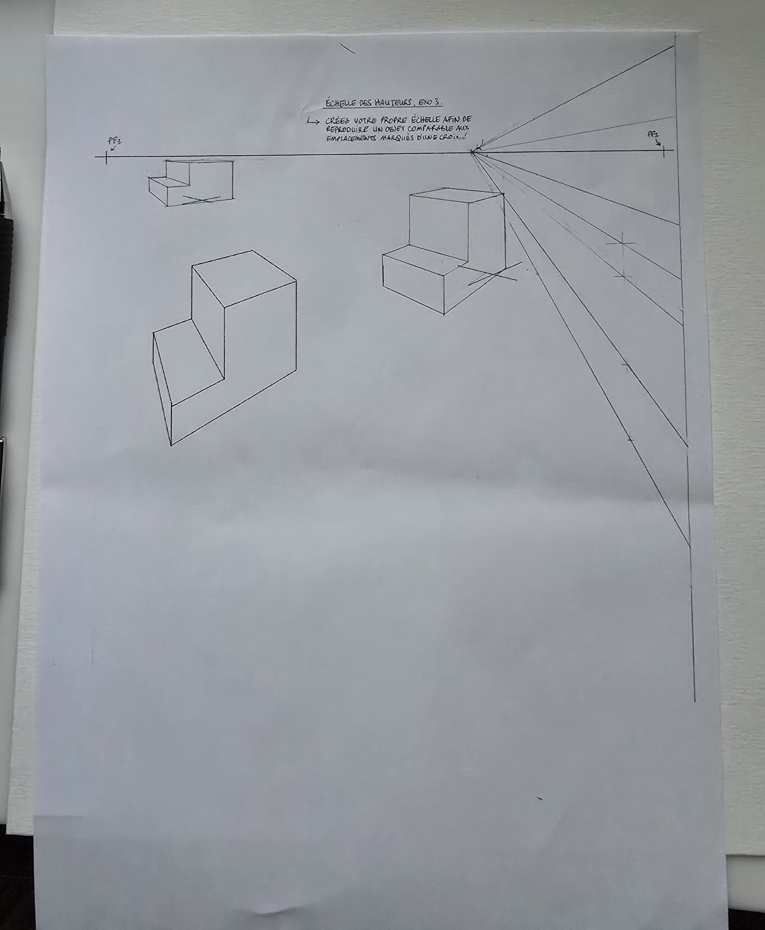 Tu vas connecter chaque coin du modèle avec le guide situé sur le côté, puis tu projetteras des lignes à partir du point de fuite. De cette façon, tu pourras utiliser les intersections pour recréer l'image. J'ai vu d'autres de tes exercices et je sais que si tu réessayes, tu vas y arriver. Alors, bon courage !