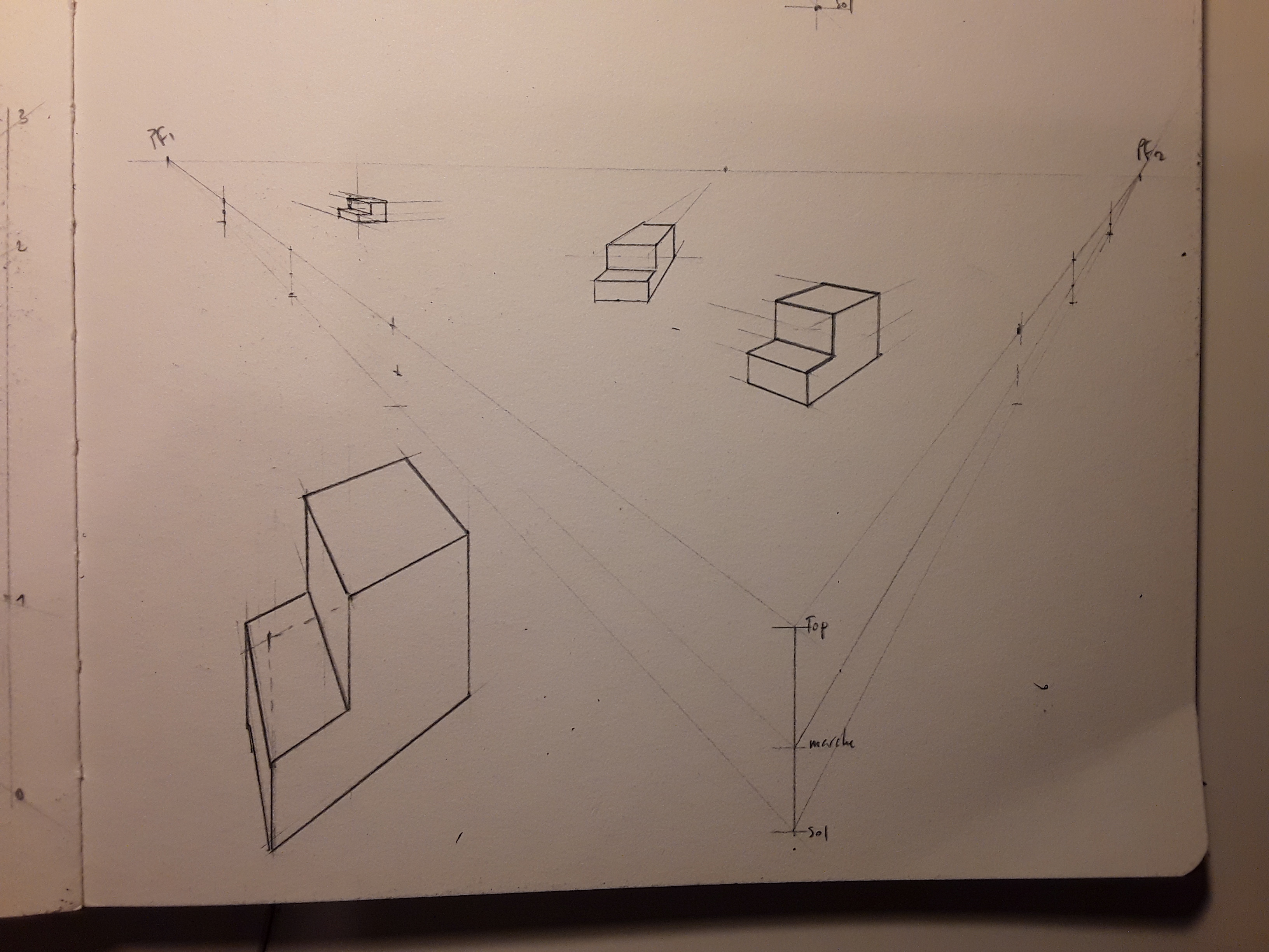 Bonjour Marie-Claire, tu as sembles avoir compris la méthode c'est super! Mais attention, tu t'es un peu emmêlée les pinceaux sur la transcription des hauteurs. Ici, il n'y a que 2 hauteurs à reporter, alors attention de ne pas reporter plusieurs fois la même hauteur mais à des profondeurs différentes. Une fois bien replacée sur l'échelle de hauteur, il n'y a plus qu'à retranscrire sur les autres formes, et je pense que de ce côté tu t'en tires très bien. Tu pourrras essayer de changer d'angle de vue par la suite quand tu seras plus à l'aise avec la technique, ne t'inquiètes pas! 😉