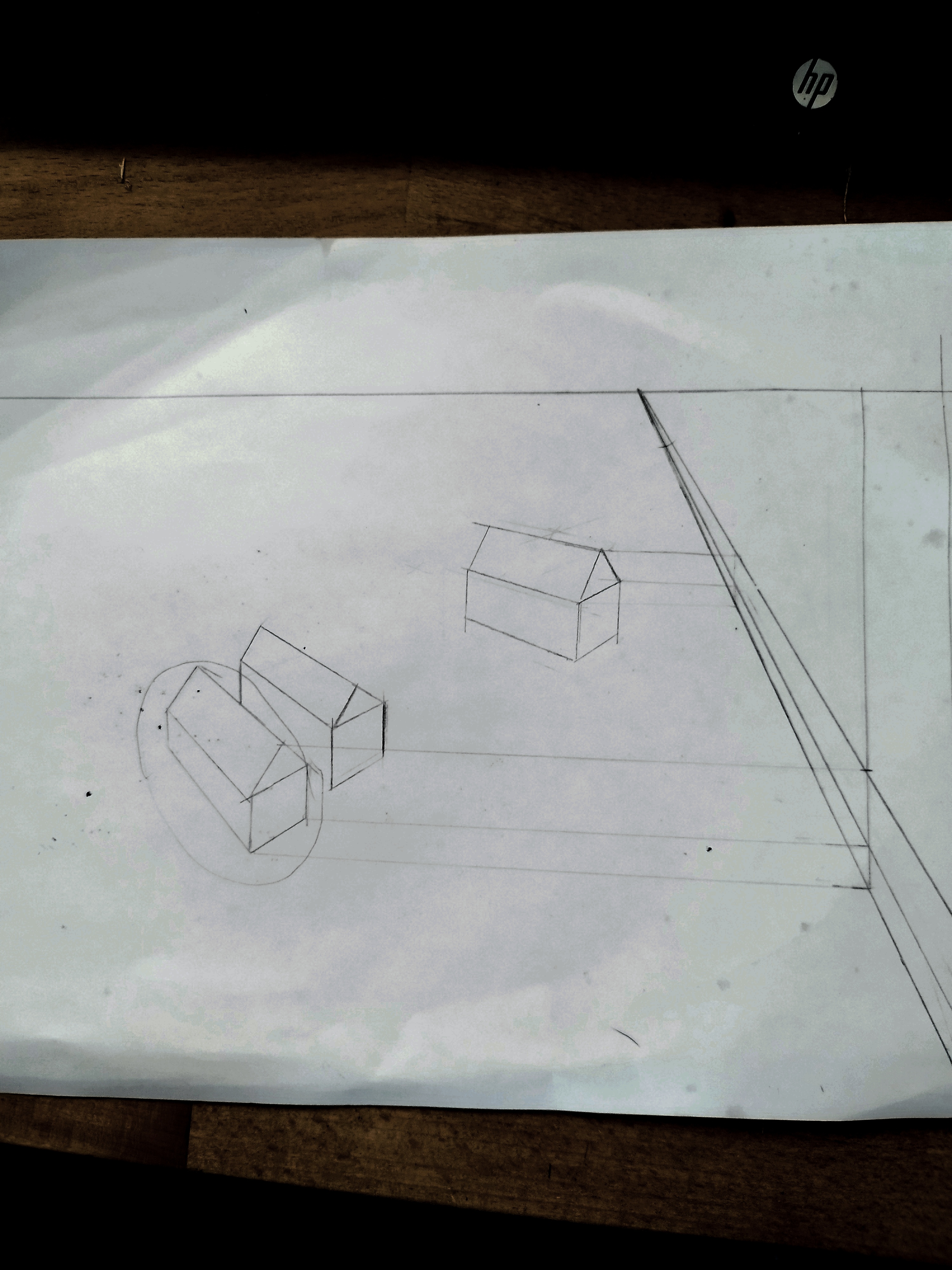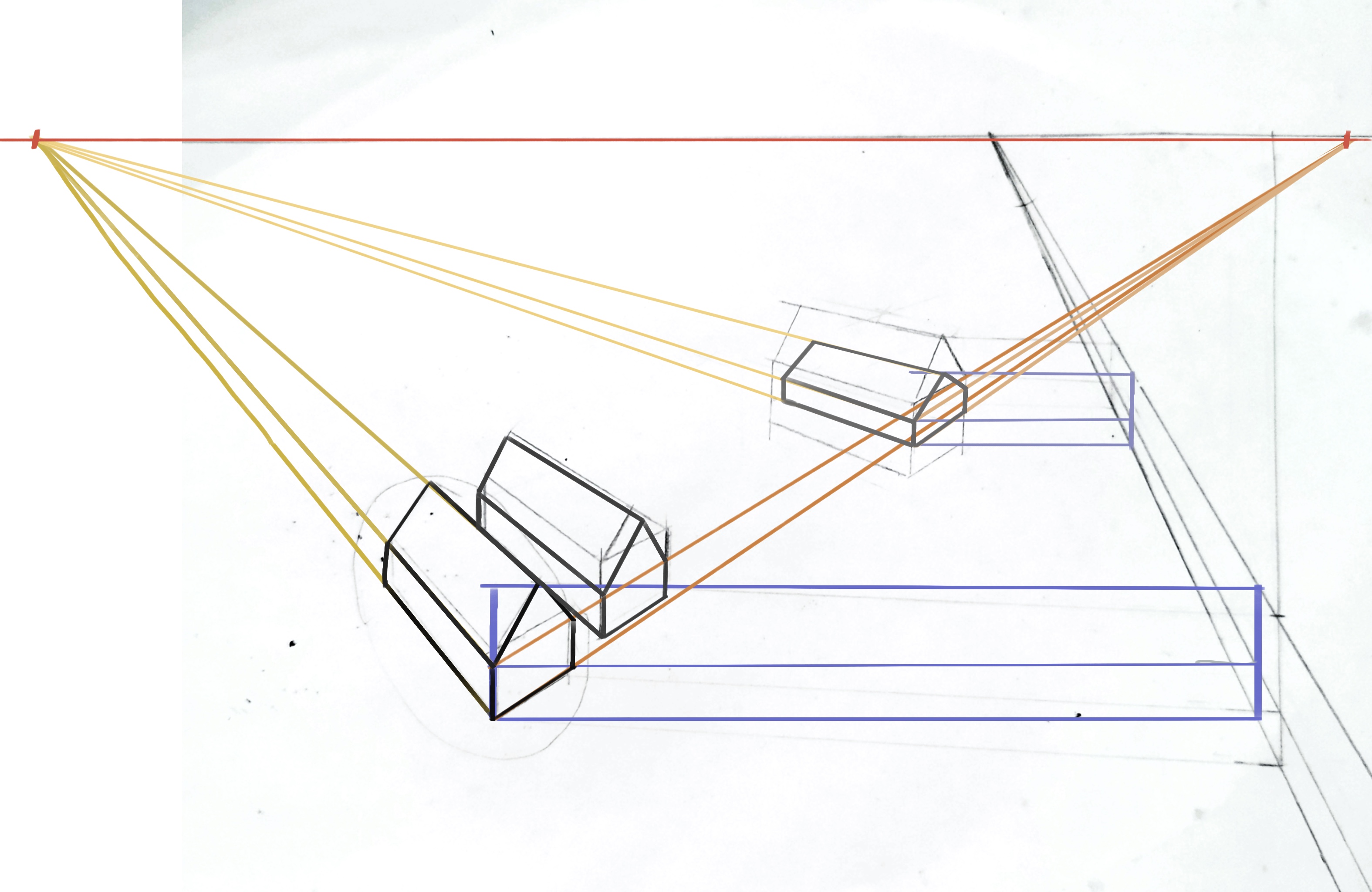 Alors tu as compris l'idee mais ça n'est pas encore exactement ça, ta première maison est plutôt juste, mise à part que tes droites pour aller jusqu'a l'échelle des hauteurs ne sont pas perpendiculaires ce qui fausse légèrement le résultat, pour les autres maisons il y a encore le même problème de droite pas perpendiculaires mais surtout pour la dernière tu n'as pas reprise les bonnes hauteurs ce qui fait qu'elle est un peu trop grande. Pour bien la tracer commence par poser une droite verticale(en gris) ensuite relié la à l'echelle des hauteur (en bleu) puis tu trace la perpendiculaire (toujours en bleu) et la parallèle (encore en bleu) pour avoir la hauteur exacte de ton mur. Tu peux ensuite relier au différents point de fuite pour avoir la direction des murs. Pour la hauteur du toit c'est le même principe.