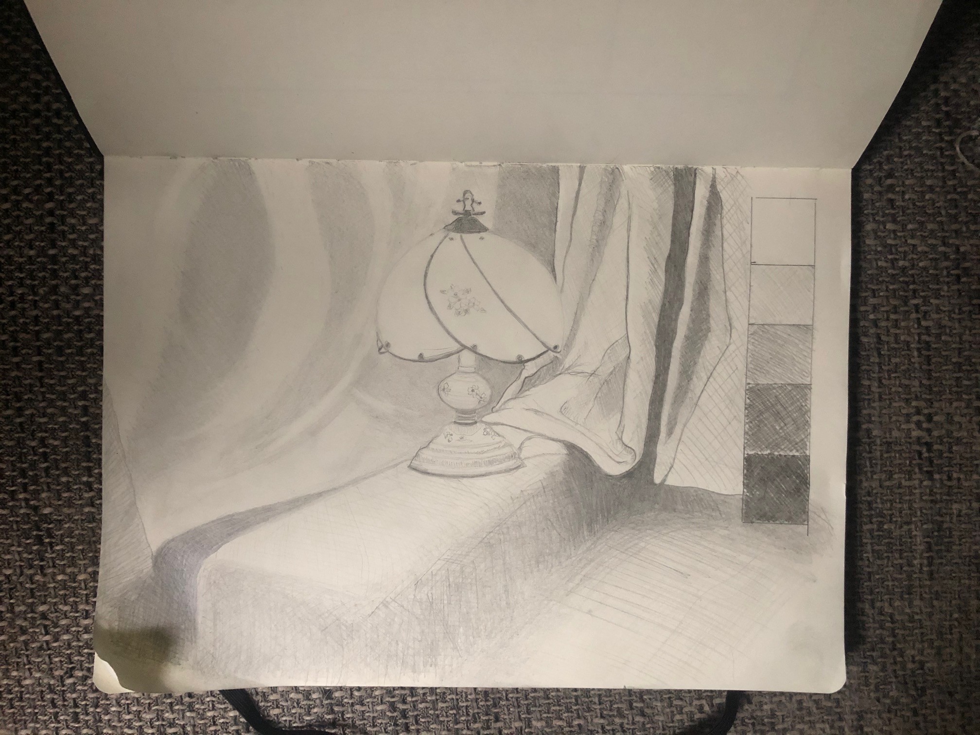 C'est pas mal tout ça ^^ Justement tes zones sombres ressortent bien, c'est normal quand c'est très foncé qu'on ne puisse presque plus voir les hachures. Tes hachures à l'arrière plan sont fines et bien rendues, et c'est plus clair donc tu as bien compris le principe des plans. L'abat jour de ta lampe ne ressort pas trop, son contour n'est pas très net et il est tout blanc : il y a certainement des valeurs différentes à mettre sur cet abat-jour. Sur la droite tes hachures sont un peu moins soignées, notamment derrière ton échelle de valeurs sur le mur où ça fait un peu gros quadrillage moins élégant que le reste. Sinon, à certains endroits, comme la face droite du truc sur lequel est posé la lampe, le dégradé est très bien fait mais sur la partie la plus vers nous j'ai l'impression que l'angle des hachures changent. C'est mieux de rester dans une certaines régularité quand on est sur une même surface.