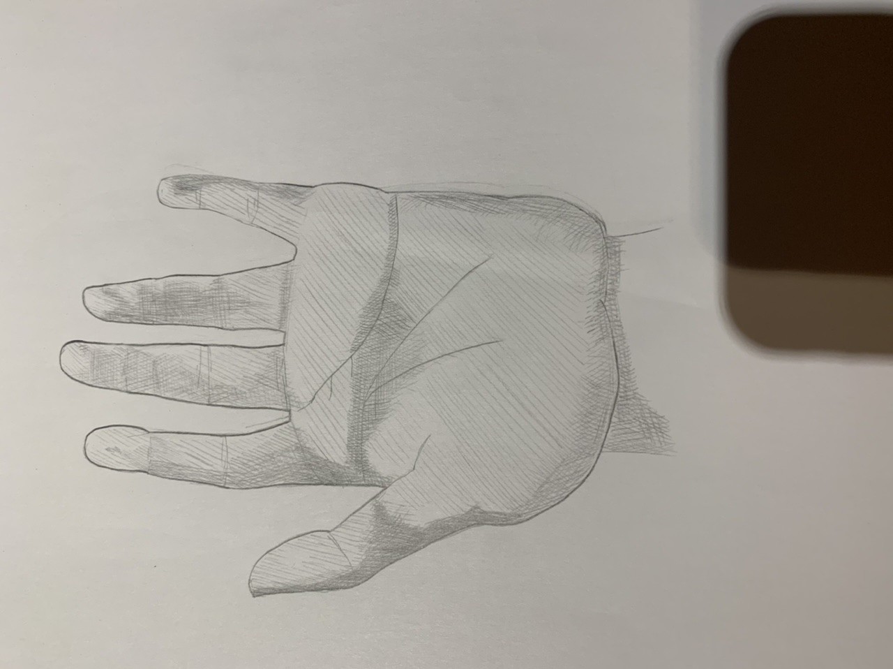 Le sens de l'auriculaire c'est plus logique comme ça :) En quantité de hachures ça me choque pas trop mais il pourrait y avoir des endroits plus légers, notamment sur la paume où vu qu'il y a des bosses il y a des zones qui pourraient être plus claires. Il manque toujours un peu de transitions en dégradé, surtout sur la paume d'ailleurs. Il faut penser à progressivement appuyer plus ou moins léger et faire les dégradés avec plus ou moins de croisements petit à petit. J'ai essayé de te faire des retouches par dessus, pour que tu vois l'orientation que ça peut prendre. On pourrait aller encore plus loin mais c'est déjà pas mal. En tous cas c'est déjà une jolie amélioration que tu as faite :)