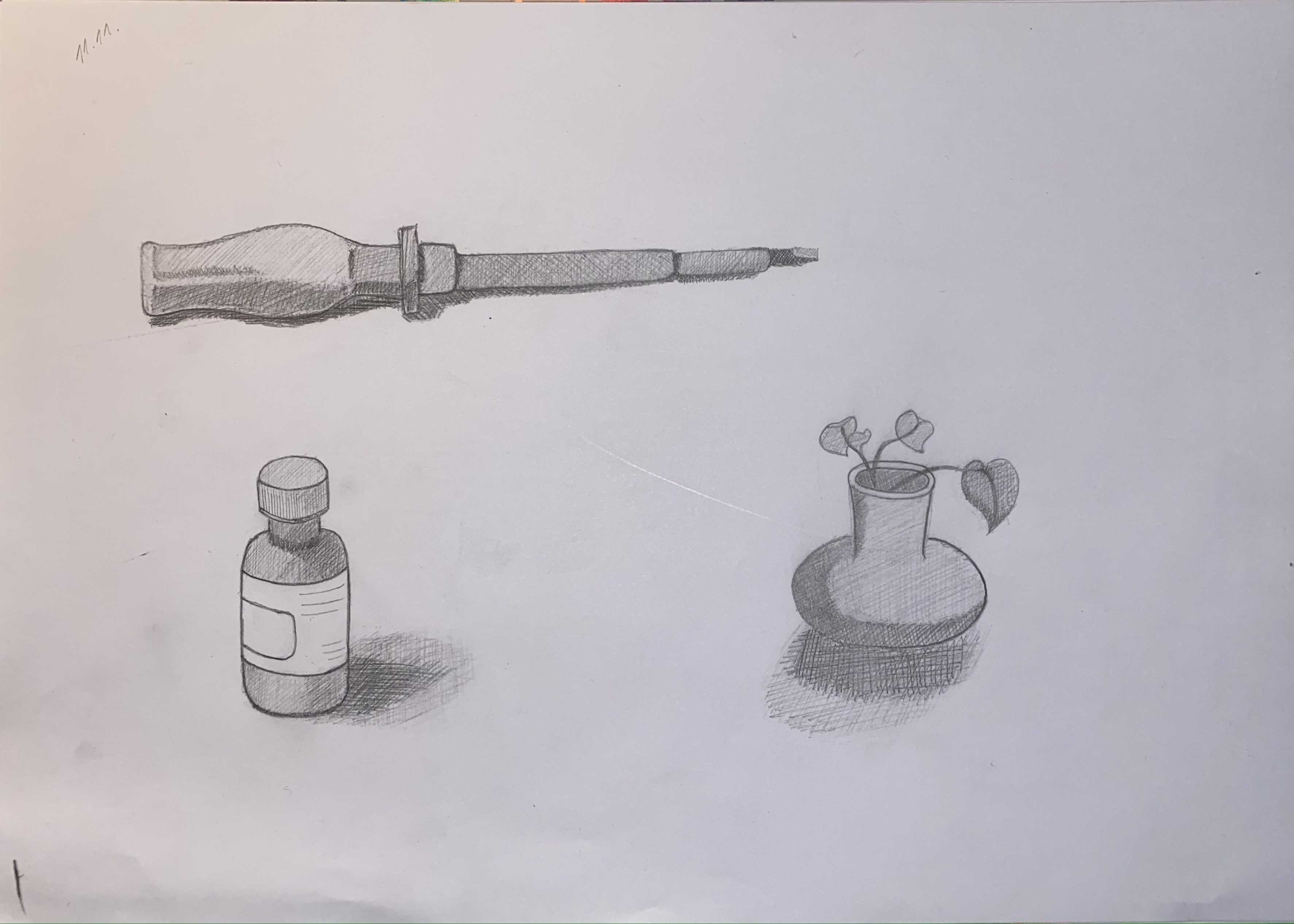 J'aime beaucoup le rendu des hachures, fin comme ça ça rend bien, et tu as bien réussi à faire différentes teintes bien contrastées, ça fonctionne bien. Le souci vient surtout du fait que tu n'as pas fait de dégradé, mais des zones d'ombre très nettes. Le flacon a des prémices de dégradés qui fonctionnent bien tout de même. Essaie en partant de tes zones d'ombres d'étaler ça en desserrant progressivement tes hachures et appuyant moins progressivement. Tu peux t'entraîner aux dégradés séparément aussi. Sinon l'étiquette du flacon mérite un peu d'ombre aussi ! Quelques améliorations à aouter donc, mais un beau travail de base :)
