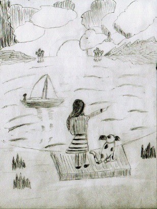 Dessin complet et inventif, c'est sympa :) Au niveau du dessin en lui même il y a quelques points à améliorer, comme les proportions de la fille (jambes trop courtes par rapport au corps par exemple) et de perspective (le bateau est un peu trop petit, ou alors ce sont la fille et son chien qui seraient trop gros). Le truc sur lequel sont les personnages (un ponton ?) se fait rogner sur le haut par le lac, c'est un peu étrange.