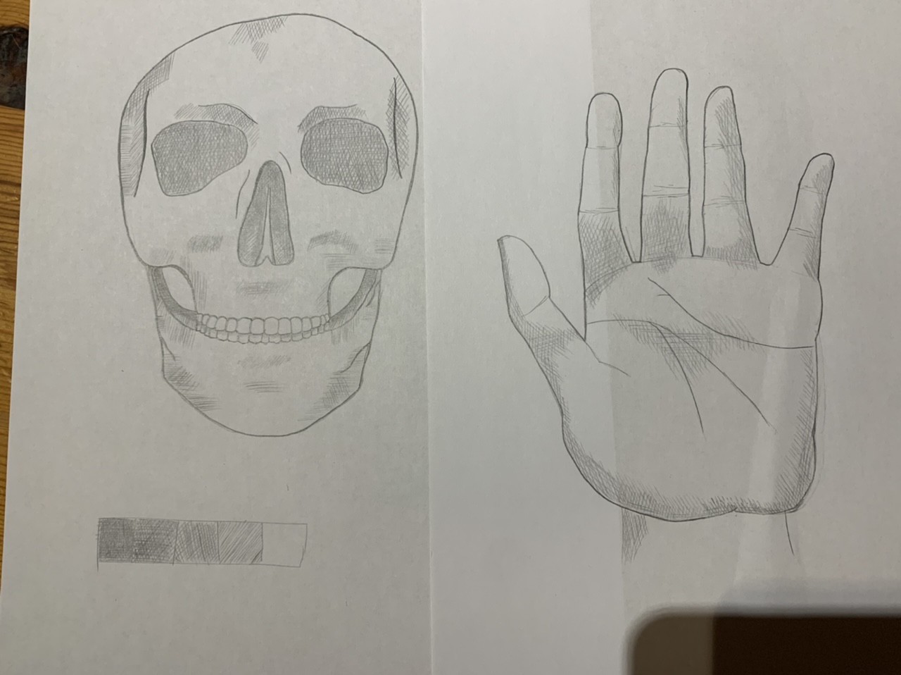C'est pas mal, les hachures ont un style plutôt homogène, ça rend bien. Pa contre ça manque un peu de contraste et de dégradés. Tu peux aller encore plus foncé dans les zones d'ombre comme les orbites du crâne par exemple, et aussi sur ton échelle de valeurs ont passe trop vite du dernier gris encore assez foncé au blanc. Il faudrait un gris intermédiaire, avec des hachures plus écartées. ça te permettrait détaler plus loin tes dégradés, car il y a encore beaucoup de blancs sur tes dessins, donc de volumes pas complètement rendus en détail, comme si il y avait une lumière très forte qui crame un peu les images. Pense aux objets comme ne partant pas du blanc mais d'une teinte de gris, le blanc n'étant réservé qu'aux lumières fortes. En tous cas il y a de bonnes bases, c'est juste à étoffer un peu :) Pour ce qui est des formes attention aux distances entre les éléments sur le crâne, la boîte crânienne est trop petite, les dents aussi. Pour la main l'auriculaire est un peu petit et devrait avoir sa forme qui se tourne légèrement vers l'intérieur de la main plutôt que l'extérieur, mais c'est pas mal, c'est difficile les mains ^^ Il y a donc des choses à pousser un peu plus mais c'est du bon travail :)