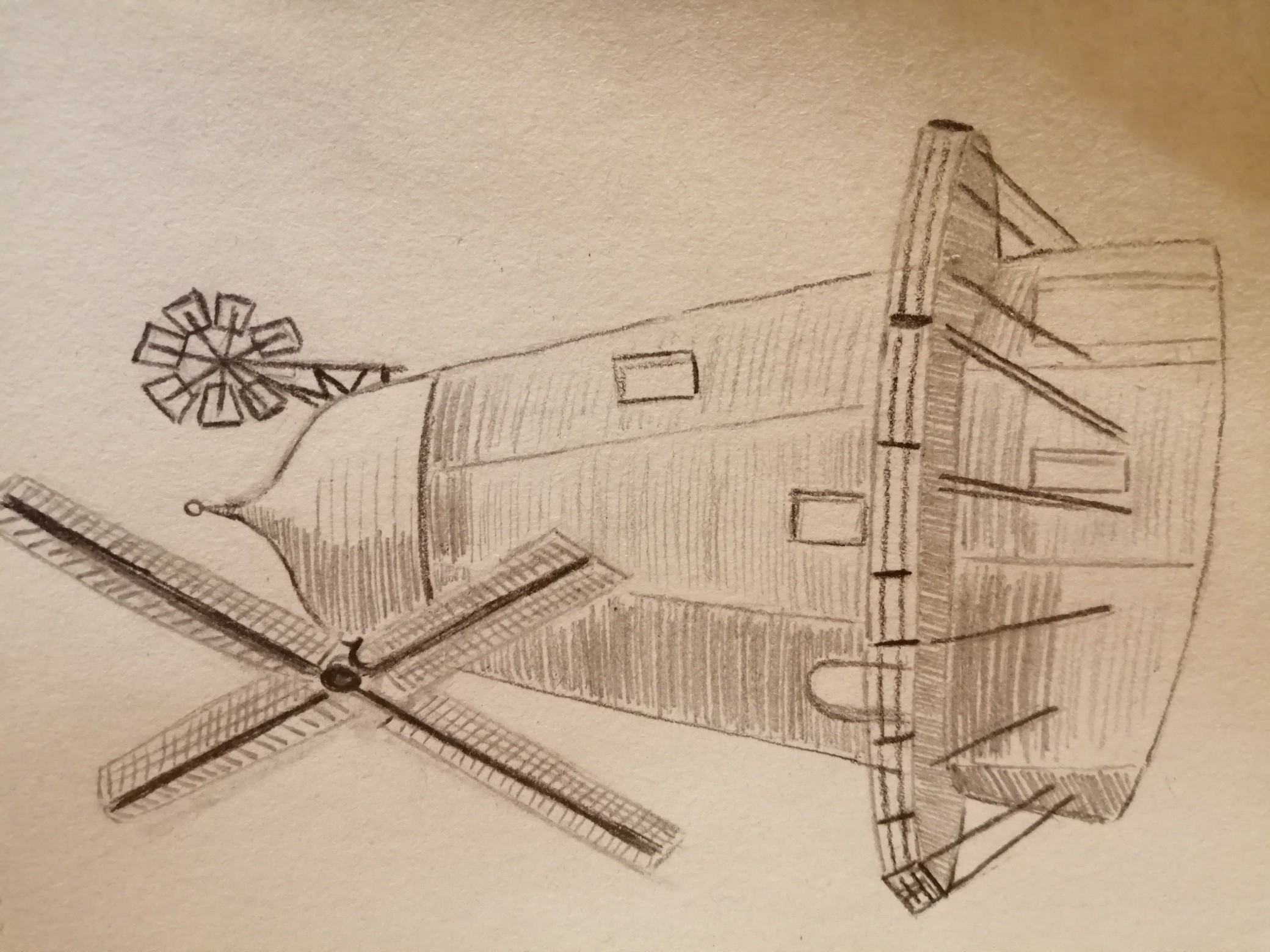 Joli travail, il est chouette ce moulin :) Le souci principal est le manque de dégradés, on passe directement d’une valeur à l’autre plutôt que mettre en valeur le côté arrondi en faisant plus de croisillons dans le plus foncé et déserrer les traits et moins appuyer progressivement en s’approchant de la lumière. On aurait aussi plus de contraste sur le corps du moulin. aussi sur les pales du moulin les croisillons donnent une impression de grillage, ça pourrait se corriger en penchant plus l’un des sens de hachures et en les serrant différemment pour avoir moins un effet de carrés en perspective. En tous cas le rendu est très joli et le sens des hachures suit bien les formes. Bien joué :)