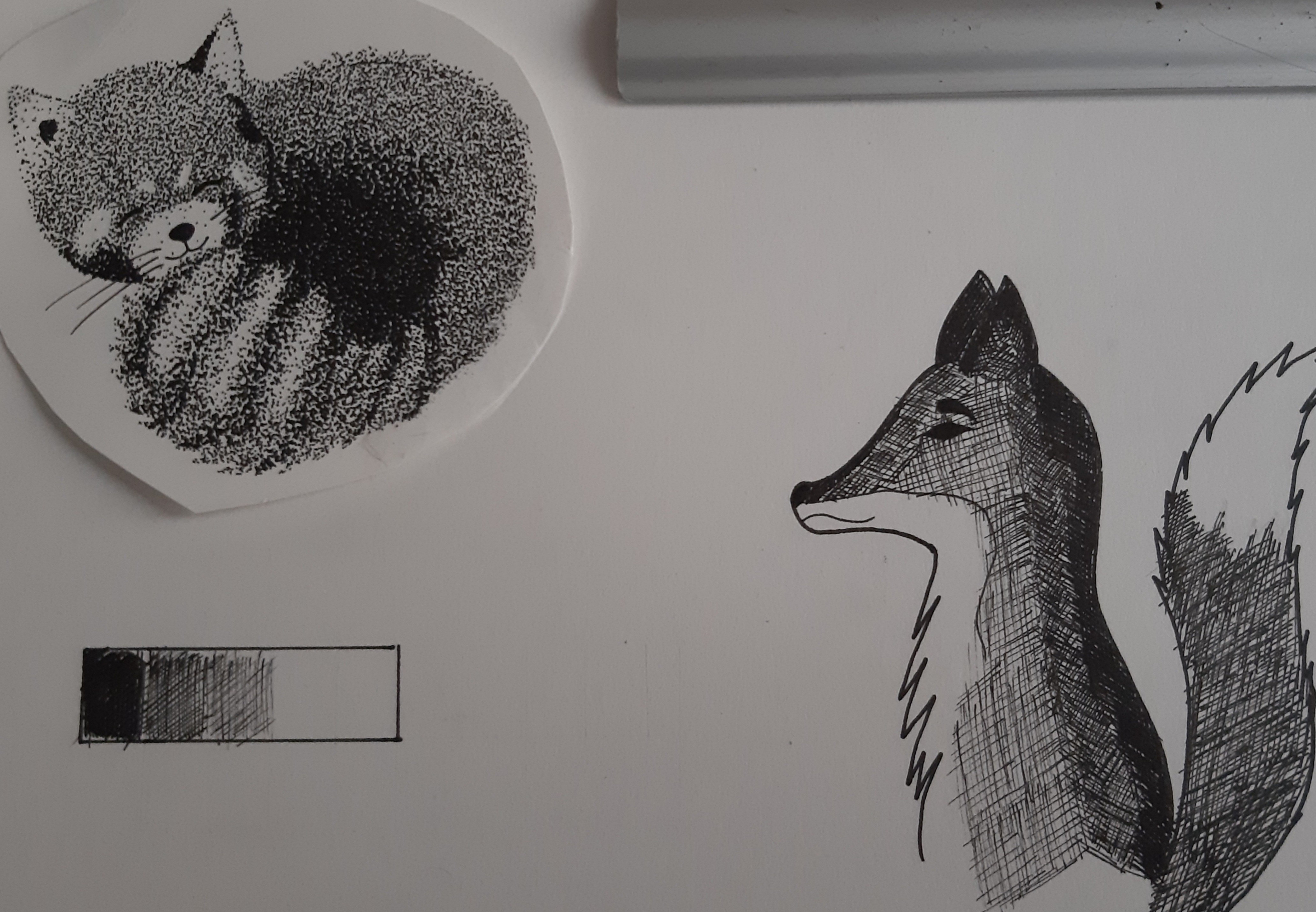 Oh super mignon ton panda roux, j'aime beaucoup, il est bien contrasté et les dégradés sont plutôt réussis. Après ce sont des pointillés, pas des hachures, mais il est très bien ^^ Pour le renard là ce sont bien des hachures ^^ Il est bien contrasté aussi, mais il y a des petits détails à améliorer. Attention au côté un peu fouillis de tes hachures du au fait que tu changes souvent la direction de tes hachures sans trop de raison. Tu as mis une grosse ombre dans le dos de ton renard, mais tu n'as pas ombré le côté droit de la queue. La lumière est la même donc la queue devrait avoir son ombre aussi ^^ Sinon tes niveaux d'ombres s'arrêtent vraiment nets, il faudrait que tu t'entraînes à faire des dégradés plus progressif, desserrer progressivement tes hachures quand tu t'éloignes de l'ombre. En tous cas le principe des hachures en lui même est bien compris, joli travail !