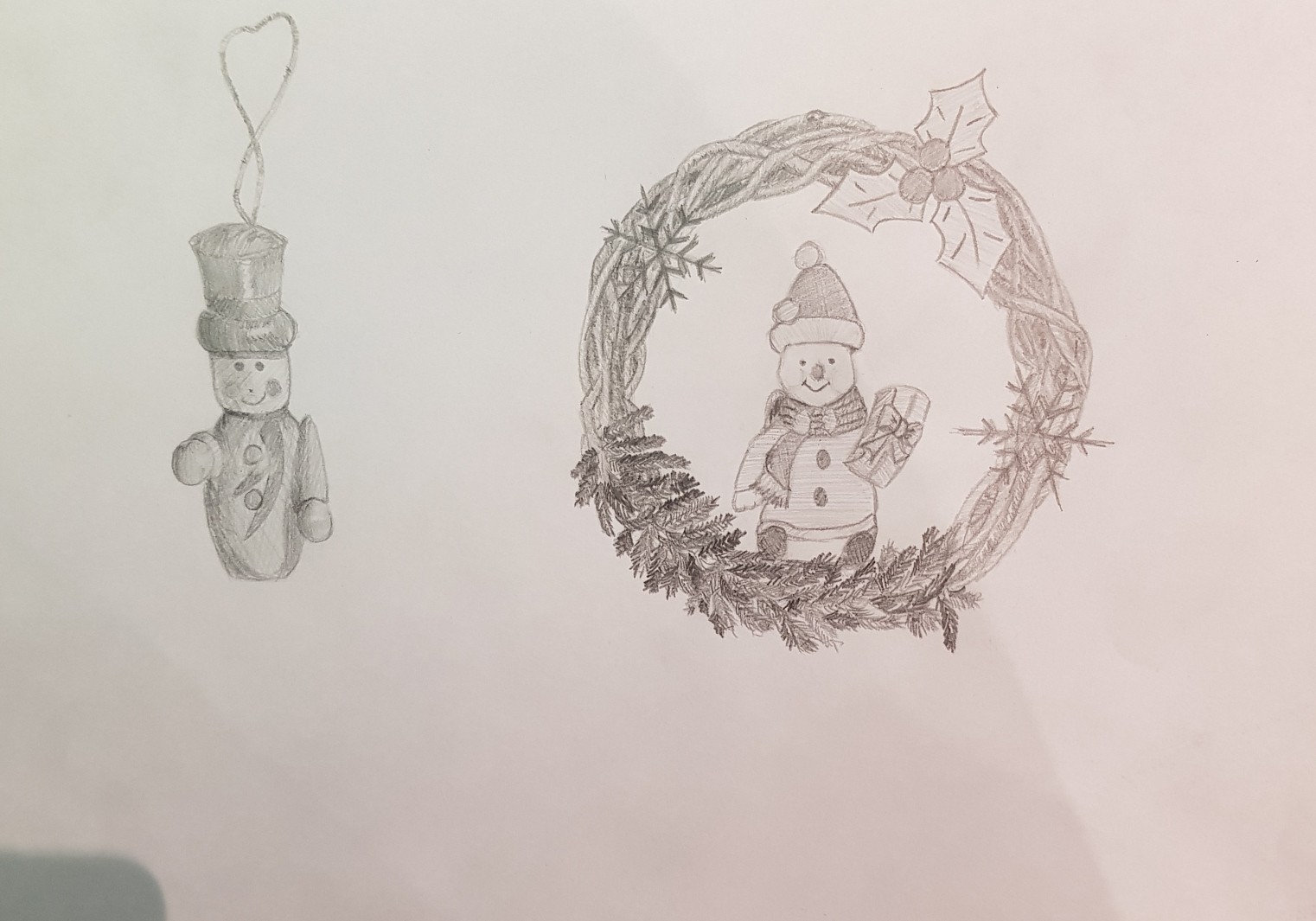 C'est chouette ! les hachures sont bien travaillées ! Ce que je remarque c'est qu'on manque un peu de contraste, ce qui fait qu'on a un peu de mal à délimiter certaines formes comme sur les branchages entremêlés. Faire les petits creux et le bords des formes plus foncés déterminerait mieux les volumes, comme tu as fait en dessous de la tête du petit bonhomme de bois. Certains endroits sont un peu plats par rapport à d'autres, par exemple le houx et le bonhomme de neige. ça serait encore mieux si les ombres étaient travaillées comme ta première figurine. C'est en tous cas bien soigné et travaillé, bravo :)