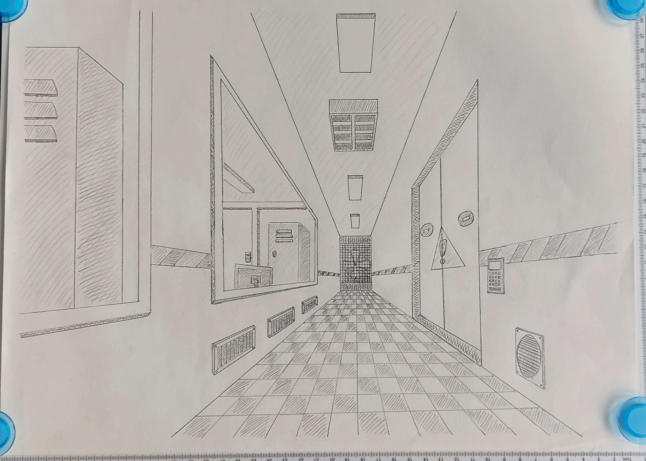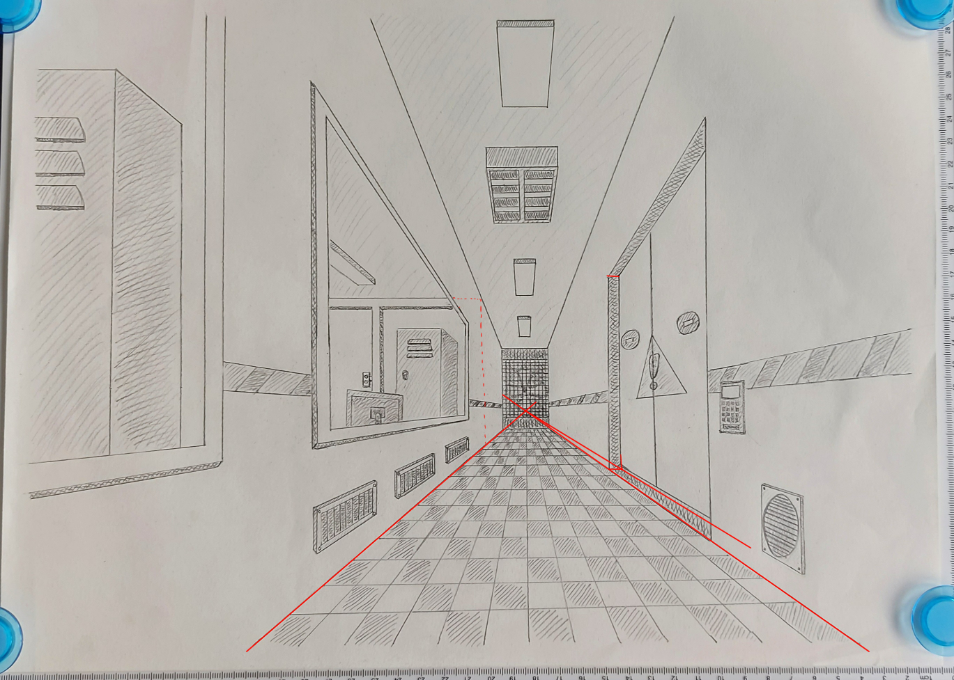 Joli travail :) Le positionnement du plafond fonctionne, j'ai montré en pointillés où se place le fond de la salle telle qu'elle a été faite. Le ventilateur ne me dérange pas. Par contre pour les pièces à gauche, faire l'épaisseur du mur a été oubli" ! Concernant les hachures, c'est la bonne chose à faire de ne pas faire de traits parallèles ou perpendiculaires aux formes car ça fait un effet "grillage" pas idéal. Par contre c'est bien de garder un sens de hachures adapté aux volumes ou bien toujours dans les mêmes sens. Il y a quelques irrégularités à ce niveau là mais rien de bien choquant. Ce qui pourrait être ajouté serait une ambiance lumineuse à la scène, les hachures servant aussi à créer des ombres et lumières. En tous cas l'exercice est bien réalisé :)