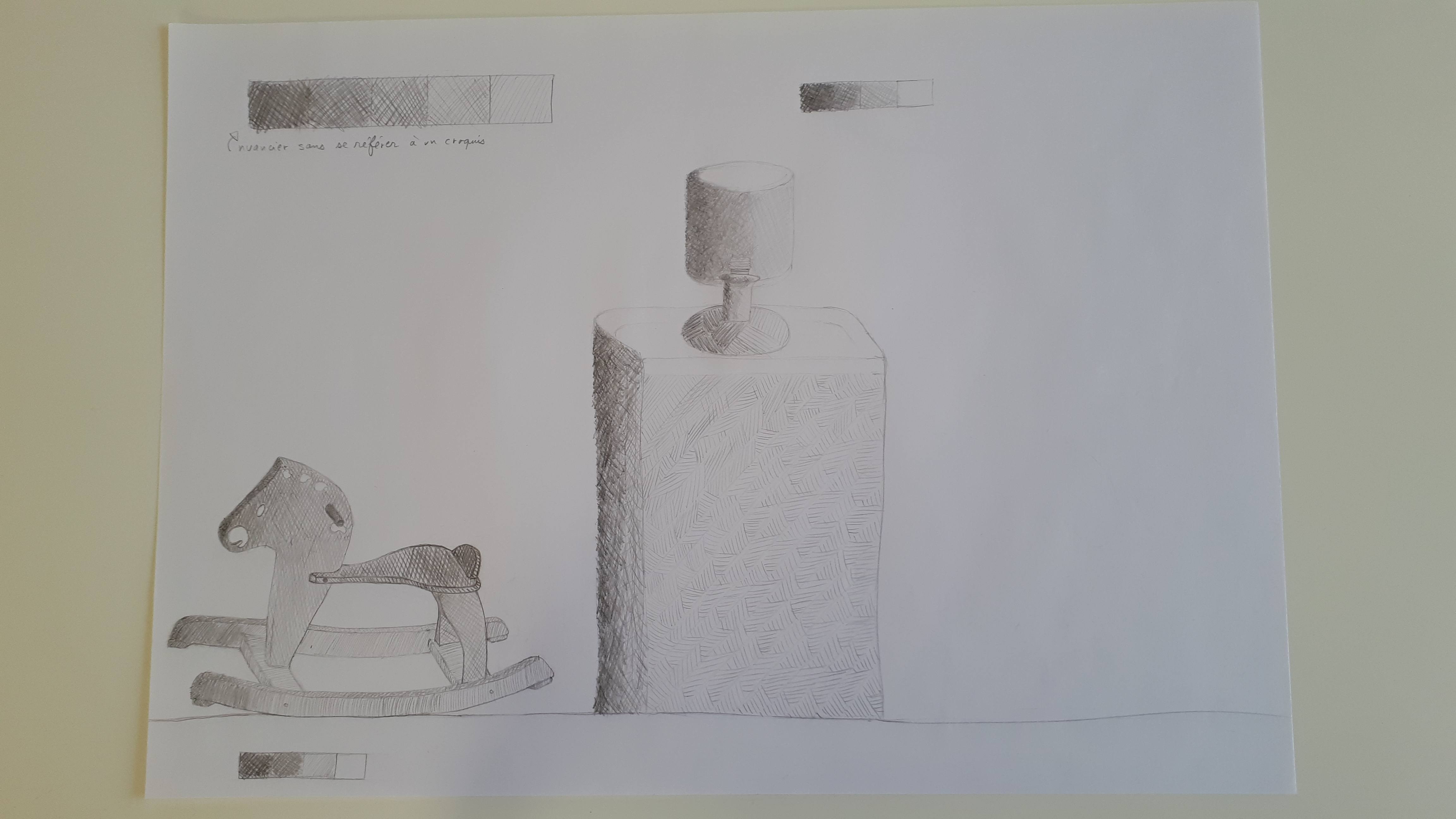 Joli travail, contrasté comme il faut :) Le cheval à bascule est bien réussi. Pour la lape et son support, attention à garder des types de hachures similaires pour rester homogène. Attention également au bord des formes qui fait un peu un effet "poils". Venir gommer les bords et redéfinir le contour peut aider à rendre ça plus propre. C'est compris en tous cas :)