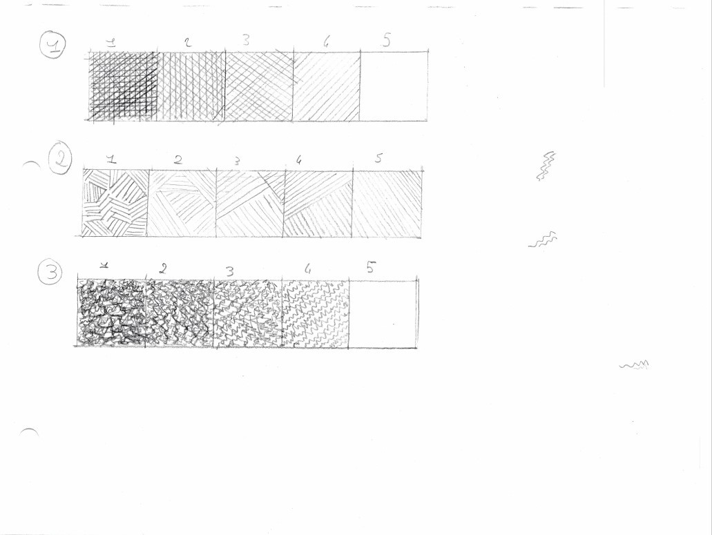 Pour la 3ème ligne c'est sympa, ce ne sont pas des hachures classiques ^^ Malgré les "zigzags" je pense que ça reste des hachures vu que pour chaque direction les traits sont parallèles entre eux. Bon travail !