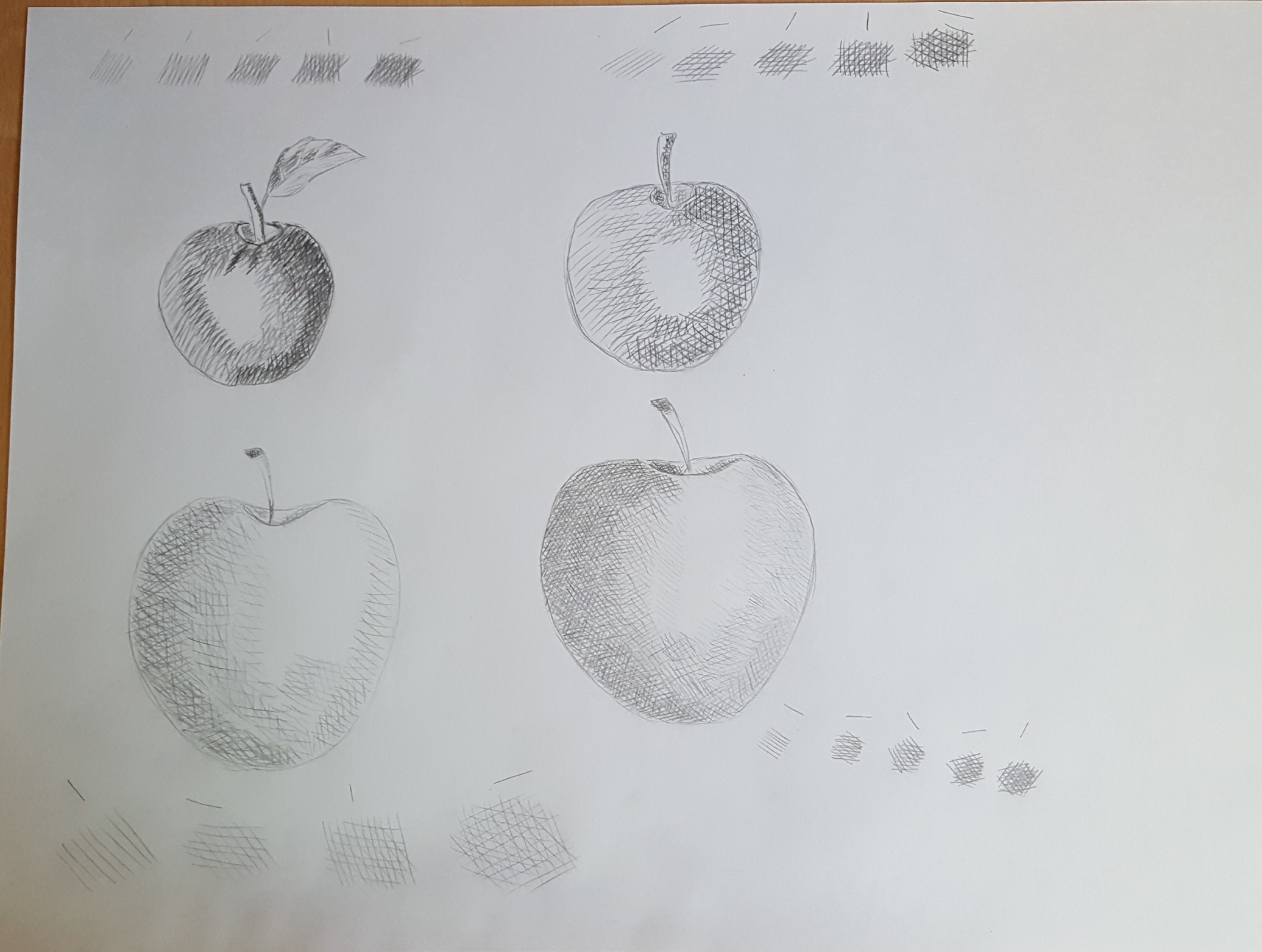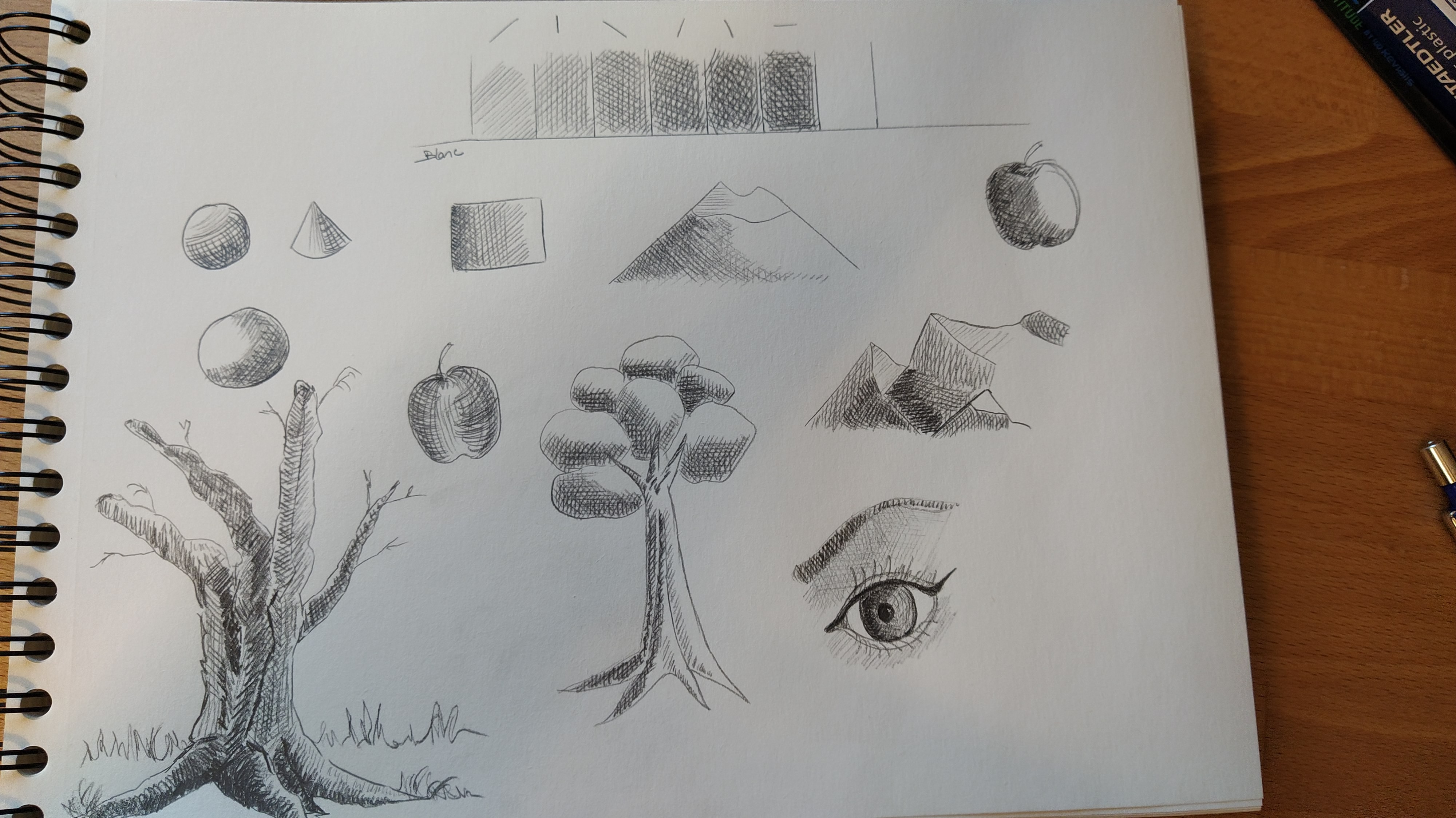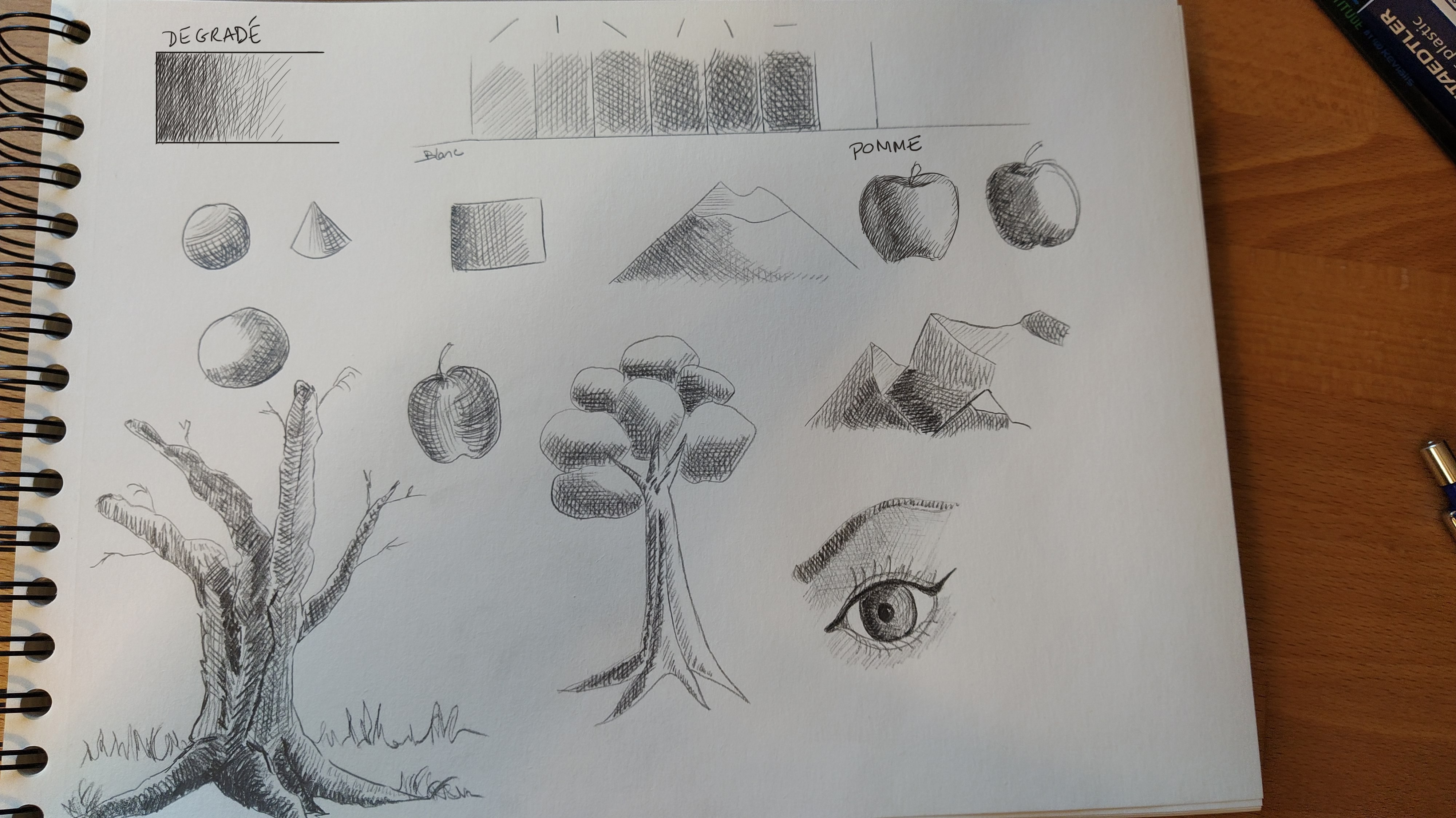 Comment puis je m'améliorer sur ce point? y a t il des exercices type? j'ai bcp de mal à ressentir les ombres et à faire des formes arrondies en hachures (cf mes pommes) on dirait qu'elles sont poilues, pas du tout l'effet souhaité... merci