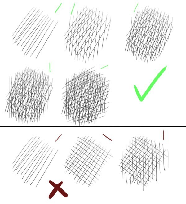 Il existe pleins de type de hachures, mais tu sembles avoir un style de base similaire à mes hachures favorites, je te remets donc ci-joint le petit tuto que j'avais fait.