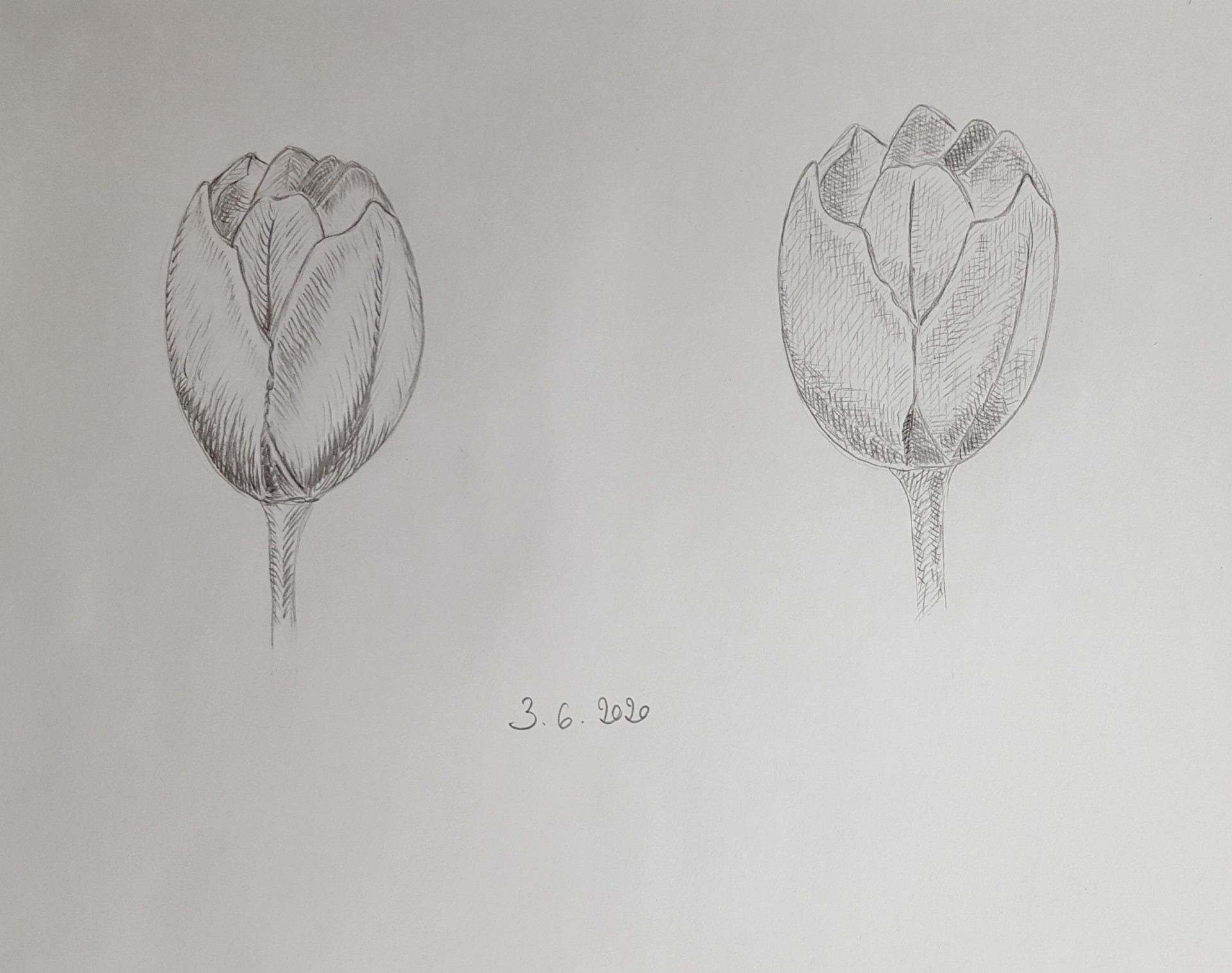 Ton dernier essai en bas à droite pour la pomme est chouette. C'est propre et clair. N'hésite pas à contraster davantage (un peu plus comme la première qui est plus sombre tu vois ?). Mais sinon c'est cool. Pour tulipe, ton premier essai est nettement meilleur à tout point de vue. Le contraste et le volume sont bien mieux gérés. Tu as différents types de hachures, si tu préfères des hachures qui suivent le volume des objets, c'est pas du tout un souci; La seule chose, c'est qu'une fois que tu choisis un type de hachures, il faut t'y tenir sur l'ensemble du dessin. Attention à bien contraster ton objet (ta tulipe de droite est beaucoup plus plate (volumes mal placés) et moins contrastée, ce qui la rend moins intéressante. Ce n'est pas le type de hachures qui change ses éléments ^^