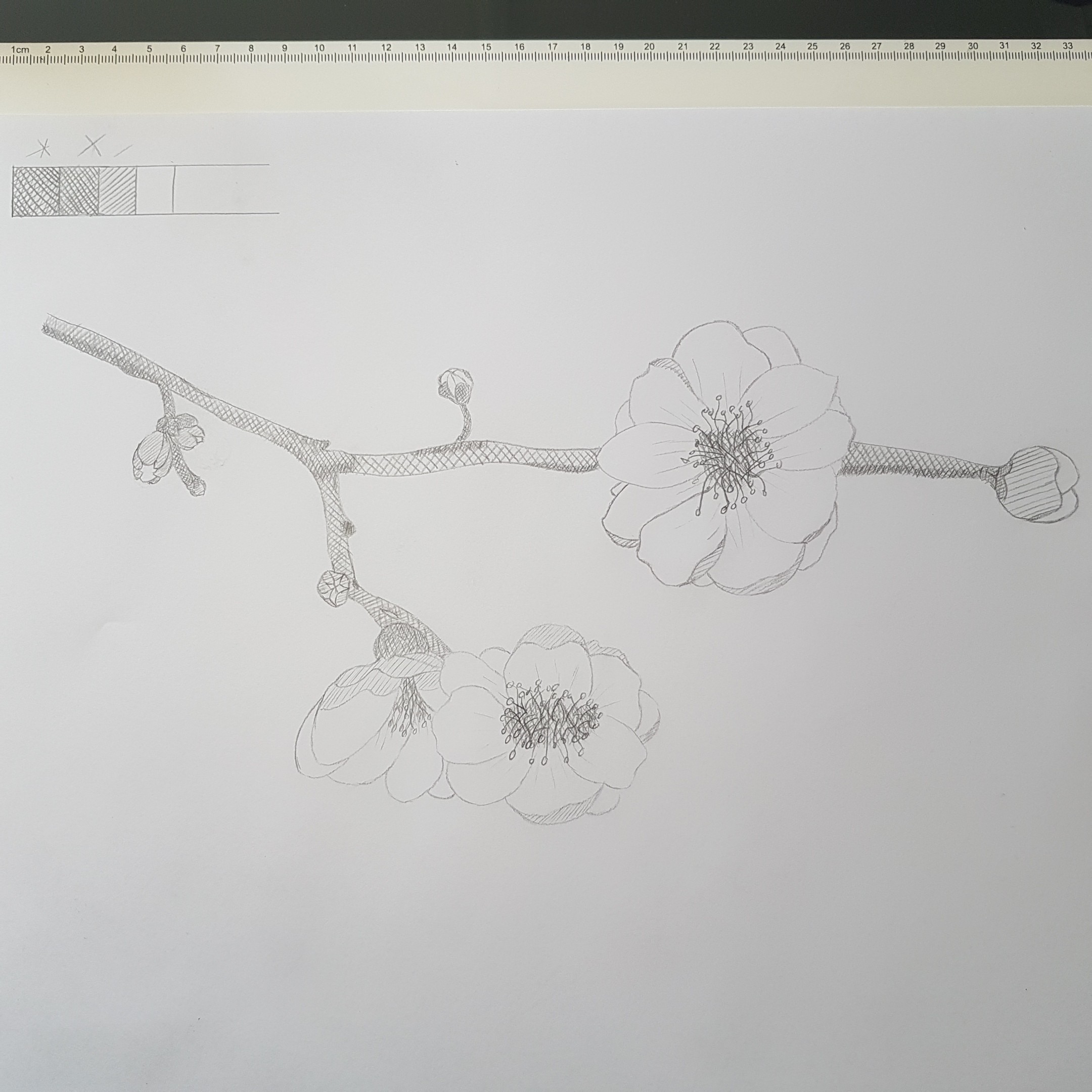 Tes valeurs à proprement parler sont bien, même s'il en manque pas mal sur les fleurs elle-même je pense. Mais tes hachures telles quelles brouillent le volume. Je te joins mon petit tuto pour faire des hachures qui n'entreront pas en conflit avec le reste du dessin :)