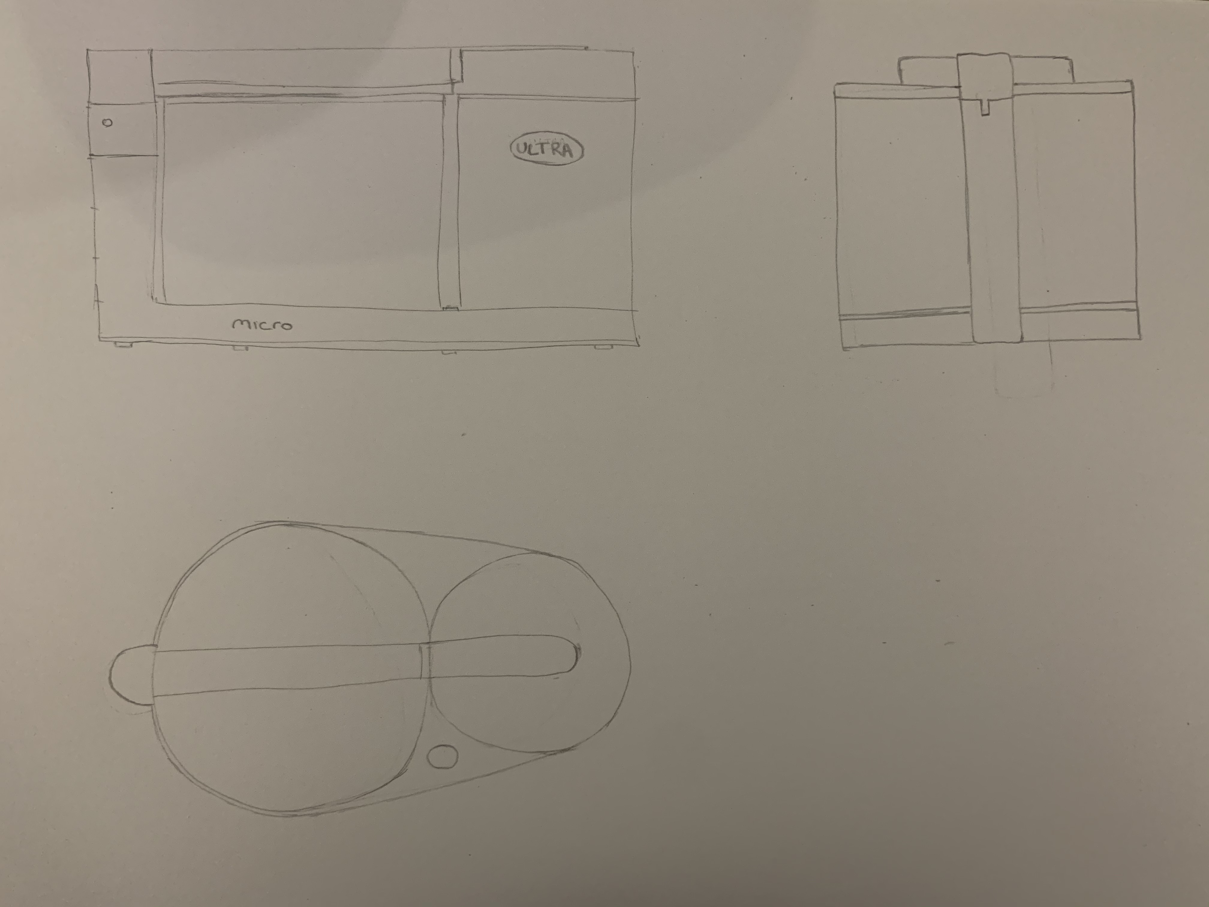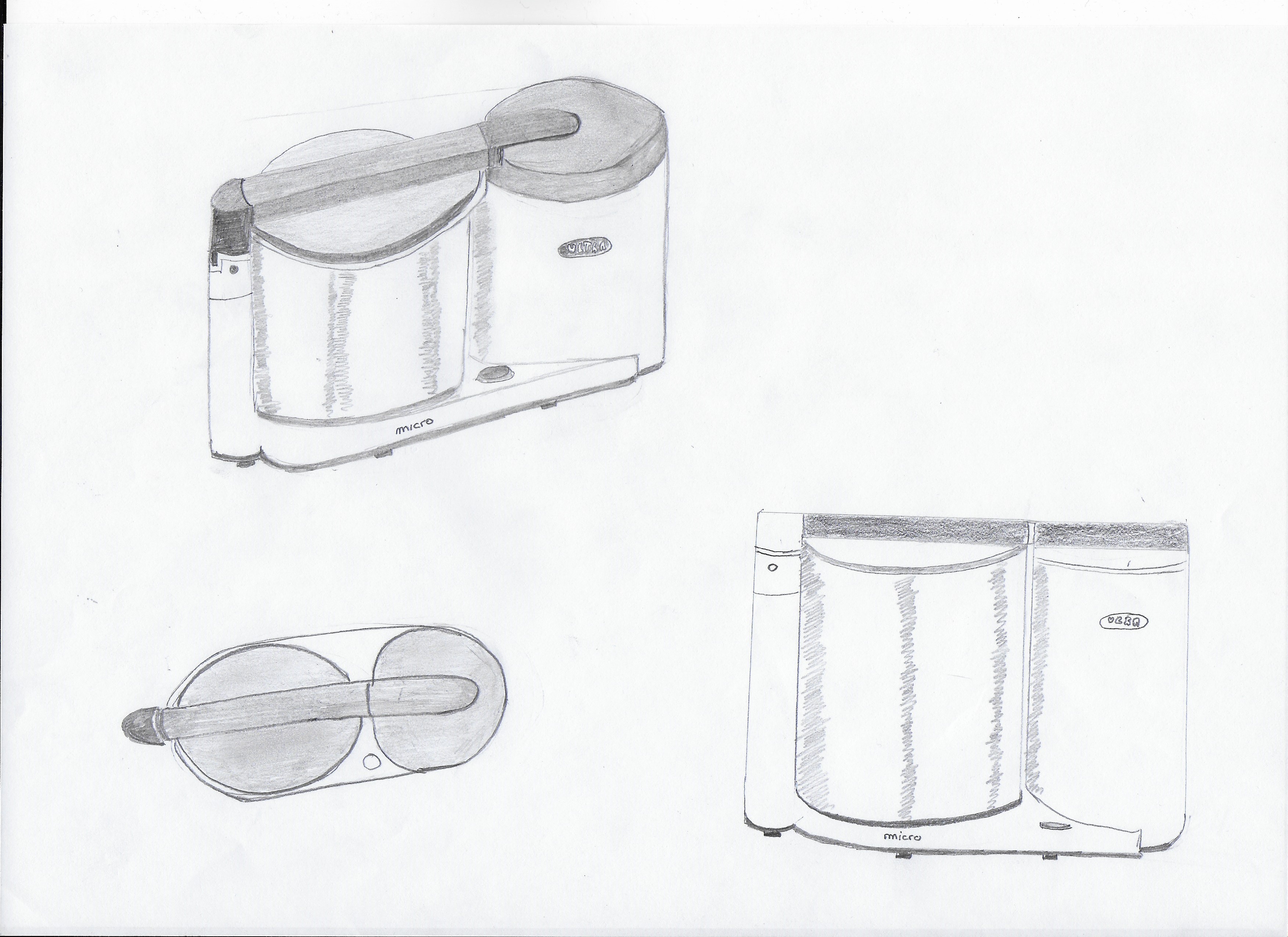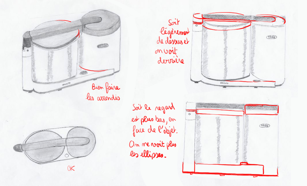 Donc pour ton robot ménager, tu as bien compris comment il fonctionne, tes dessins sont bien :) C'est cool que tu comprennes l'intérêt de faire tourner les objets et que ça te soit utile :) Par contre, à part ta vue de dessus, tu n'as pas fait de vues bien de face ou de profil. Tes dessins sont toujours un peu vus de dessus et pas bien "en face". Par exemple si tu prends un verre dans ta main, vu d'un peu de dessus tu verras une ellipse, mais si tu descends par rapport à ton verre et que tu es bien en face, ton ellipse s'aplatit et se transforme en droite. Tu dois faire des vues en t'imaginant faire tourner ton robot ménager à partir de ce niveau de regard. Je te joins un croquis avec l'exemple du verre ;) L'intérêt de ces points de vues "orthographiques" (ortho = droit) est de bien se concentrer sur les blocs et leurs mesures, et d'avoir des références toujours dans les mêmes angles pour avoir toutes les infos pour faire d'autres points de vues plus "en perspective" par la suite ^^