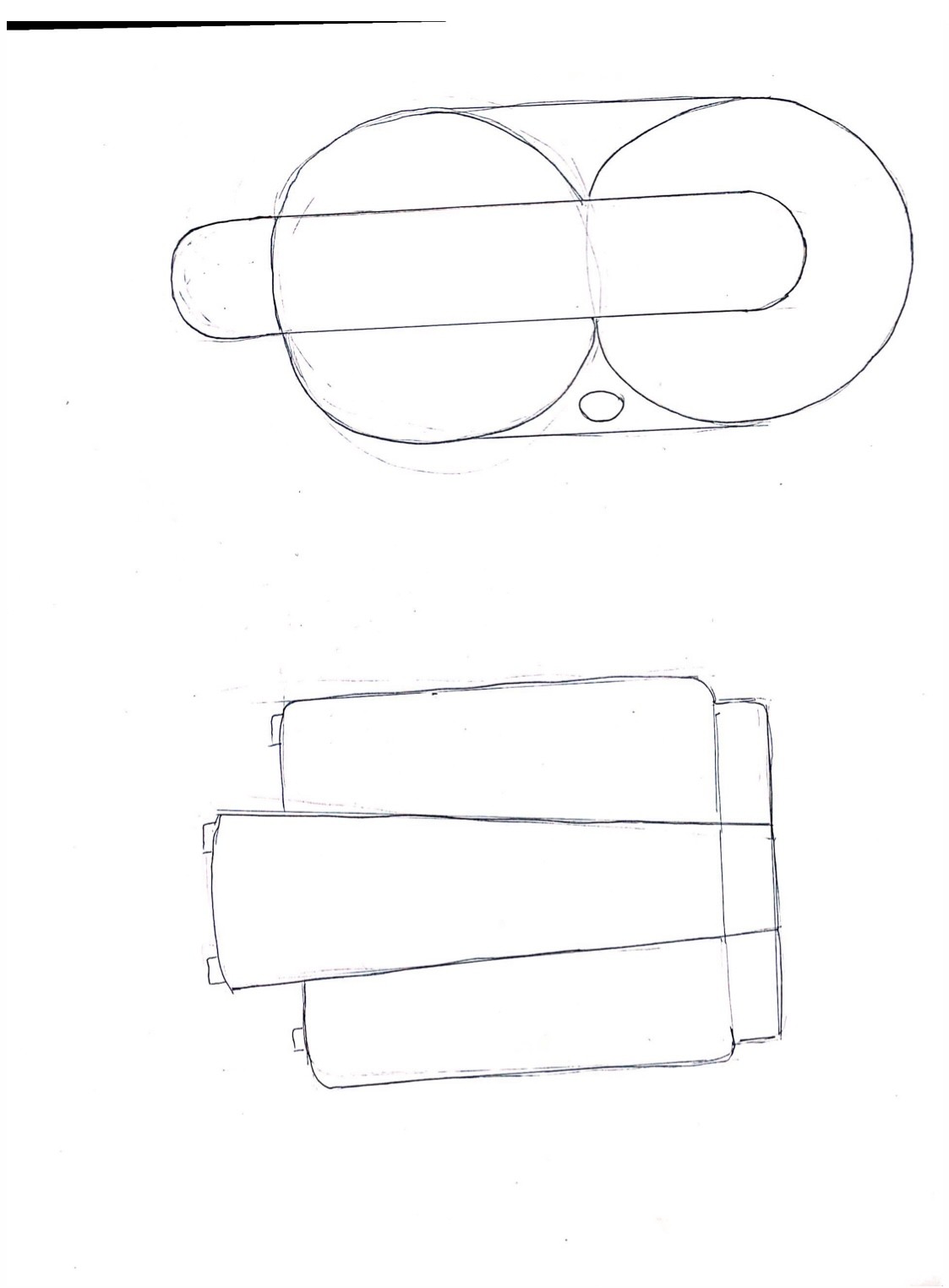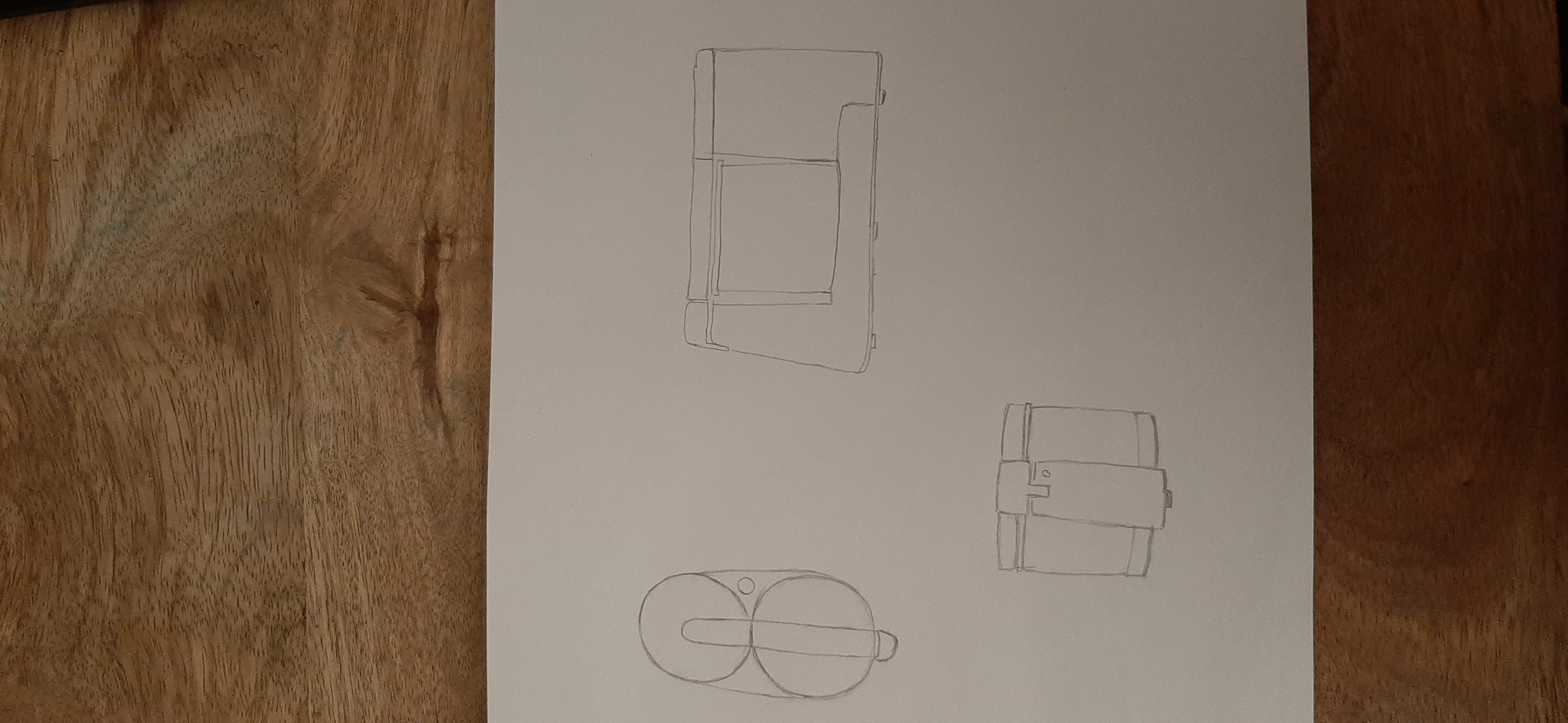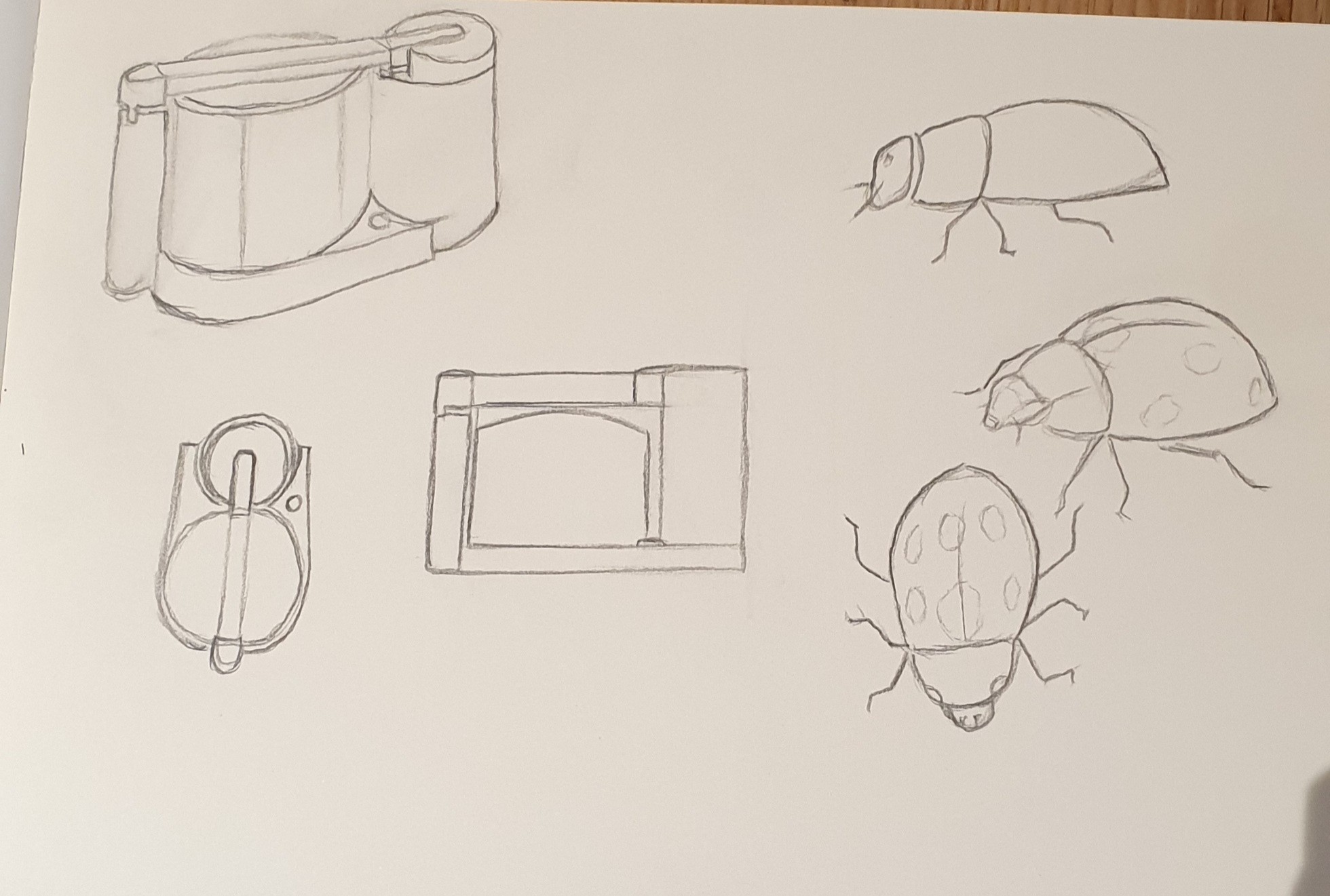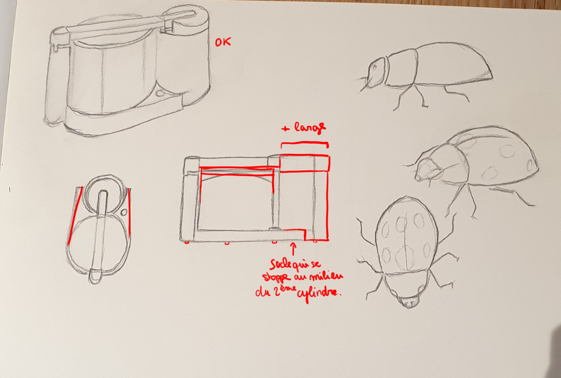 L'objet est bien compris, tous les éléments sont bien agencés ensemble :) Attention par contre pour tes deux robots sur la droite on dirait que le bas des objets est vue de dessus, ça devrait être plus droit comme tu as fait pour le haut. Pour la version au milieu c'est chouette mais ce n'est pas totalement de face vu que ta vue est légèrement de dessus. Pour une vue avec le regard bien en face donc au milieu de l'objet ça serait plus droit et on ne verrait pas le dessus des cylindres et du socle. En bas à gauche c'est pas mal mais le bas de tes cylindre n'est pas assez arrondi. Tu t'es lancée sur une perspective avec point de fuite mais elle est assez exagérée ça se réduit beaucoup vers le fond surtout pour la barre du dessus, je pense que la ligne d'horizon devrait être plus loin vu qu'on est assez vu de dessus. Mais les exercices sur la perspective c'est pour plus tard donc passons ^^ Vue de dessus nickel :) Il y a donc des détails à modifier mais globalement c'est du bon travail :)