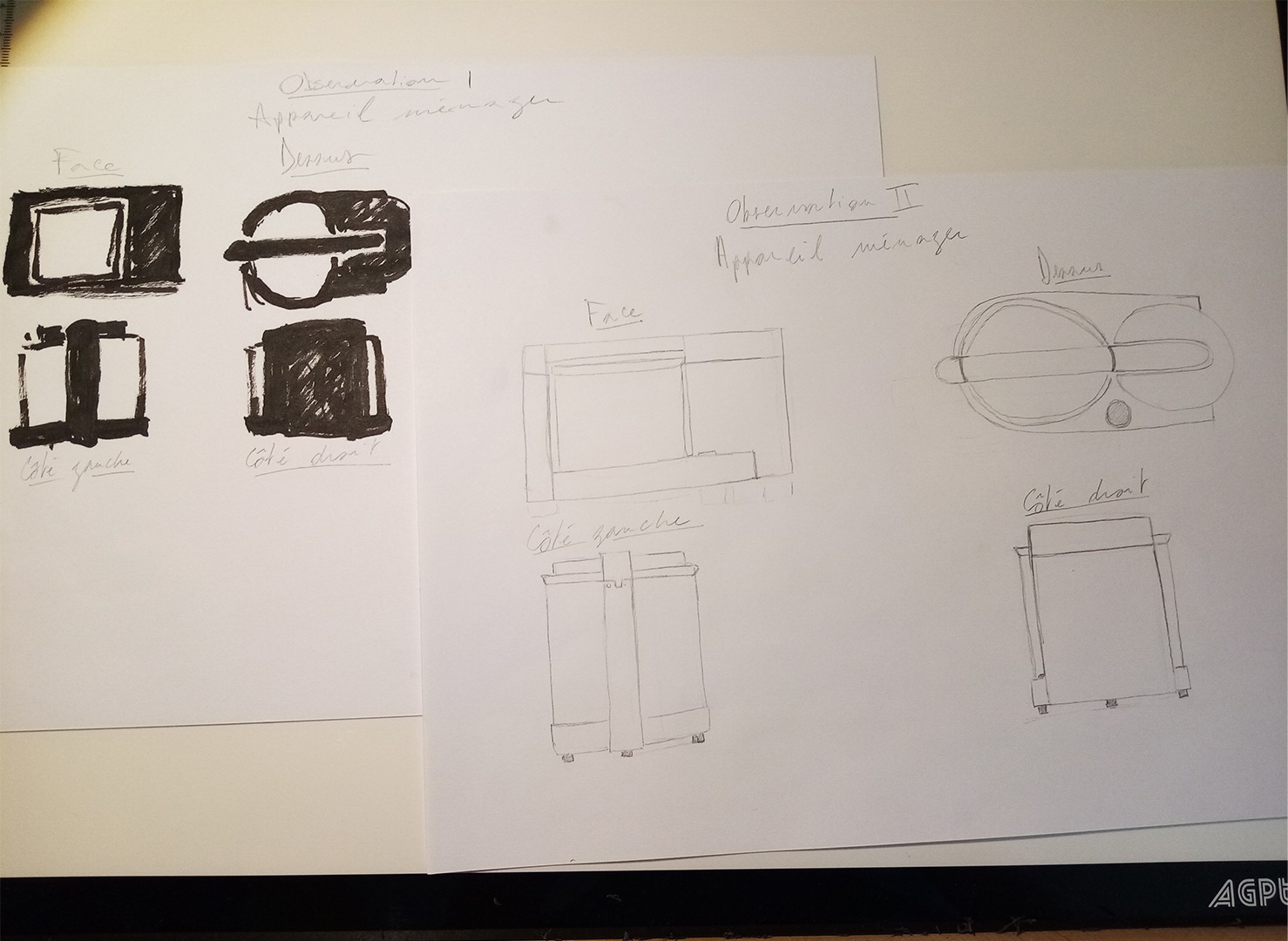 Bonjour, voilà mes croquis pour l'appareil électroménager. Qu'en pensez-vous ? Je me demandais si je n'étais pas déjà trop dans le détail. A cette étape de l'observation, devrais-je me cantonner à des formes plus figuratives ? Merci d'avance pour votre correction !