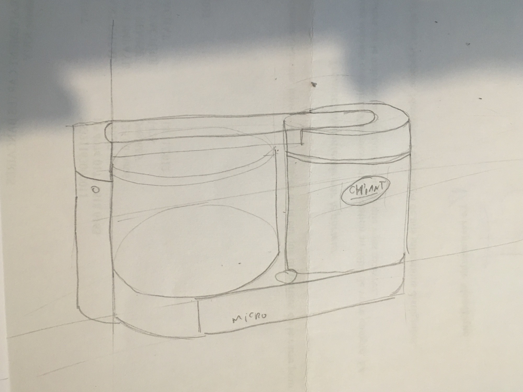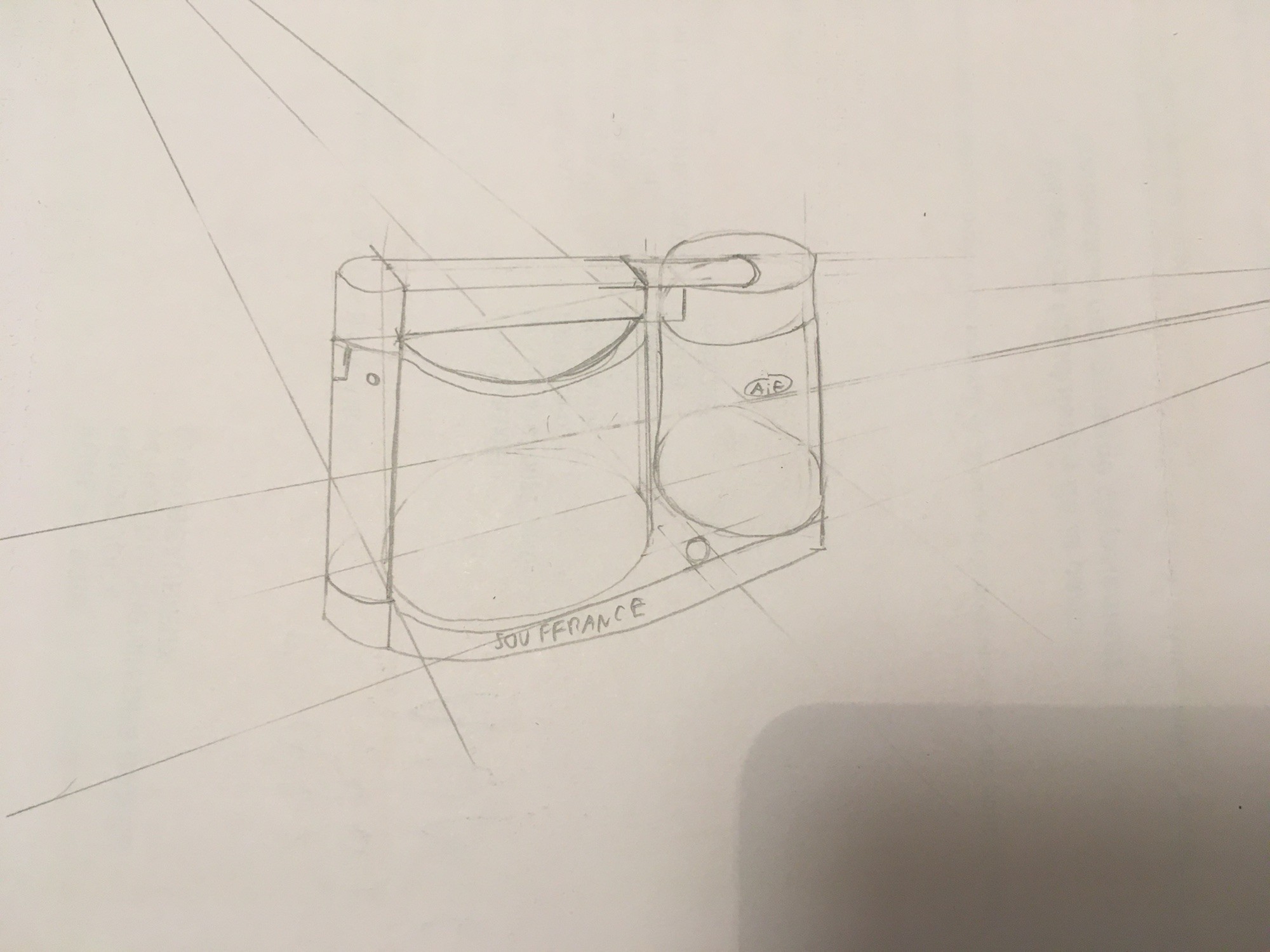 Ah j'avais pas vu celui là ! La leçon sur la perspective c'est plus tard, tu t'embêtes trop tôt x) Aussi, dans un dessin il n'y a qu'une ligne d'horizon, et là tes 2 points de fuite devraient tous les deux être dessus, donc ton point de fuite du haut t'induis en erreur. Sur cet exercice on voulait surtout voir si les proportions et la construction de l'objet étaient justes, donc ne t'embêtes pas plus avec ce dessin, je retiendrai plutôt le premier ^^