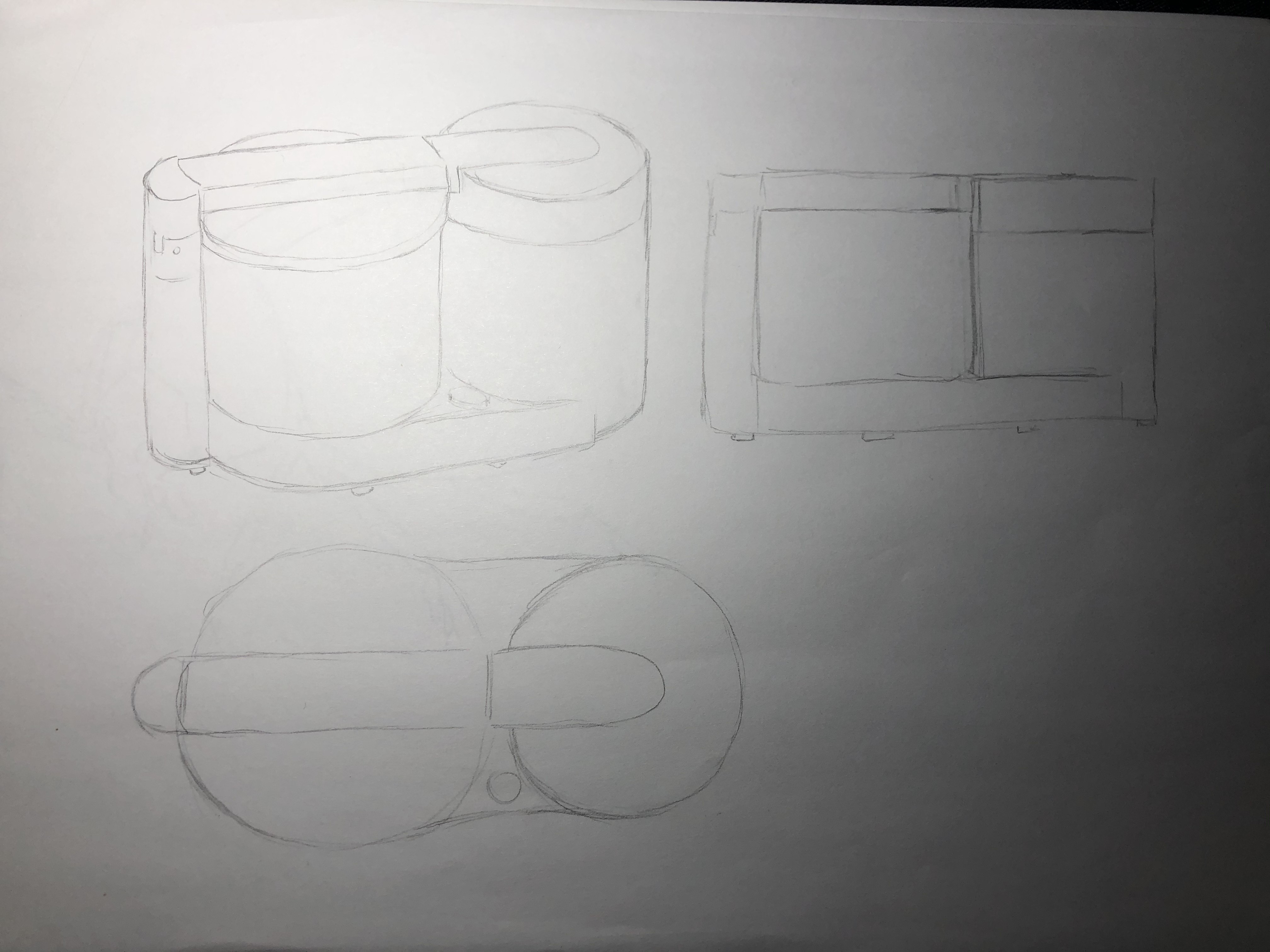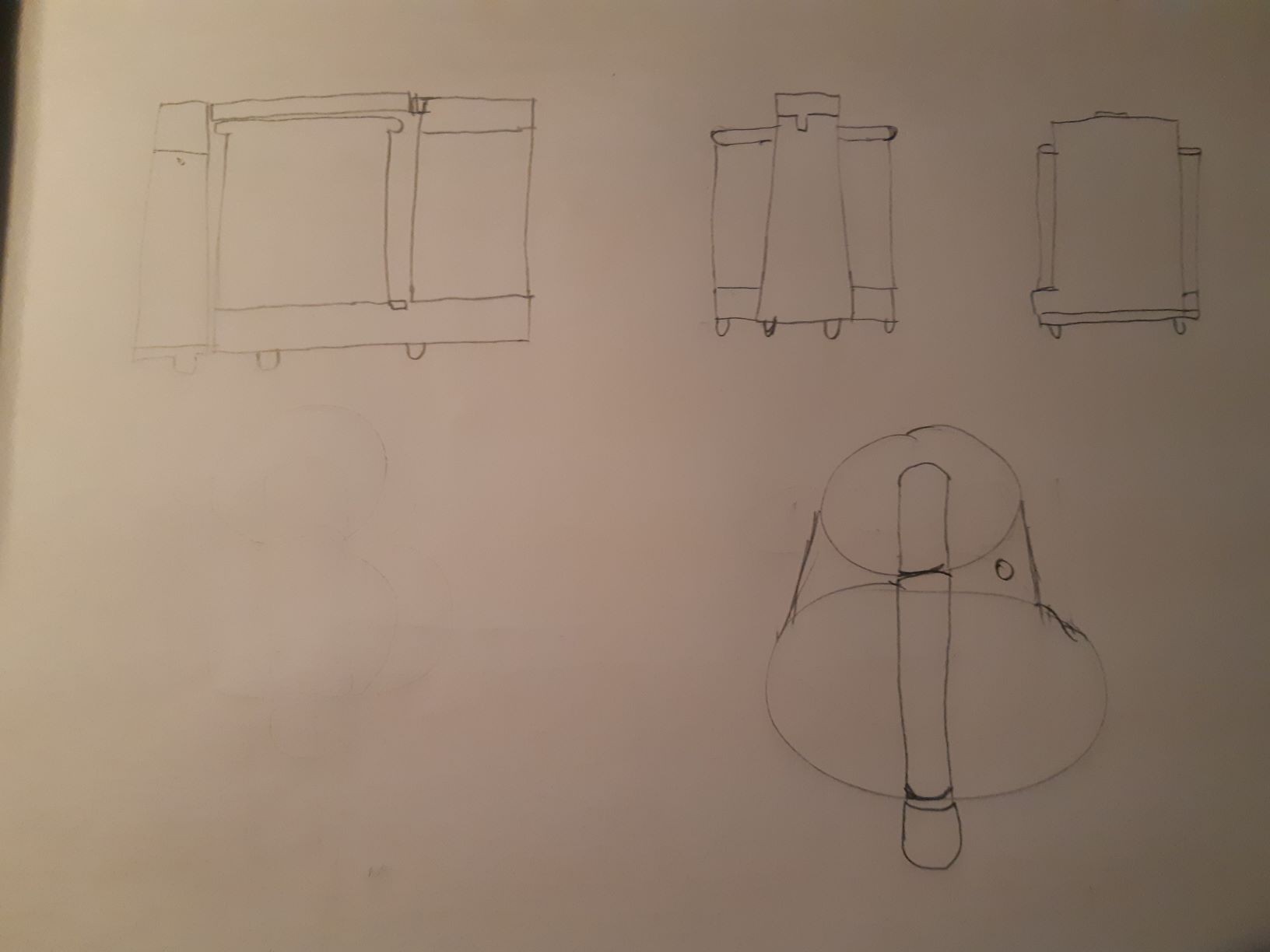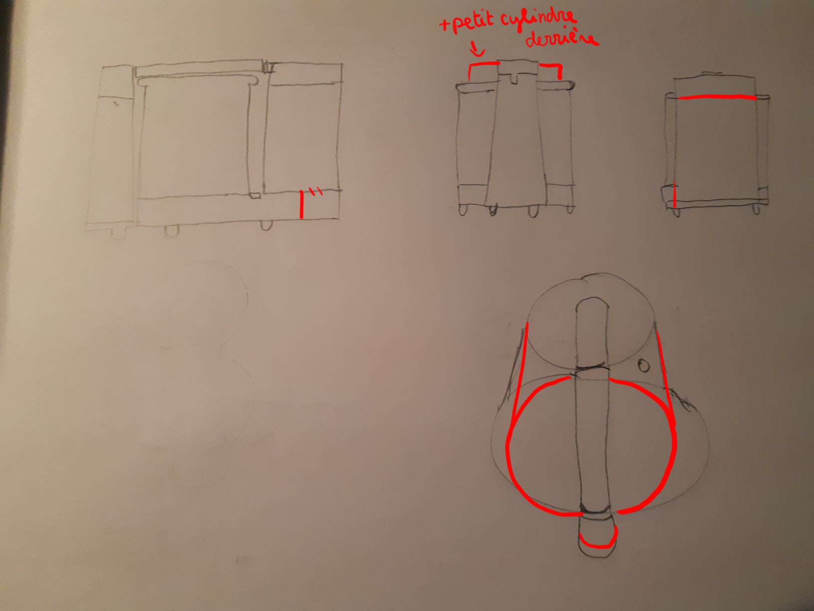 Pour ce qui est des autres vues, bien compris aussi. Attention juste le cylindre de droite est un peu moins large que l'autre, ça devrait se voir sur tes 2 vues en haut de ta feuille. Pour la vue en bas, il manque le deuxième cylindre plus petit qui devrait dépasser derrière, à hauteur du pilier de devant. Voilà, bon travail en tous cas. Allez, ça c'est fait ;)
