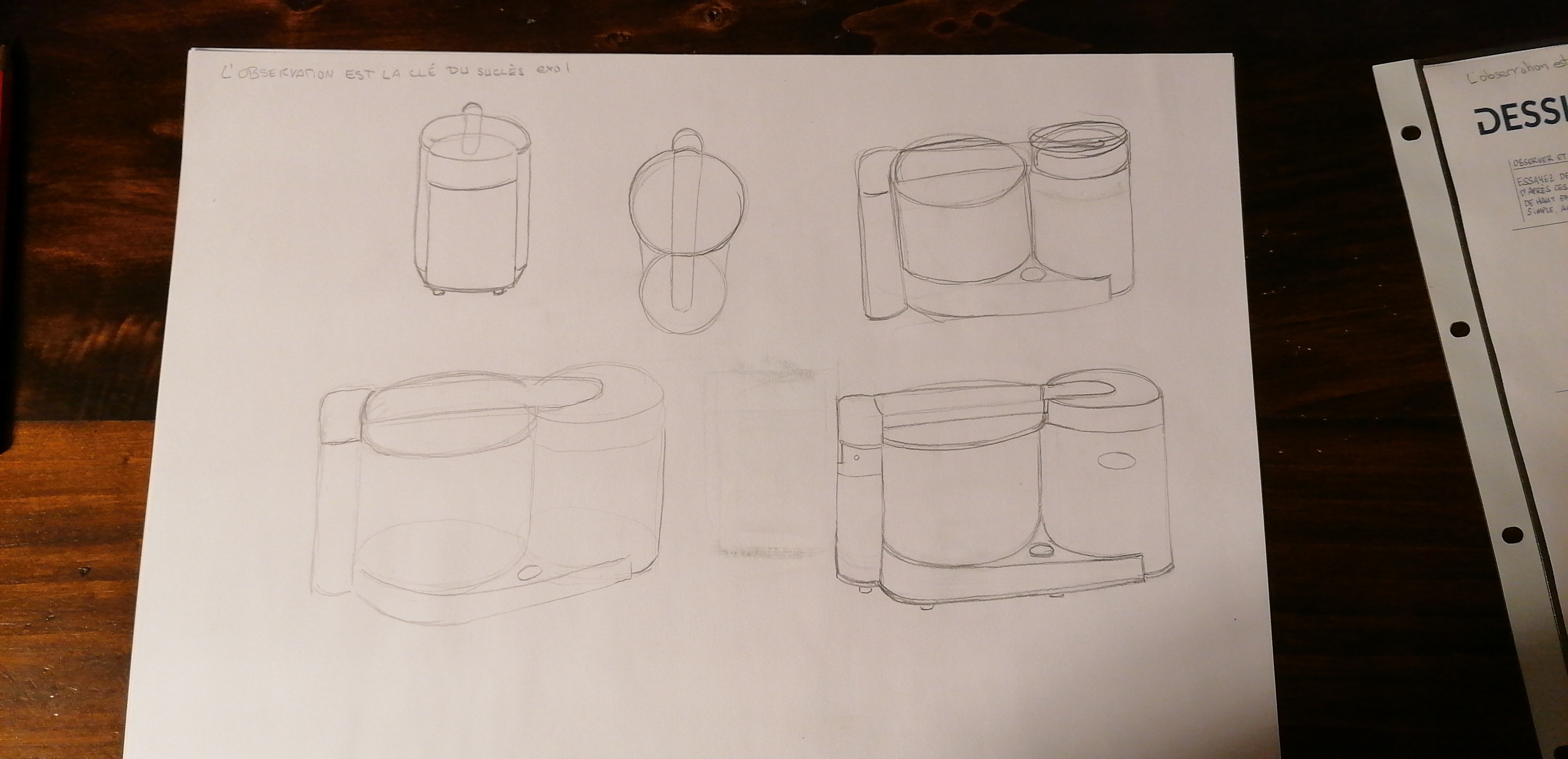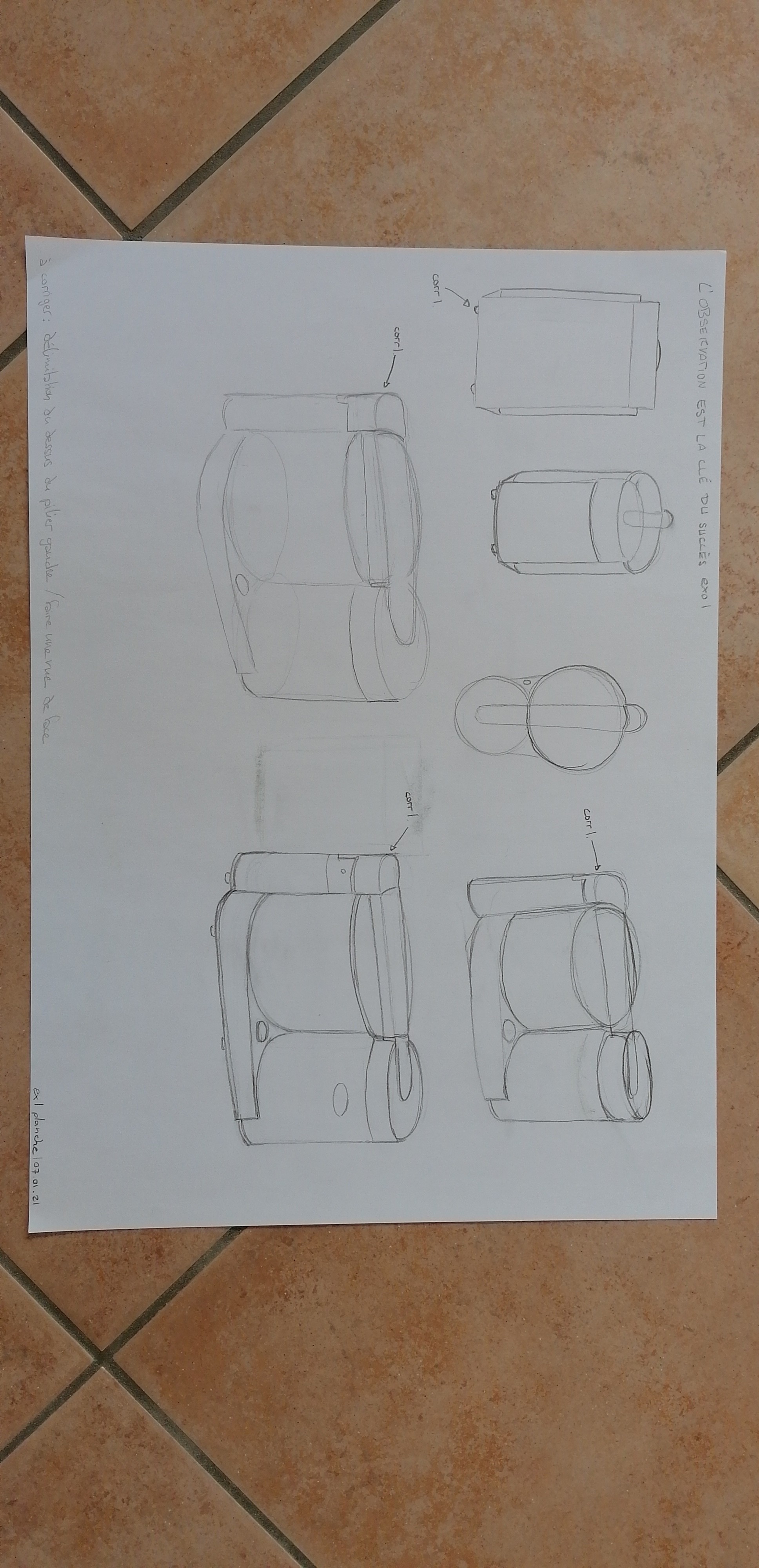 C'est bien tout ça ! N'oublies juste pas la délimitation du dessus du pilier sur la gauche pour tes vues en perspective. EN haut à gauche ta vue est toujours un peu de dessus, il serait intéressant de faire des vues vues bien "de face" avec le regard au milieu de l'objet. On n'en verrait donc plus le dessus et ce genre de vues est utile pour se faire une planche de référence. Je te mets un petit tuto avec l'exemple d'un verre. Bon travail sinon :)