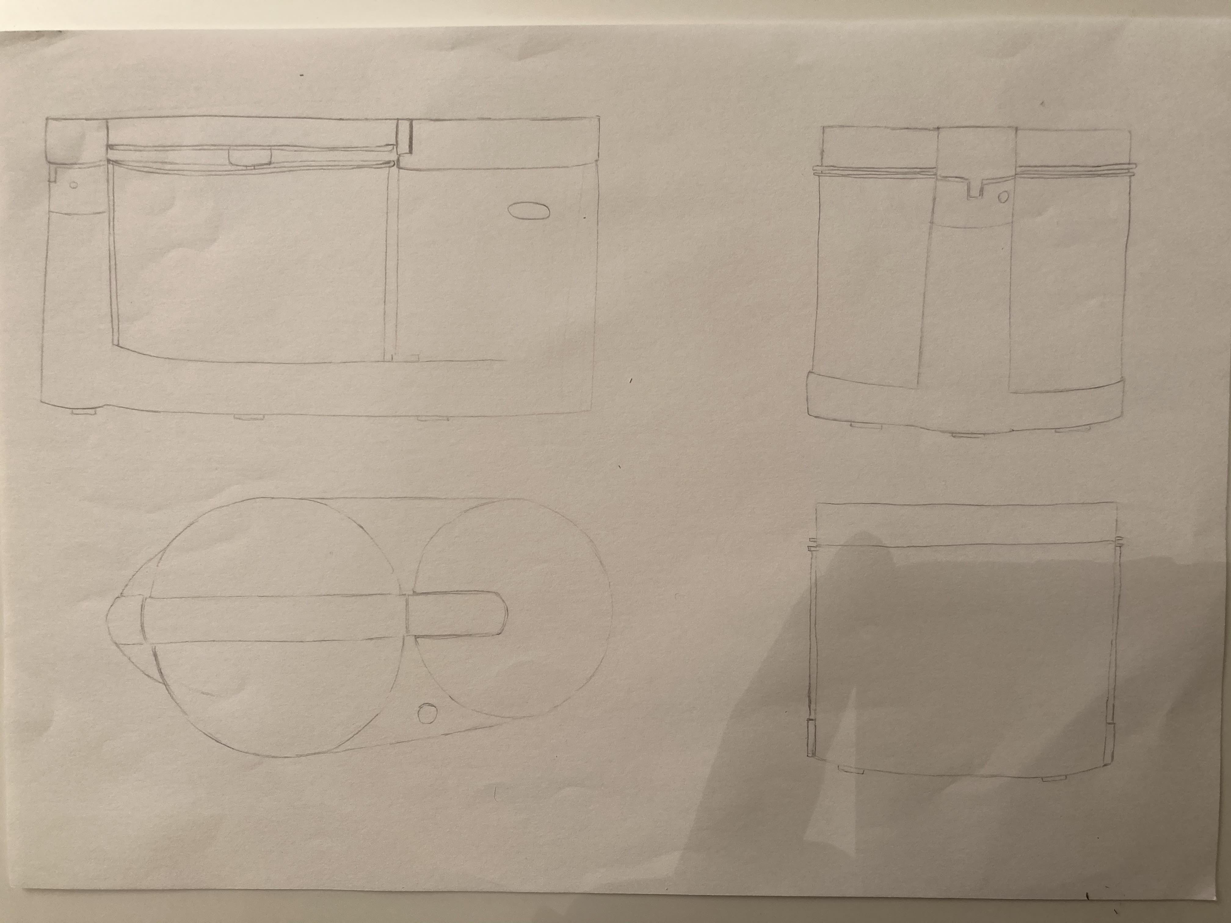 C'est du bon travail :) Tu as oublié la délimitation du socle sur tes vues en faut à gauche et en haut à droite. Attention à ton gros cylindre qui est trop haut dans toutes tes vues, la barre du dessus doit pouvoir passer au dessus. Ce n'est que dans le second cylindre plus fin qu'elle lui rentre dedans, ce qui lui permet d'être plus haut. Sur ta vue en bas, pas besoin de faire rentre le socle dans les cylindre, de ce point de vue bien en face on ne voit qu'un rectangle bien droit, qui d'ailleurs s'arrête à la moitié du deuxième cylindre. Prend bien le temps d'observer les détails ;) En tous cas le principe des vues est compris 😉