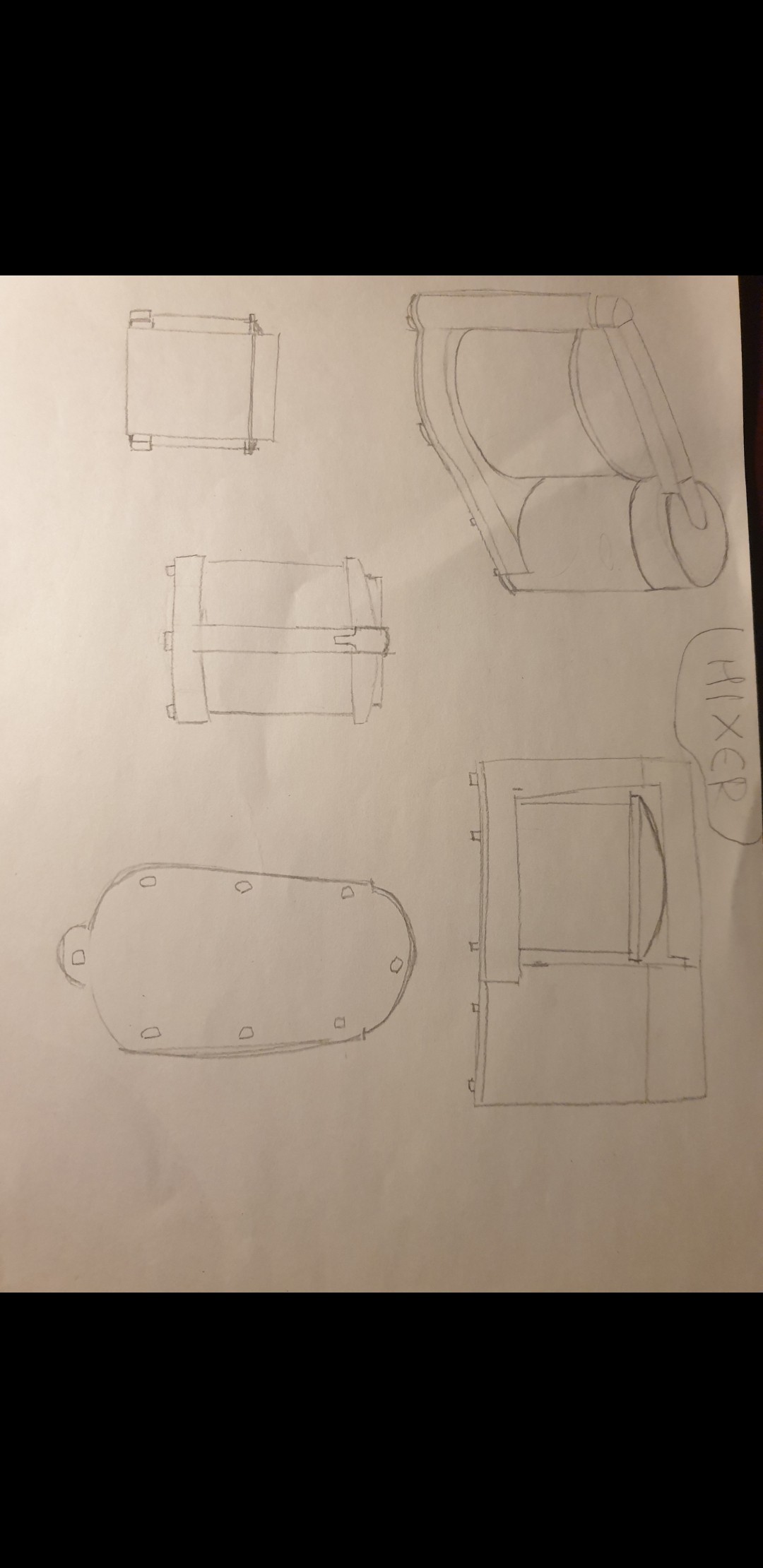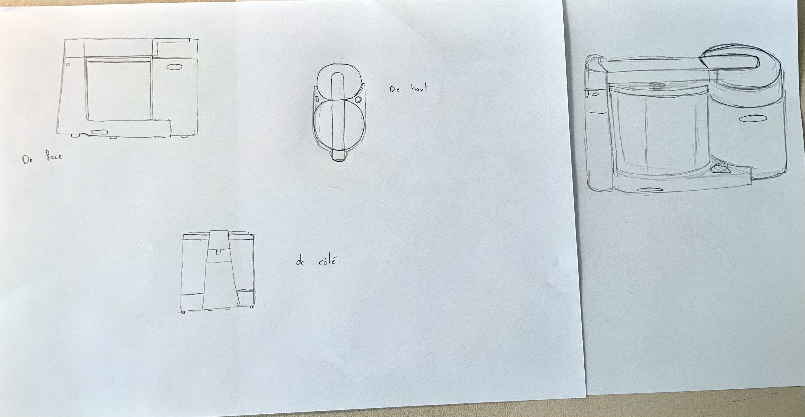C'est effectivement un peu clair, mais je pense voir suffisamment ^^ La vue de dessus est comprise ! Pour la vue en haut à droite (en mettant la feuille dans le bon sens) et en bas au milieu, je ne vois pas la délimitation du socle. Pour celui au milieu en bas, le gros cylindre devrait être un peu plus bas (au niveau de la ligne du pilier), pour laisser voir le haut du plus petit cylindre derrière. Même chose pour la vue en bas à gauche. Ah et je remarque que tu as fait pareil sur la vue en perspective. En fait, avec l'épaisseur de la barre sur le dessus, le premier gros cylindre est forcément plus bas, tandis que le deuxième est plus haut vu que la barre lui rentre dedans. Il n'a donc pas à être sous son épaisseur. J'espère que ça sera plus clair ! En tous cas c'est du bon travail :)