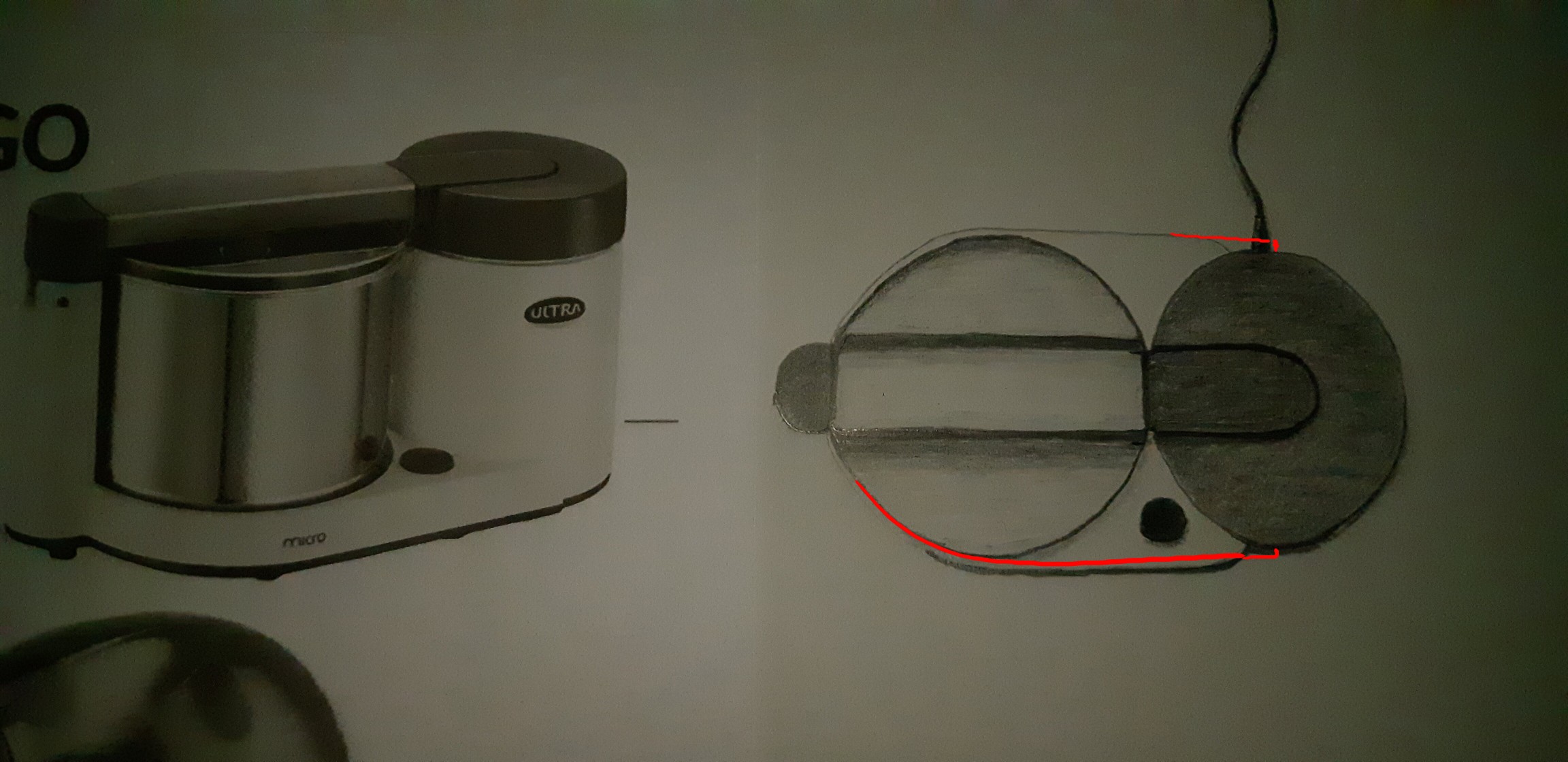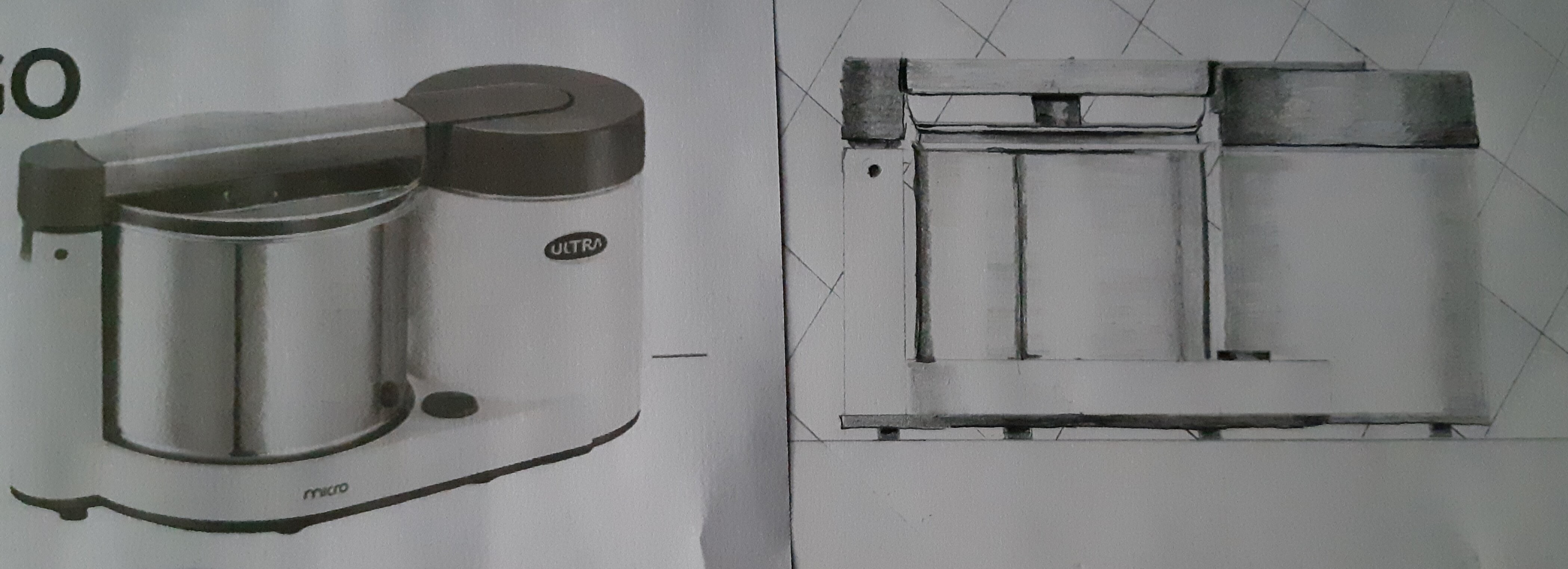 A gauche c'est un dessin ou juste la photo en noir et blanc ? Si c'est un dessin c'est très très bien fait x) Pour le dessin à droite, il est bien, mais il y a quelque chose que tu as mal compris au niveau du gros cylindre du robot. Tu as mis une espèce de barre transparente sous la barre du dessus du robot. Cette barre n'existe pas, tu l'as confondue avec l'ombre de la barre sur le couvercle du cylindre. En observant bien sur les côtés du cylindre, on remarque qu'il remonte jusque pile sous la barre, en vrai c'est quasi collé. Donc ton cylindre n'est pas assez haut. En tous cas très joli rendu des valeurs de gris ^^