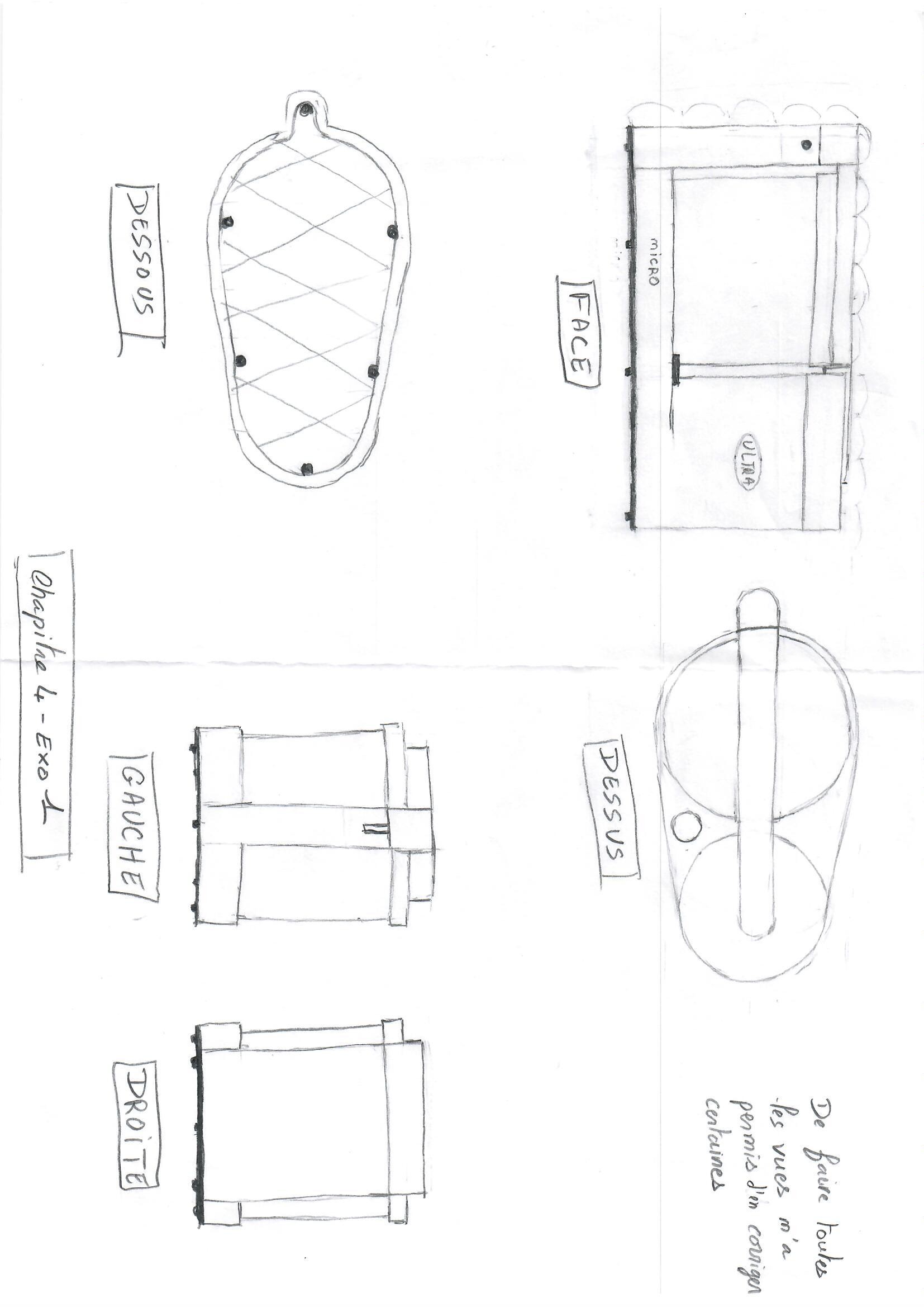 C'est du bon travail, la structure est comprise ! Attention on veut des vues bien "en face", donc la première vue en haut à gauche et celle en haut à droite sont trop vues de dessus, on ne devrait pas voir le dessus des couvercles ou du socle, comme sur la vue du milieu où ça a été bien fait :)