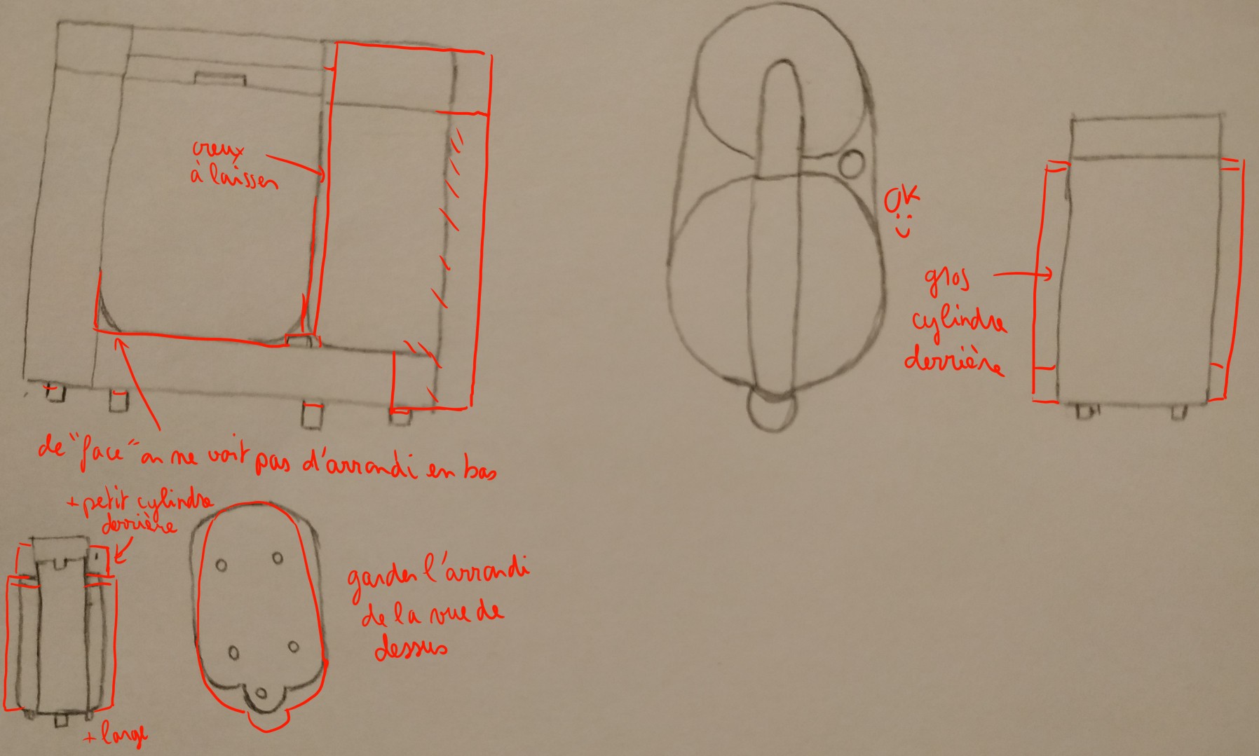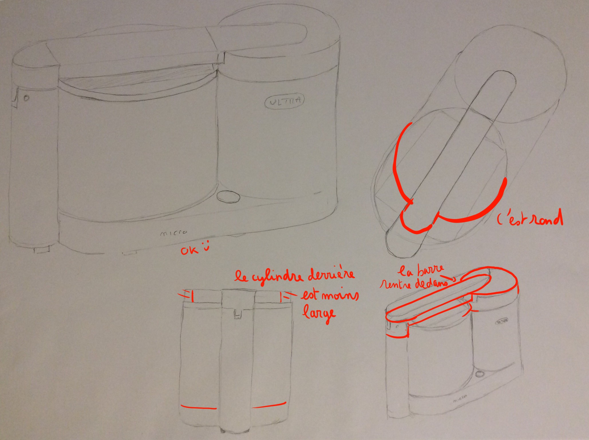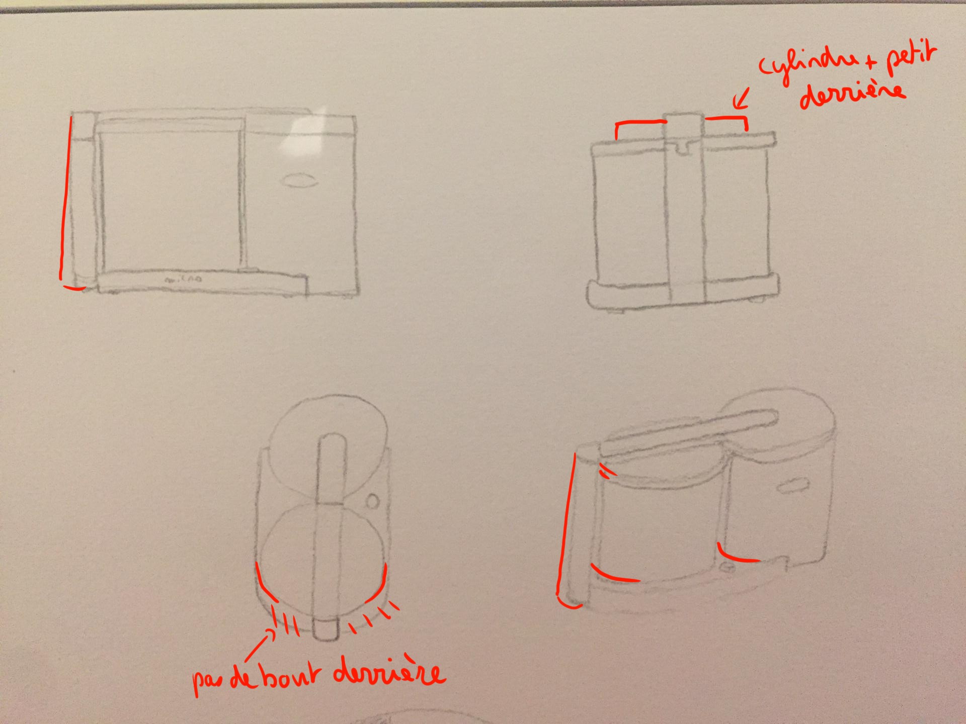 Désolée pour l'attente. La construction de ce robot est bien comprise :) J'ai juste fait quelques annotations. Les vues en perspective montrent aussi une bonne compréhension de l'objet, la perspective sera plus travaillée dans les prochains cours, l'important ici sont les vues 2D ^^ Beau travail en tous cas !