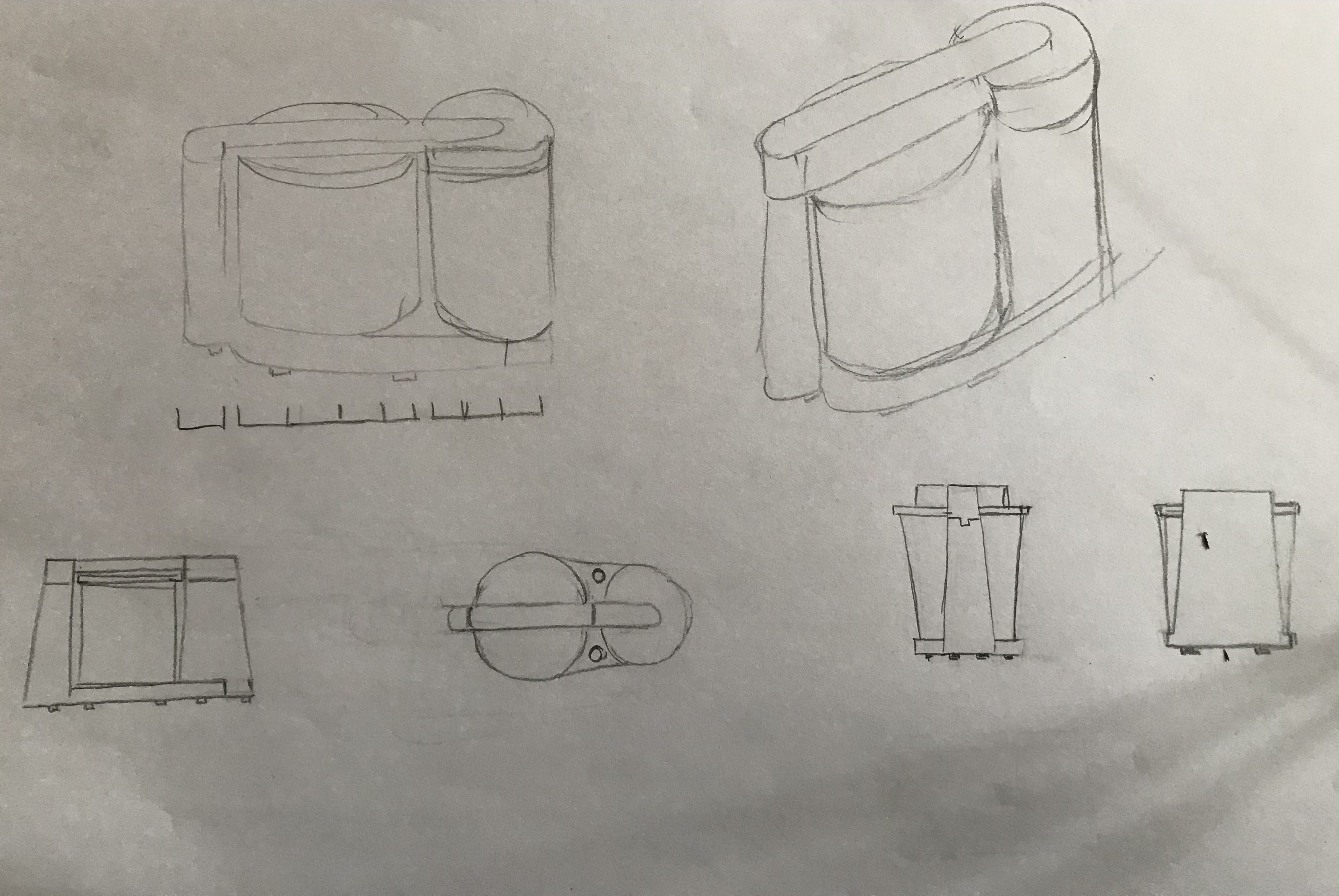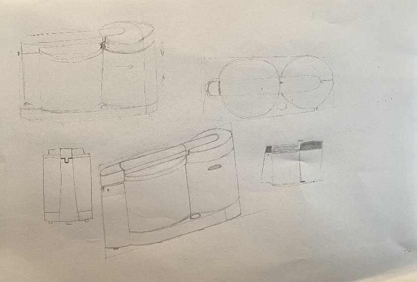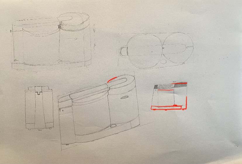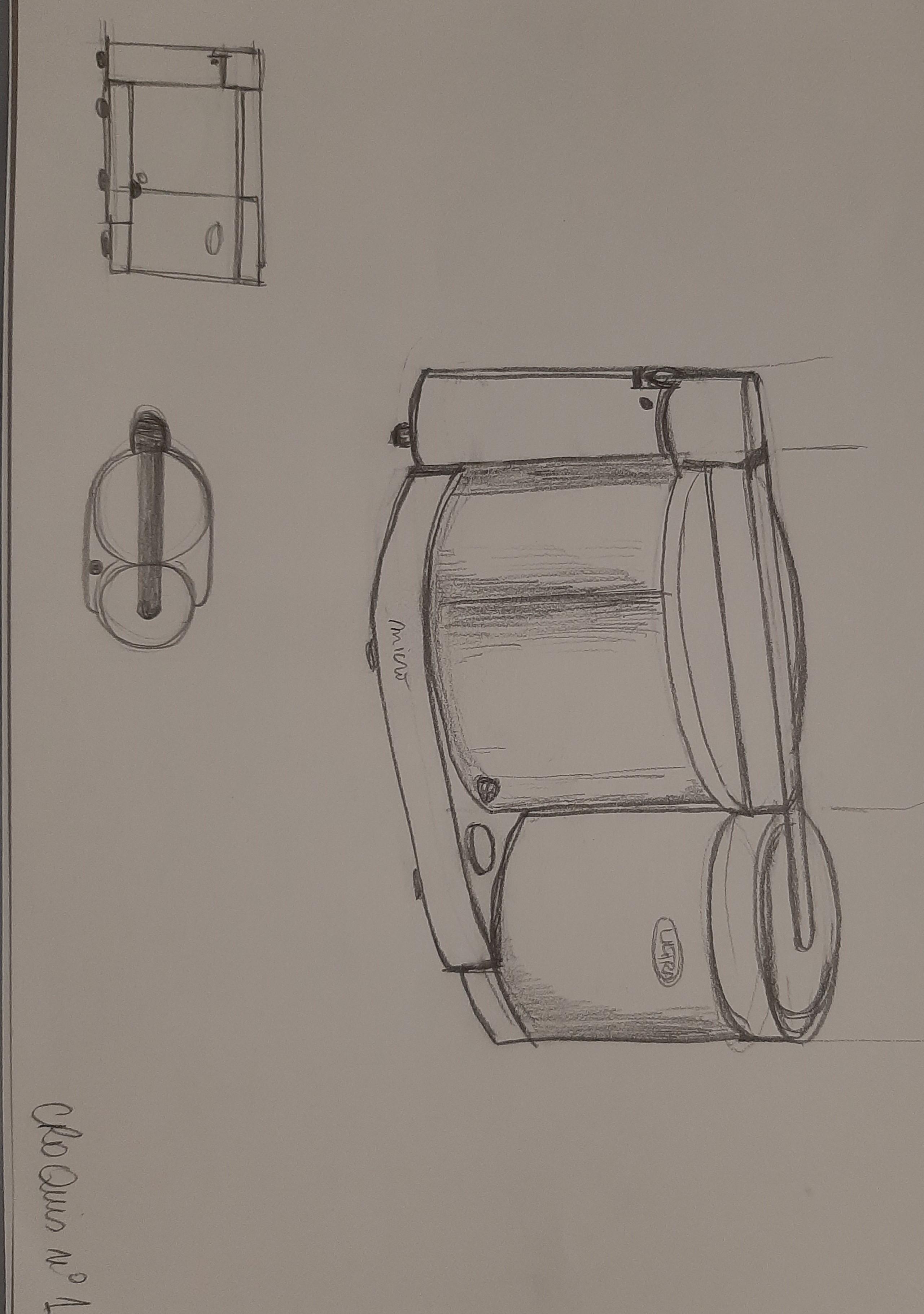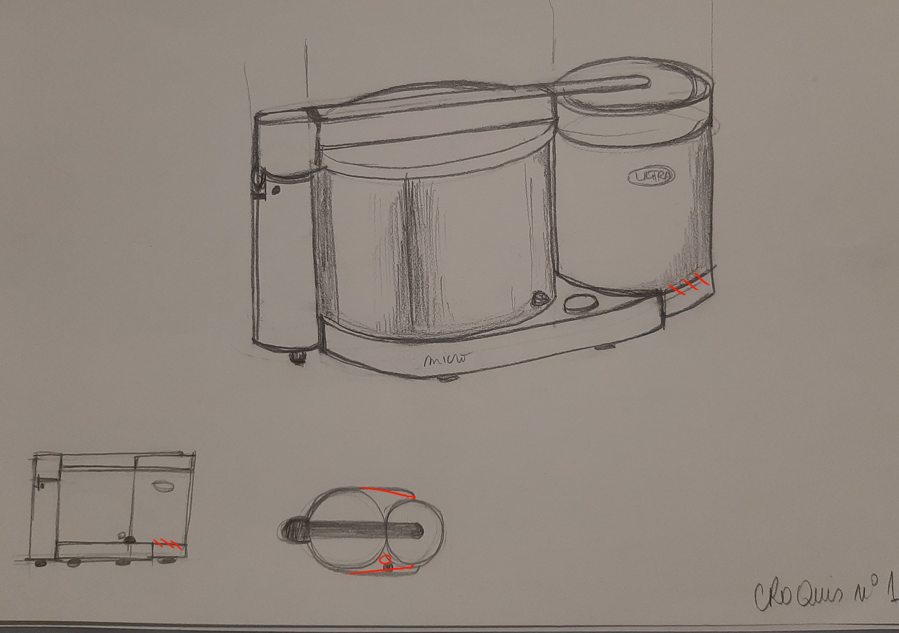 Désolée pour l'attente. La construction de ce robot est bien comprise :) J'ai juste fait quelques annotations. Les vues en perspective montrent aussi une bonne compréhension de l'objet, la perspective sera plus travaillée dans les prochains cours, l'important ici sont les vues 2D ^^ Beau travail en tous cas !