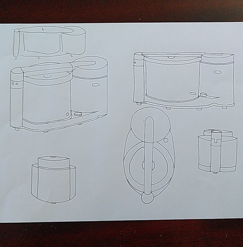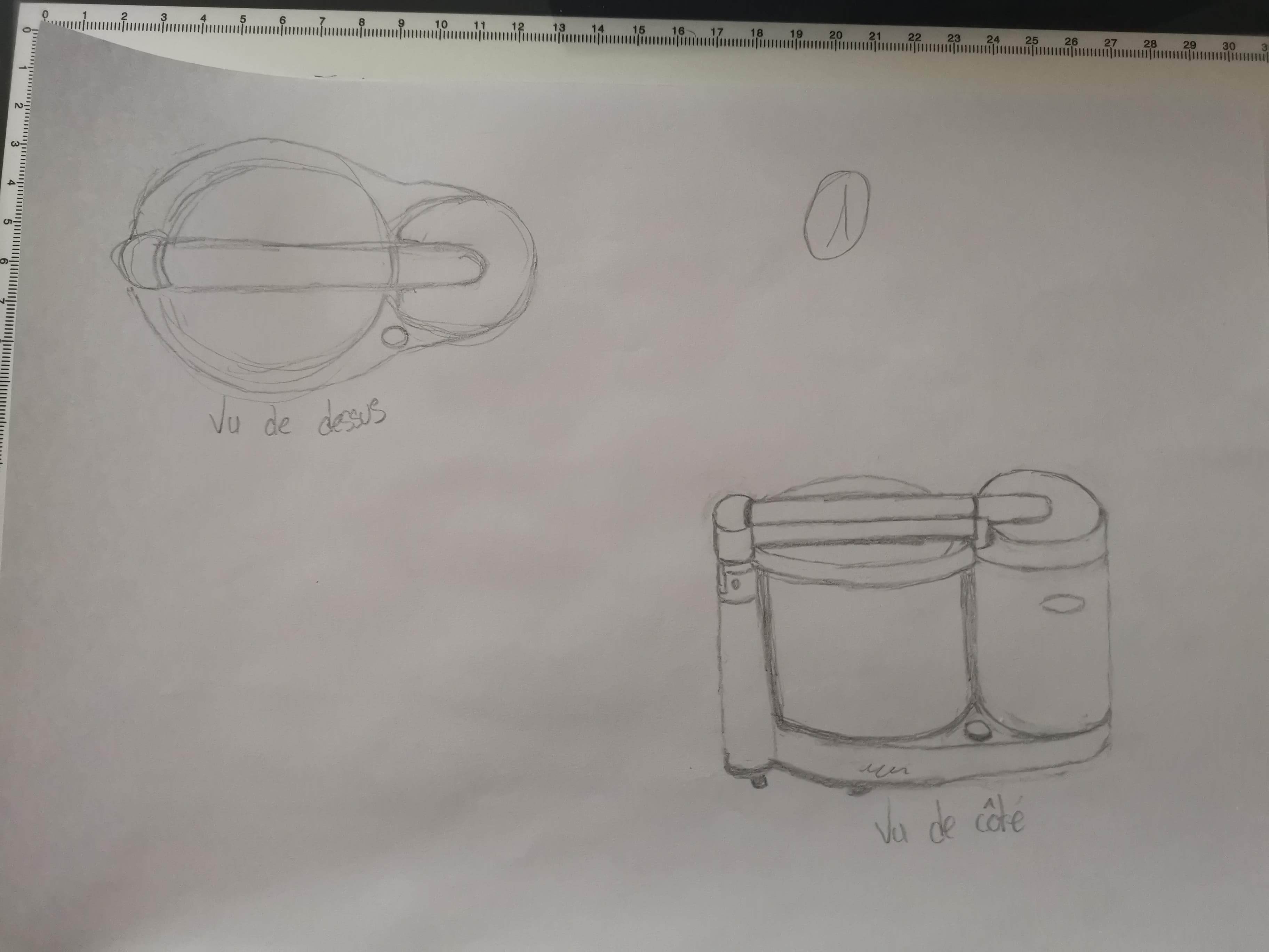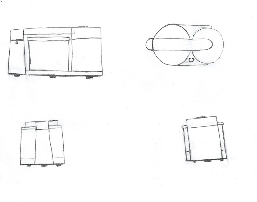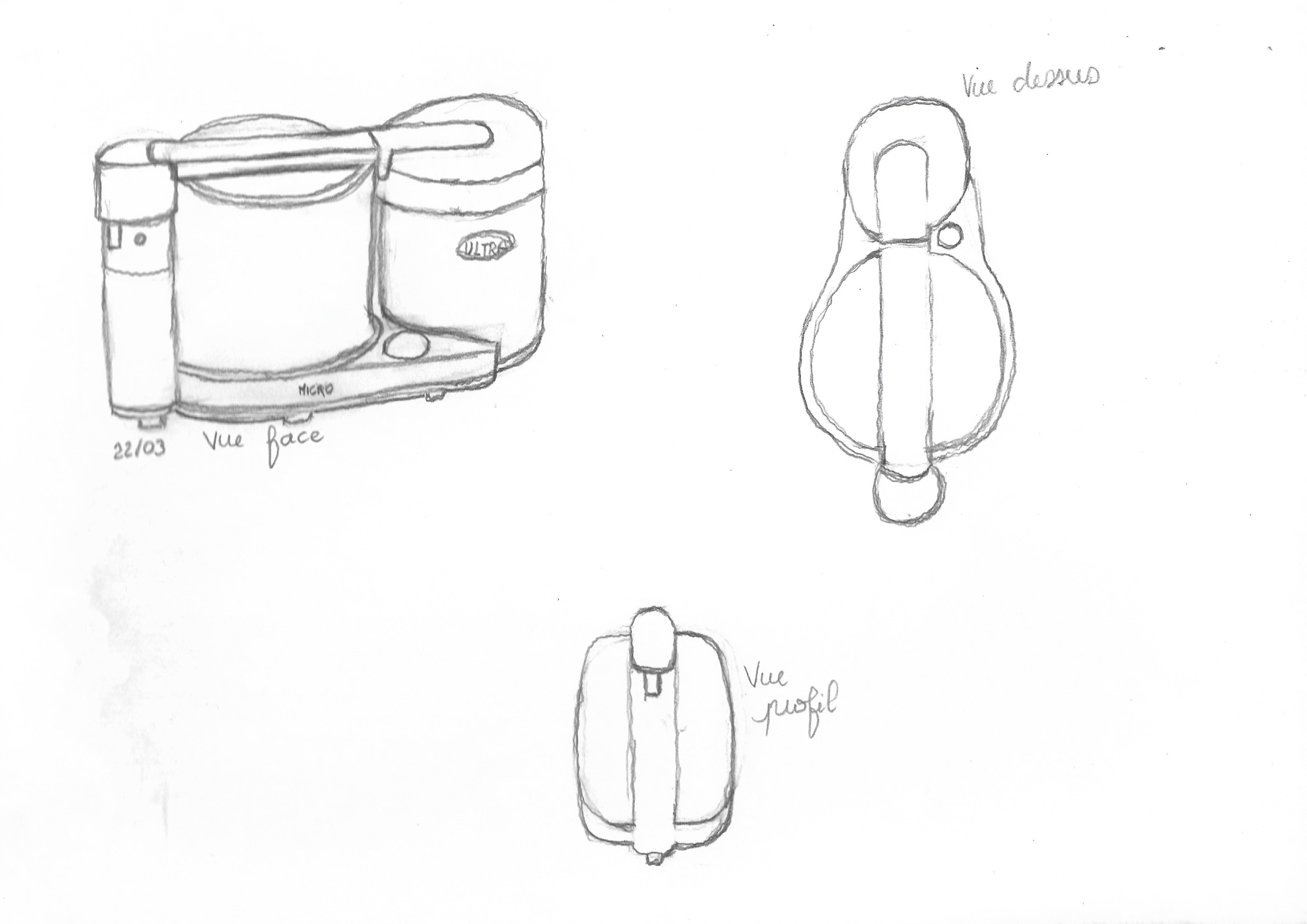 Voici le premier exercice sur le robot électroménager. C'était la première fois que j'essayais d'imaginer un objet sous différents angles, c'était difficile mais j'ai réussit à la représenter différemment : de profil, de face, de dos, au-dessus. J'ai d'abord fait le dessin au crayon à papier, puis j'ai utilisé ma nouvelle tablette lumineuse et des feutres noirs pigma pour mettre au propre l'ensemble pour que cela soit plus clair.