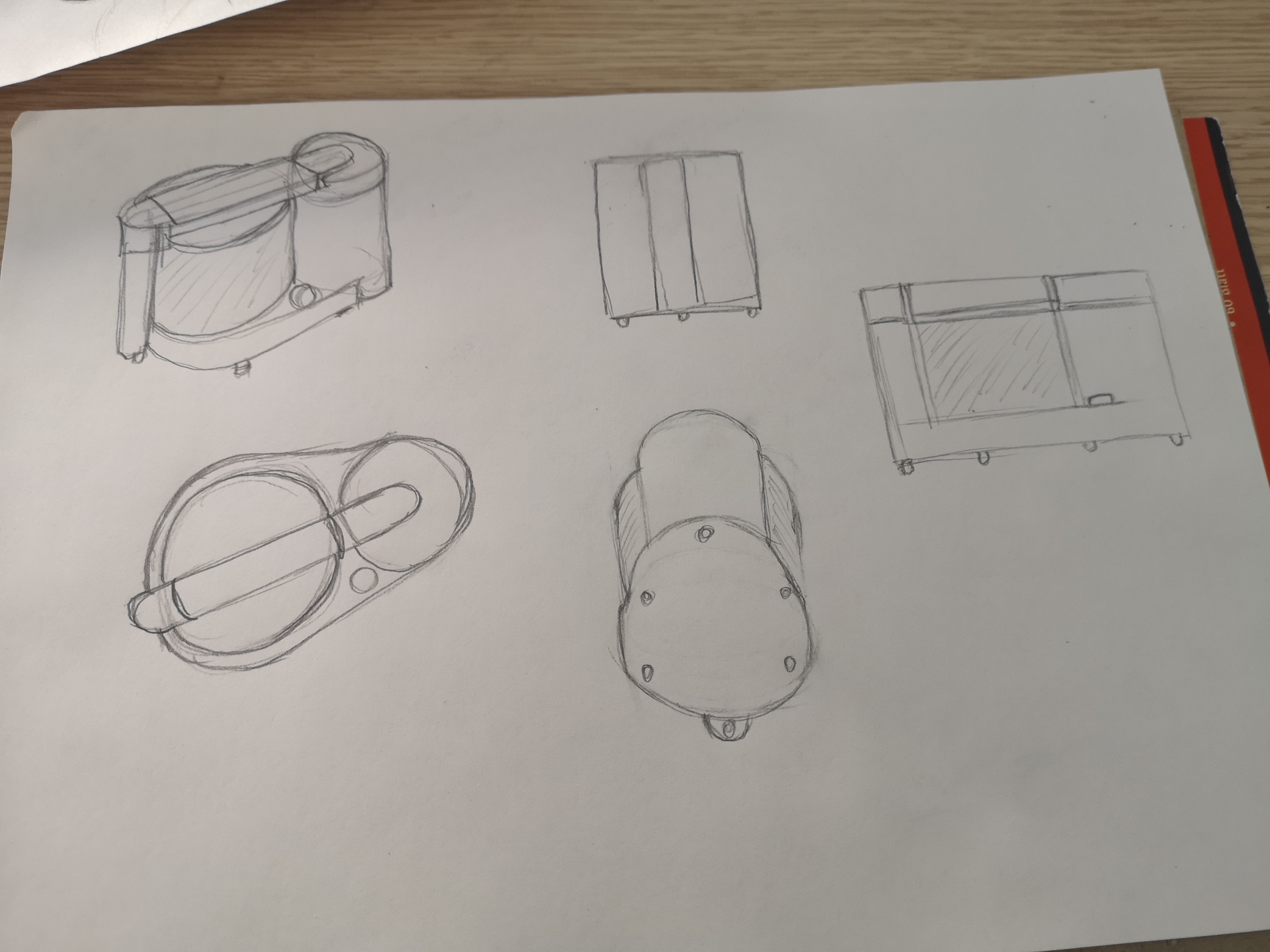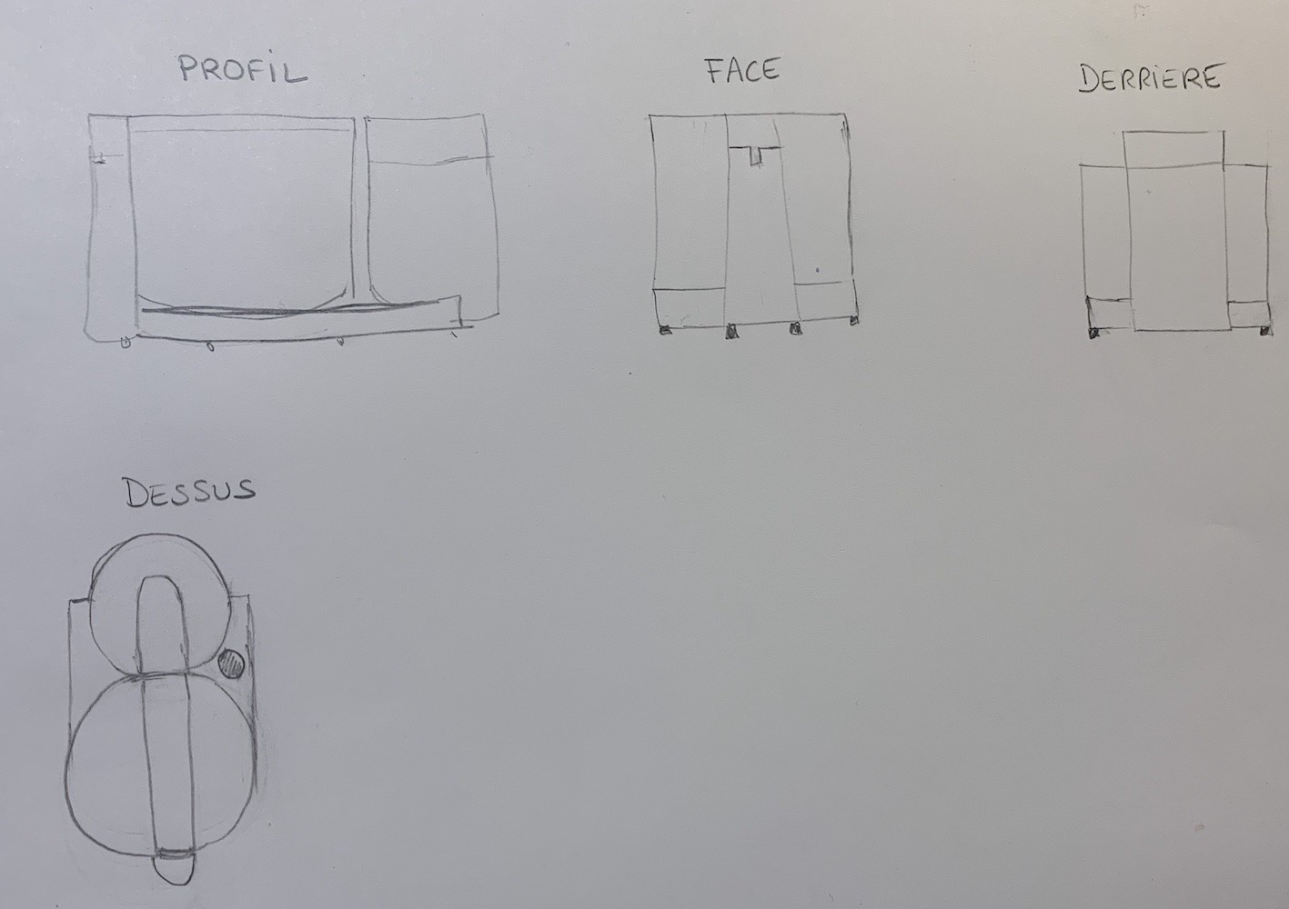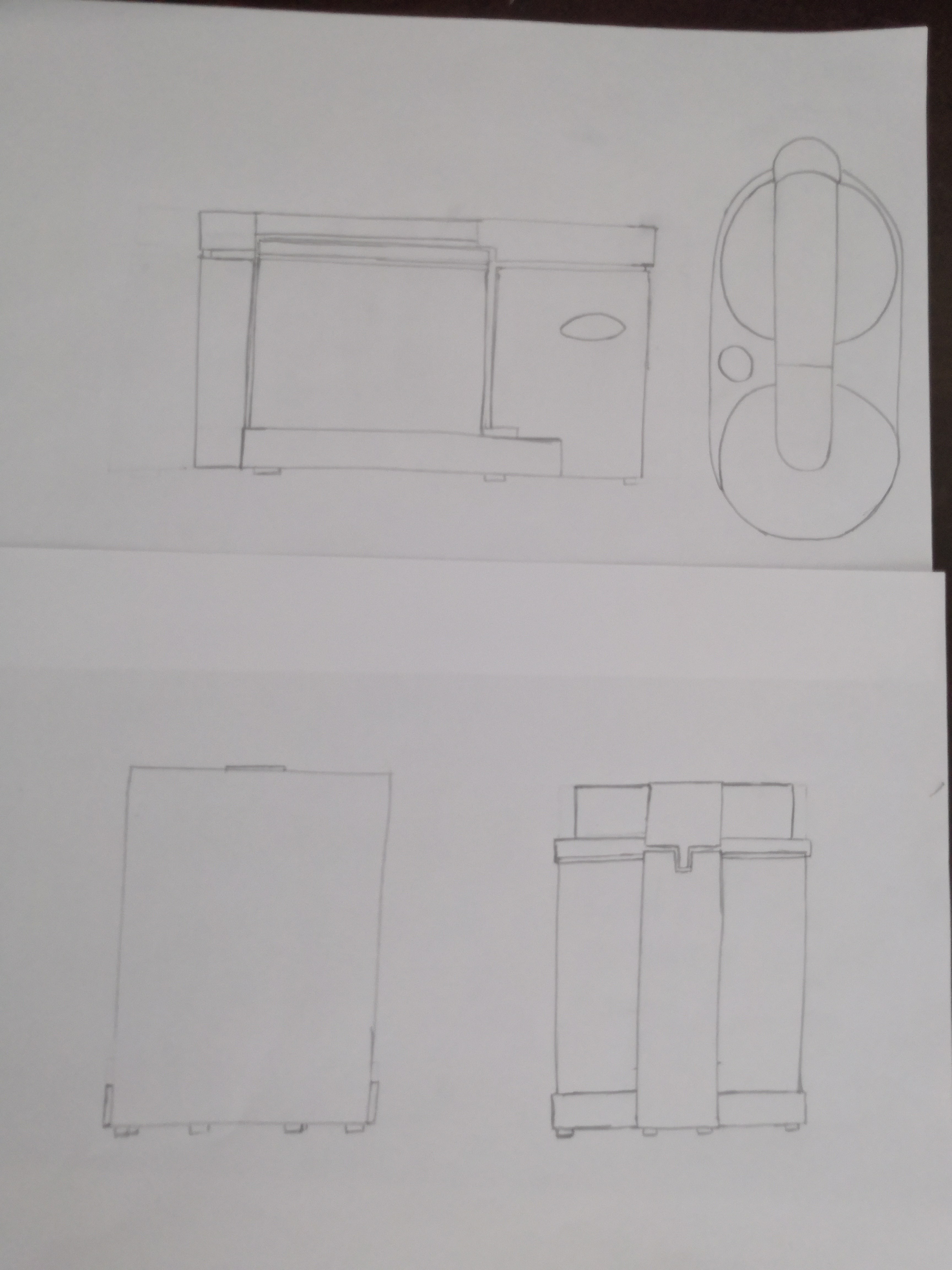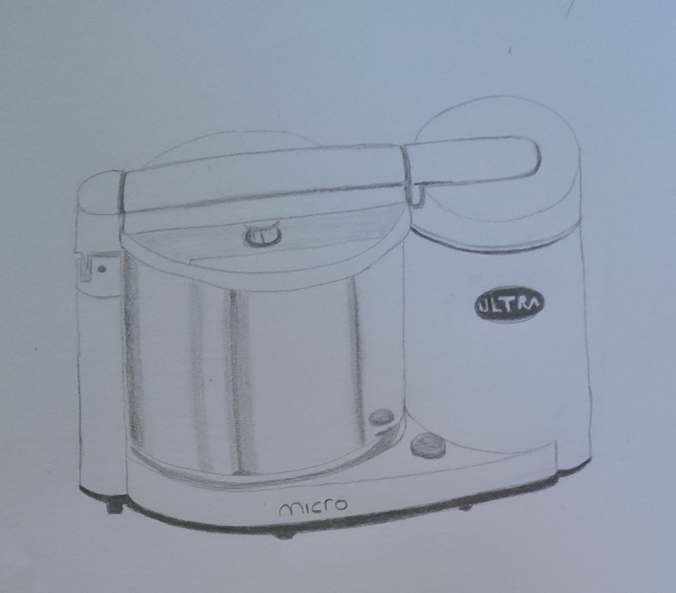 Voici le premier exercice sur le robot électroménager. C'était la première fois que j'essayais d'imaginer un objet sous différents angles, c'était difficile mais j'ai réussit à la représenter différemment : de profil, de face, de dos, au-dessus. J'ai d'abord fait le dessin au crayon à papier, puis j'ai utilisé ma nouvelle tablette lumineuse et des feutres noirs pigma pour mettre au propre l'ensemble pour que cela soit plus clair.