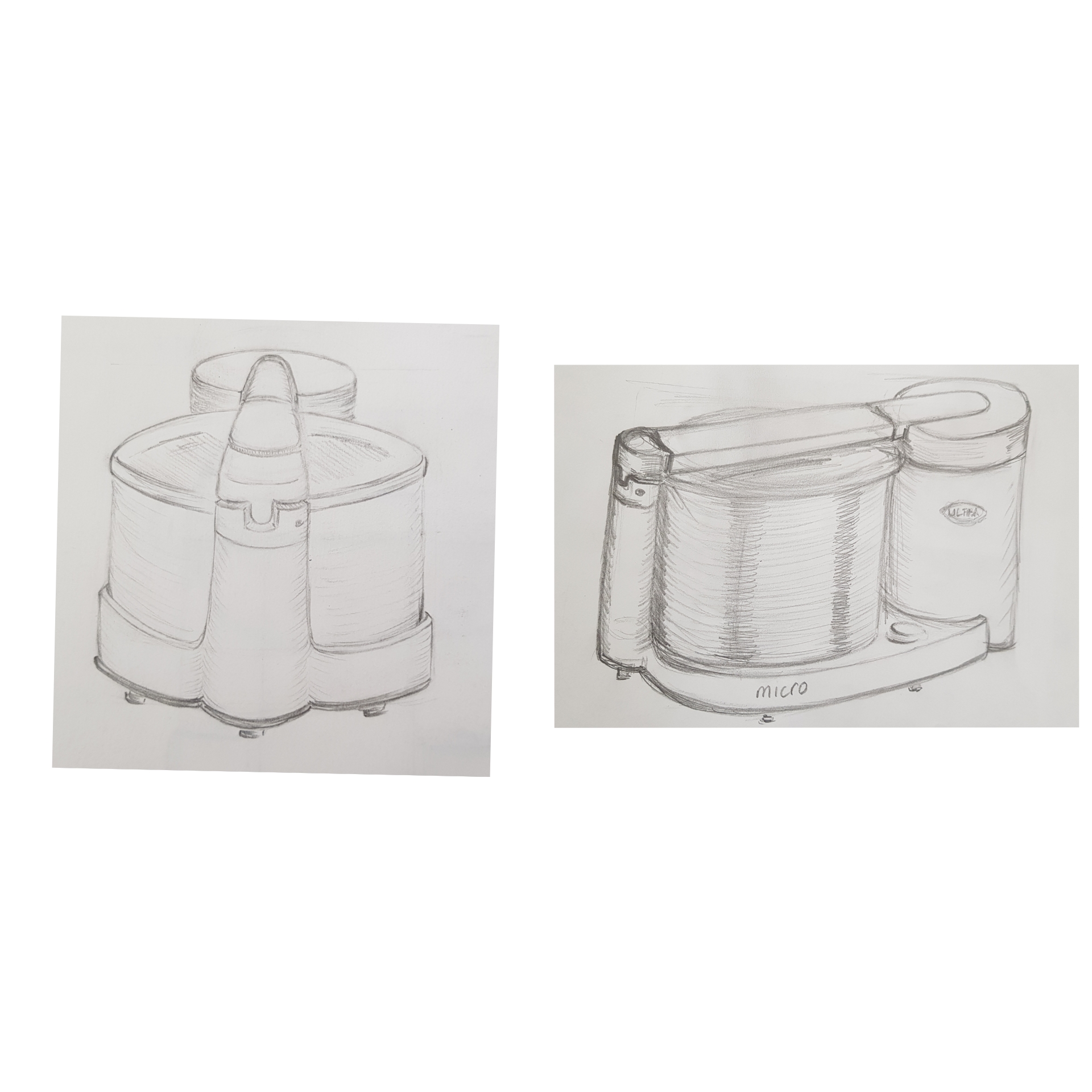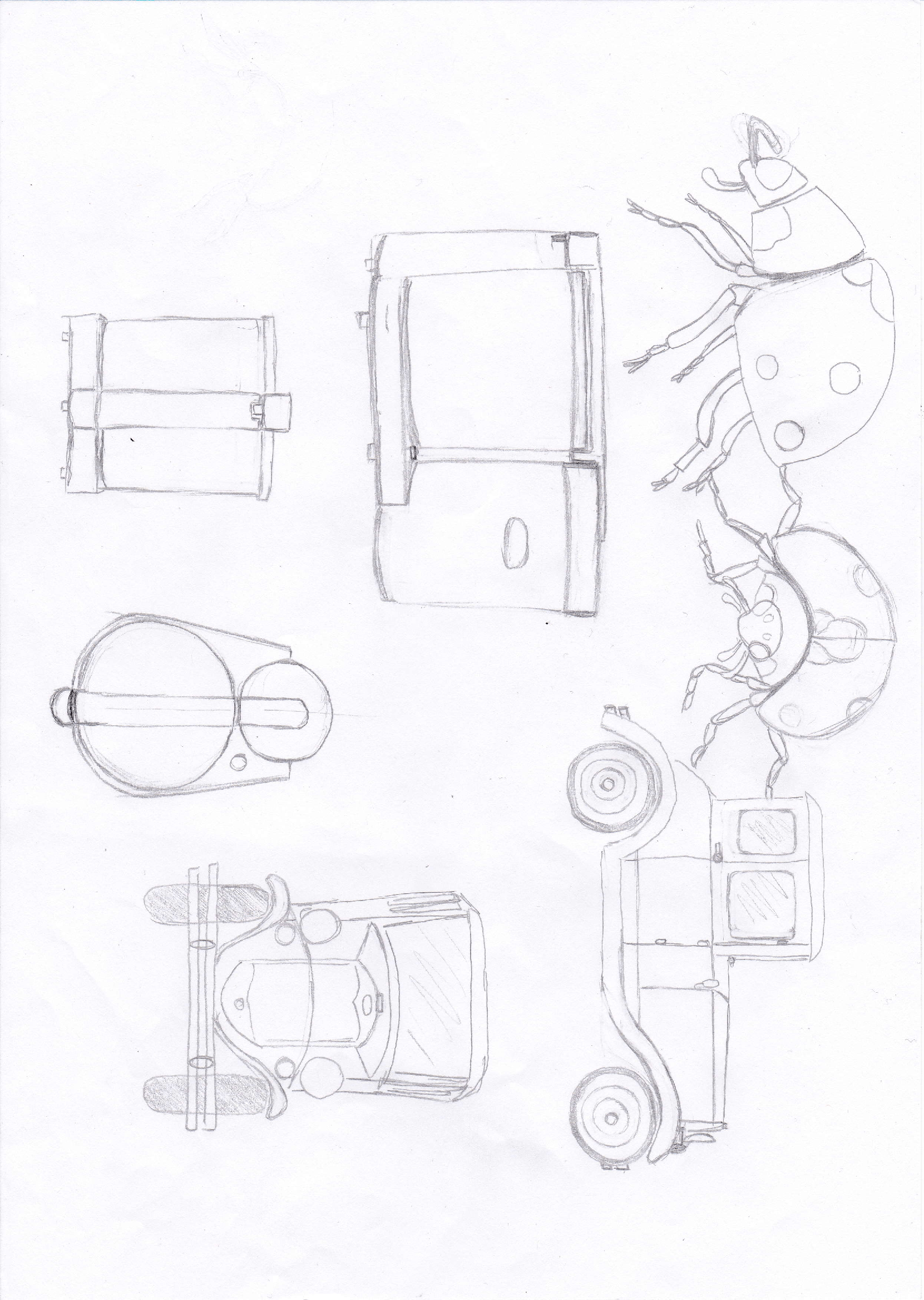Voici le rendu de mon exercice. J'ai essayé de faire 4 vues et de ne pas utiliser de règle (je ne sais pas trop pourquoi je me suis dis "tout à main levée", du coup les lignes ne sont pas du tout parallèles). Un peu de mal avec la petite perspective surtout pour les formes arrondies.